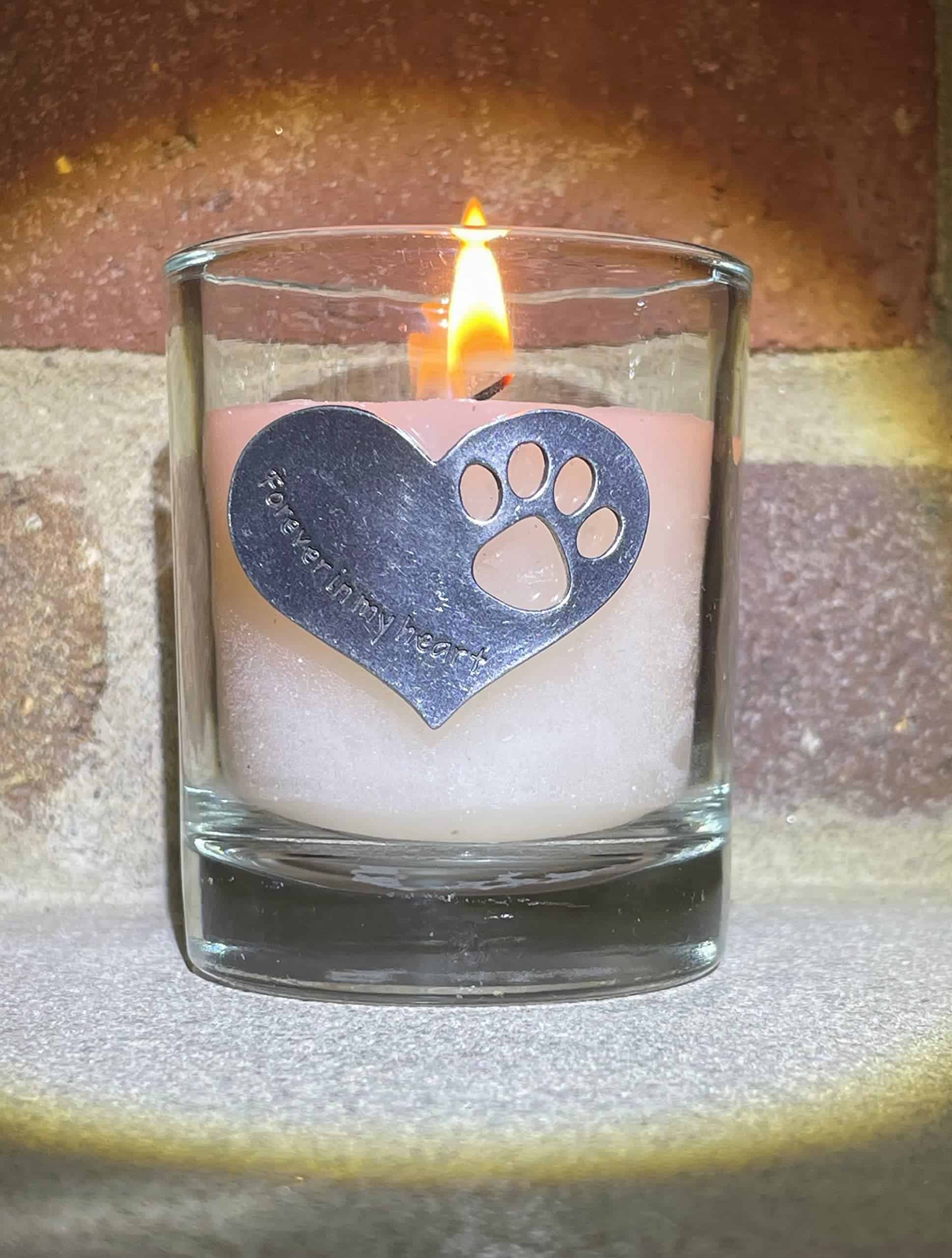 Esta vela votiva de soja está decorada con una placa de peltre hecha a mano que dice «Siempre en mi corazón» con una huella de pata. Esto hace un excelente regalo de simpatía o condolencia para un perro, gato, conejo, hámster o jerbo. Tu amigo o ser querido apreciará este regalo conmemorativo durante años.