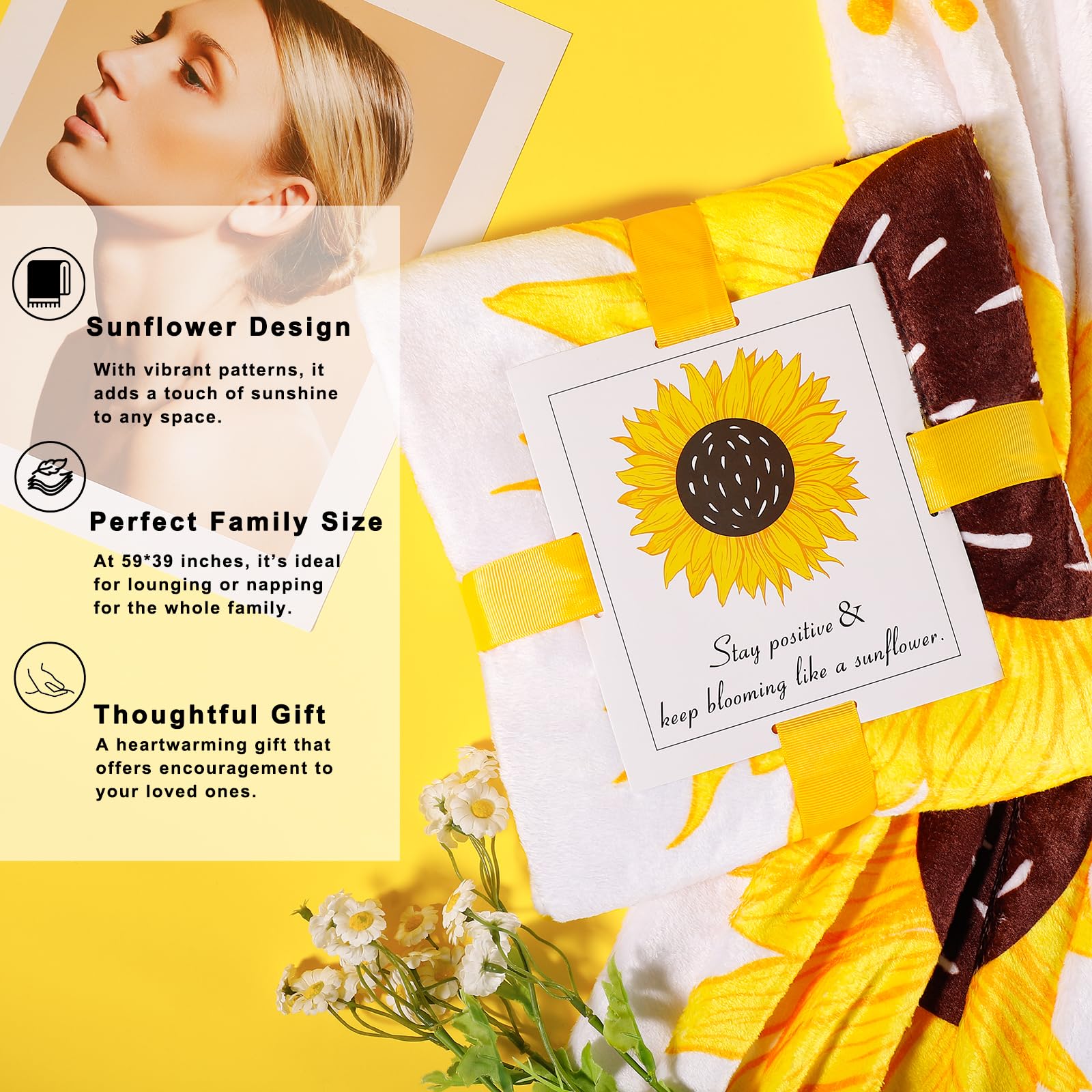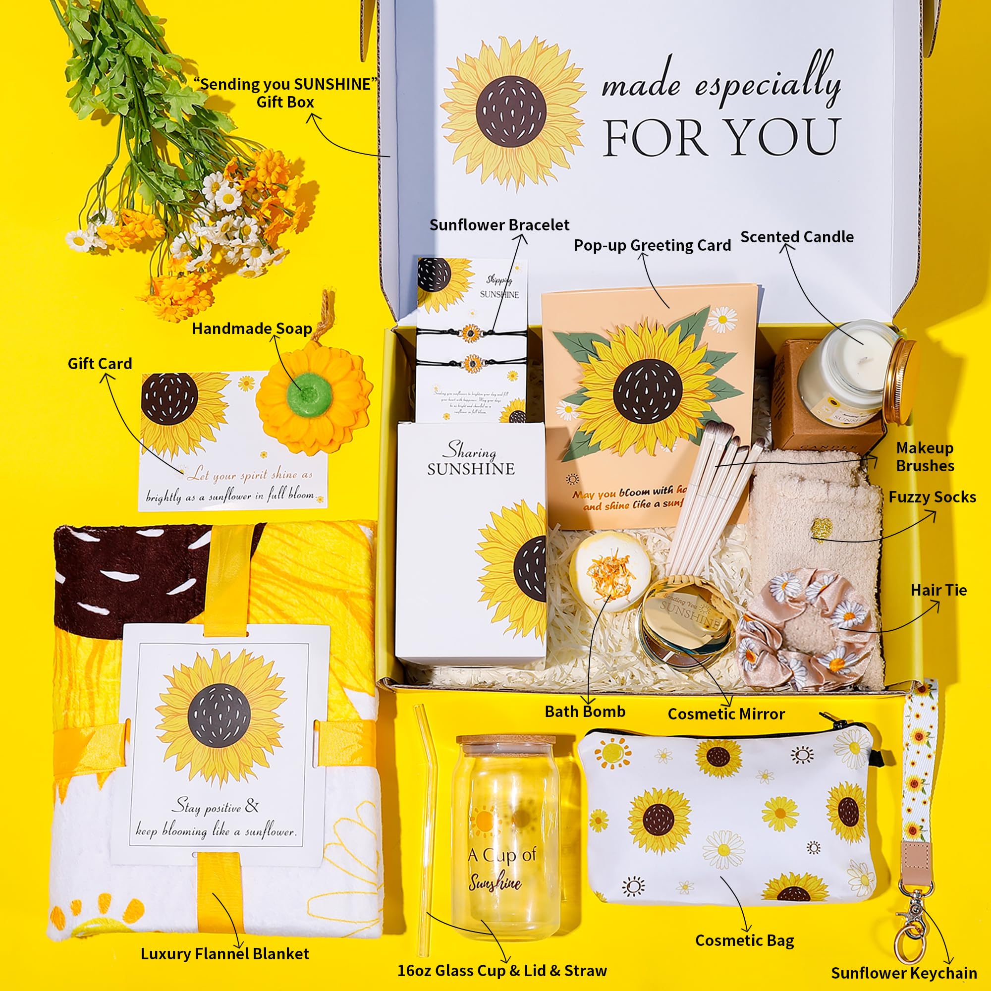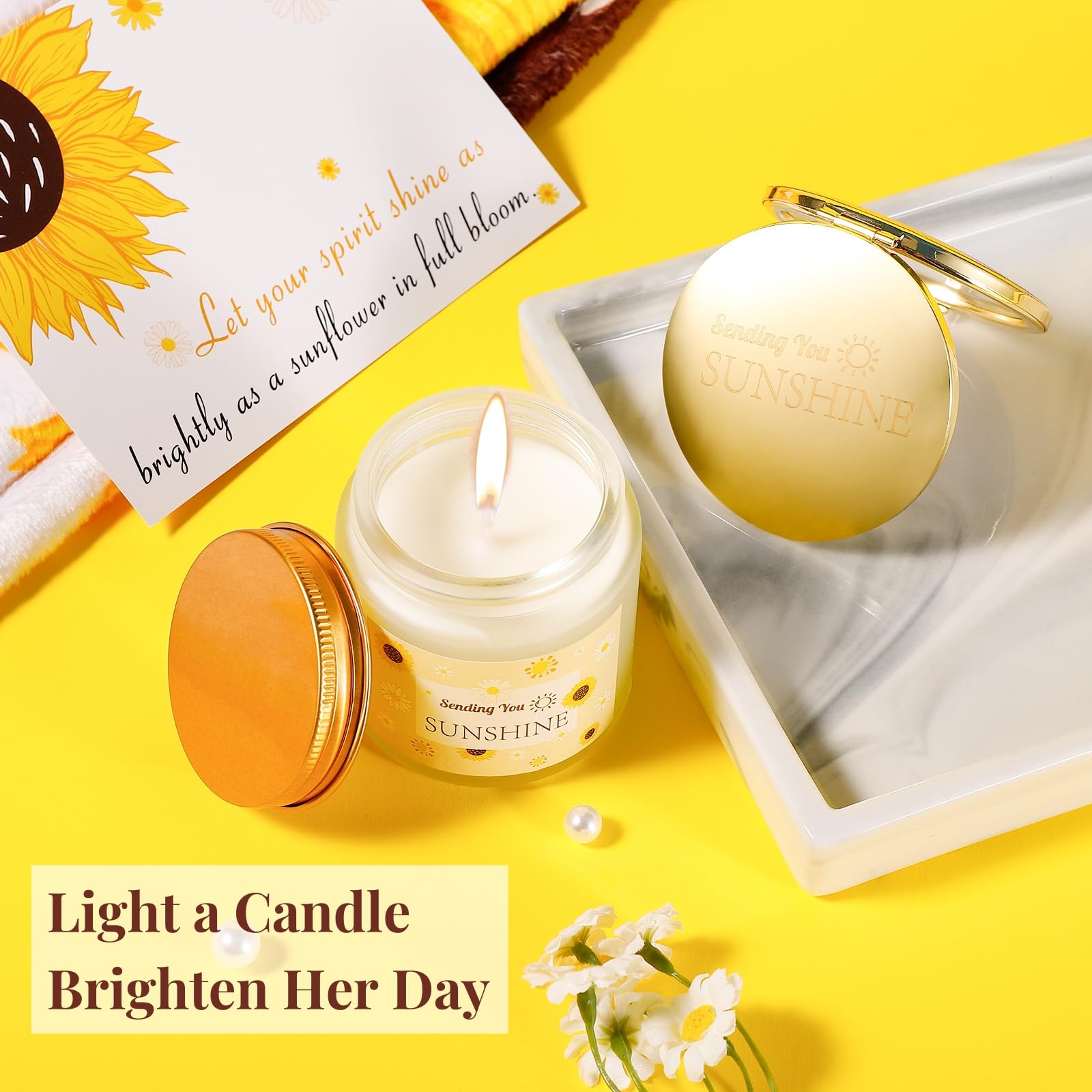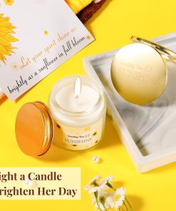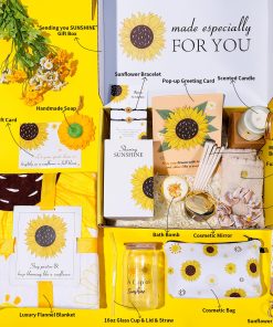 4. Lleno de Diseños Encantadores: Cada artículo de este set está elaborado con creatividad y cariño: desde la manta de girasol personalizada hasta la vela con «Enviándote un Rayo de Sol», el espejo dorado y la tarjeta 3D de girasole, cada pieza aporta su propio toque de calidez. Ya sea para cumpleaños, festividades o momentos de aliento, este set de regalos transmite hermosamente tus sentimientos sinceros.