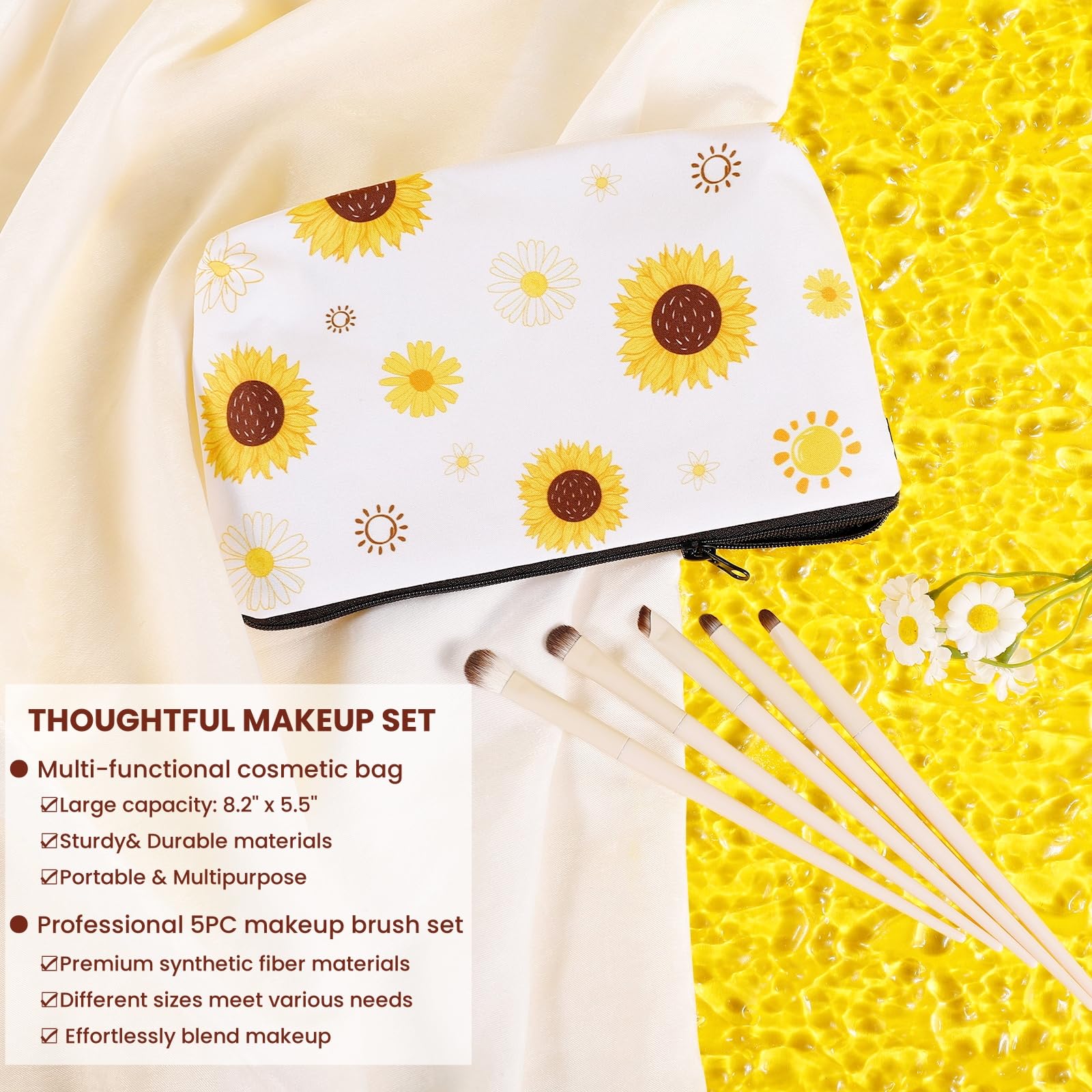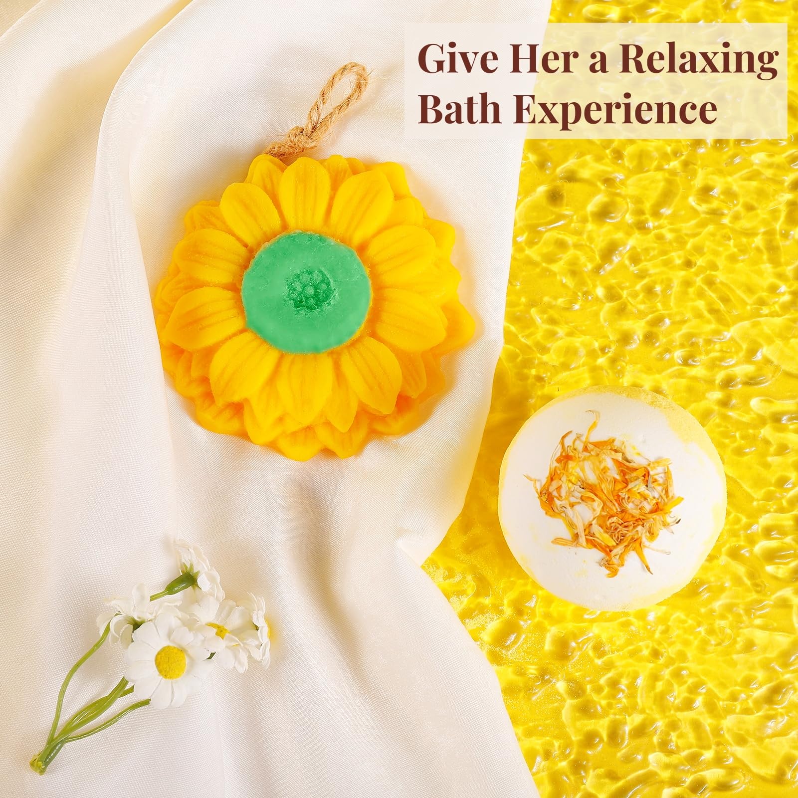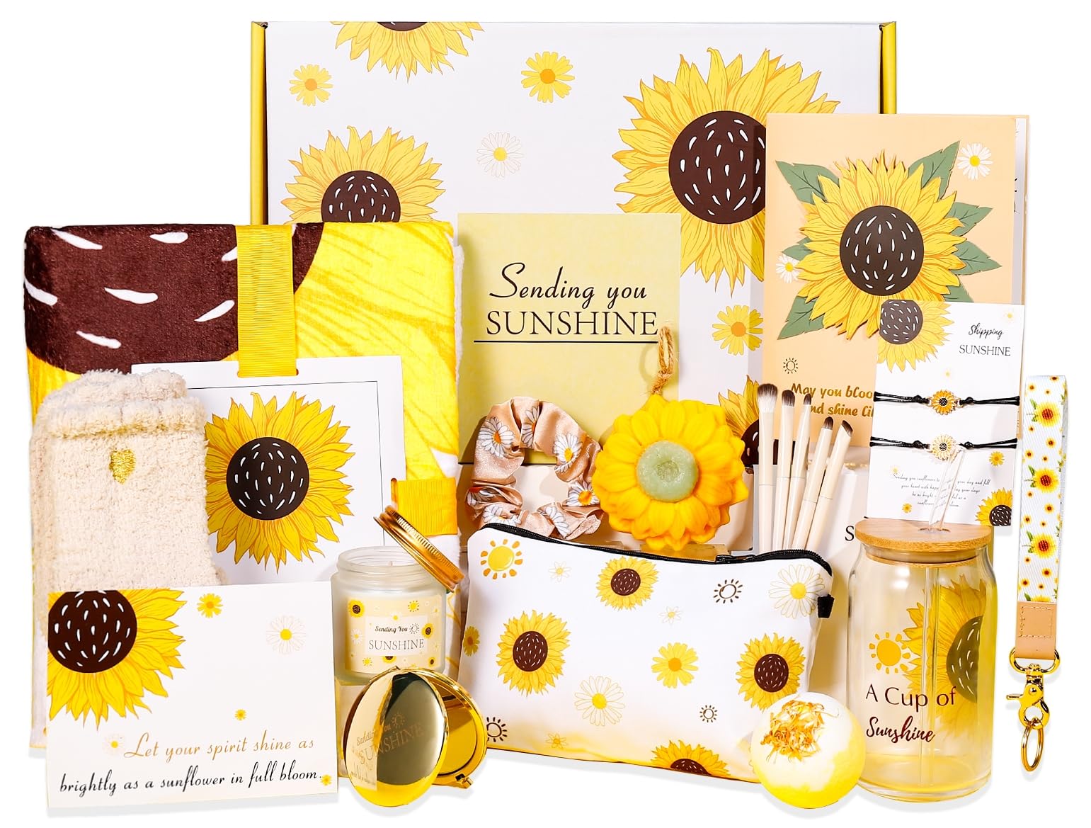 2. Regalos Únicos de 21 piezas: Dentro, encontrarás un vaso de vidrio de 16 oz con estampado de «Una Taza de Sol», una pajita, un jabón de girasol de 3.45 oz, una manta de franela de girasol de 59×39 pulgadas, un elegante neceser, una vela con olor a lavanda de 7.6 oz, un espejo de maquillaje dorado, una bomba de baño, una tarjeta 3D de girasol, cinco brochas de maquillaje, calcetines difusos, una diadema de margarita, dos pulseras de encanto de girasol hechas a mano, un llavero y una tarjeta de regalo. Cada artículo cuidadosamente seleccionado añade calidez y comodidad a su vida cotidiana o momentos especiales.