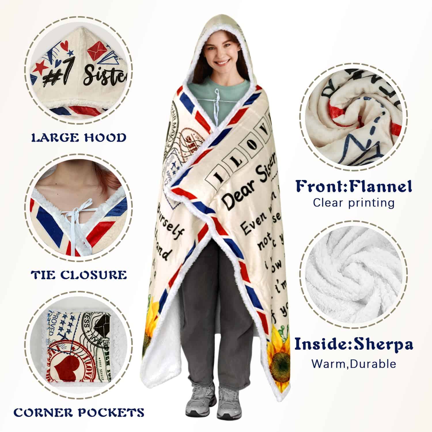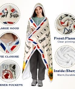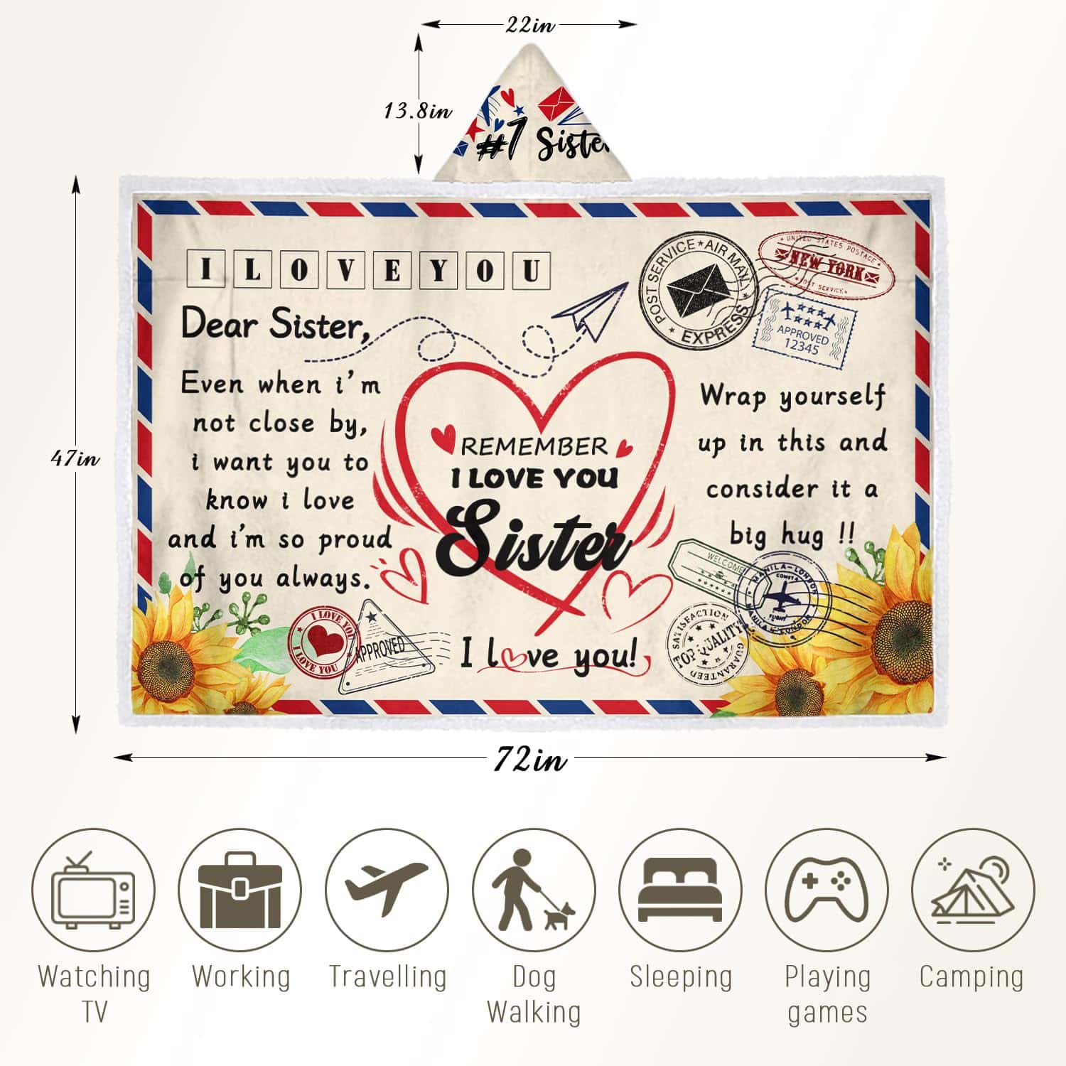 Regalos de Navidad y Cumpleaños para Hermanas,Manta con Capucha para Regalo de Cumpleaños para Hermana,Regalos del Día de San Valentín,Regalos para Hermanas de Hermanas/Hermanos,70.8 X 47.3 pulgadas. Una talla para la mayoría. El tamaño perfecto para varias situaciones. Ya sea que esté descansando en el sofá, viajando en el automóvil o acurrucándose en la cama, está diseñado para mantenerla cómoda y abrigada durante todo el año. También se puede usar como una manta. Regalos para Hermana: Regalos de Navidad/Regalos del Día de San Valentín/Regalos de Aniversario de Bodas para Hermana, Impresos hermosamente con el texto: Querida Hermana, aunque no esté cerca, quiero que sepas que te amo y estoy muy orgullosa de ti siempre. Envuélvete en esto y considéralo un gran abrazo. Te amo y a tu hermana seguramente le gustará. La intención de esta manta no es solo traer calidez sino también sonrisas, alegría y sentir amor. Regalos de Cumpleaños para Hermana para Cualquier Ocasión: Puede ser regalos de cumpleaños para hermana, Regalos de Navidad para Hermana, regalos geniales para el cumpleaños de la hermana, regalos de cumpleaños para hermana de hermana, regalo de cumpleaños para hermana adulta, regalos de hermanas de hermana, los mejores regalos de hermana, mantas de hermana de hermana, manta de hermana, regalos para hermanas de hermanas adultas. Es un regalo perfecto. Tamaño: 70.8 X 47.3 pulgadas. Una talla para la mayoría. El tamaño perfecto para varias situaciones. Ya sea que esté descansando en el sofá, viajando en el automóvil o acurrucándose en la cama, está diseñado para mantenerla cómoda y abrigada durante todo el año. También se puede usar como una manta. Hecho de tela de franela premium y forro de felpa de lujo. Tela de franela, te sentirás más cómodo directamente. Es suave, resistente a las bolitas, resistente a las arrugas y duradero. Tela de felpa de sherpa, calidez esponjosa y sensación de amor y comodidad. El encantador diseño con capucha crea un uso versátil que seguramente te mantendrá abrigado y acogedor todo el día. Nota: Para mayor comodidad en el envío, pondremos la manta en una bolsa de plástico sellada al vacío, estará un poco plana cuando la reciba, se recomienda lavarla antes del primer uso, volverá a su forma original y esponjosa.