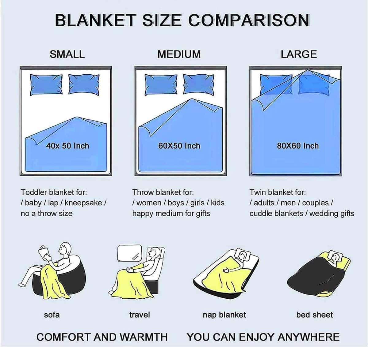 3. Tamaño y Material: El tamaño de 60″x80″ es apto para todas las edades y fácil de transportar. Nuestra manta está hecha de franela. No se desvanece fácilmente incluso después de lavarla. Lavable a máquina o a mano, esta manta ultra suave es fácil de cuidar y duradera. (No usar lejía.)