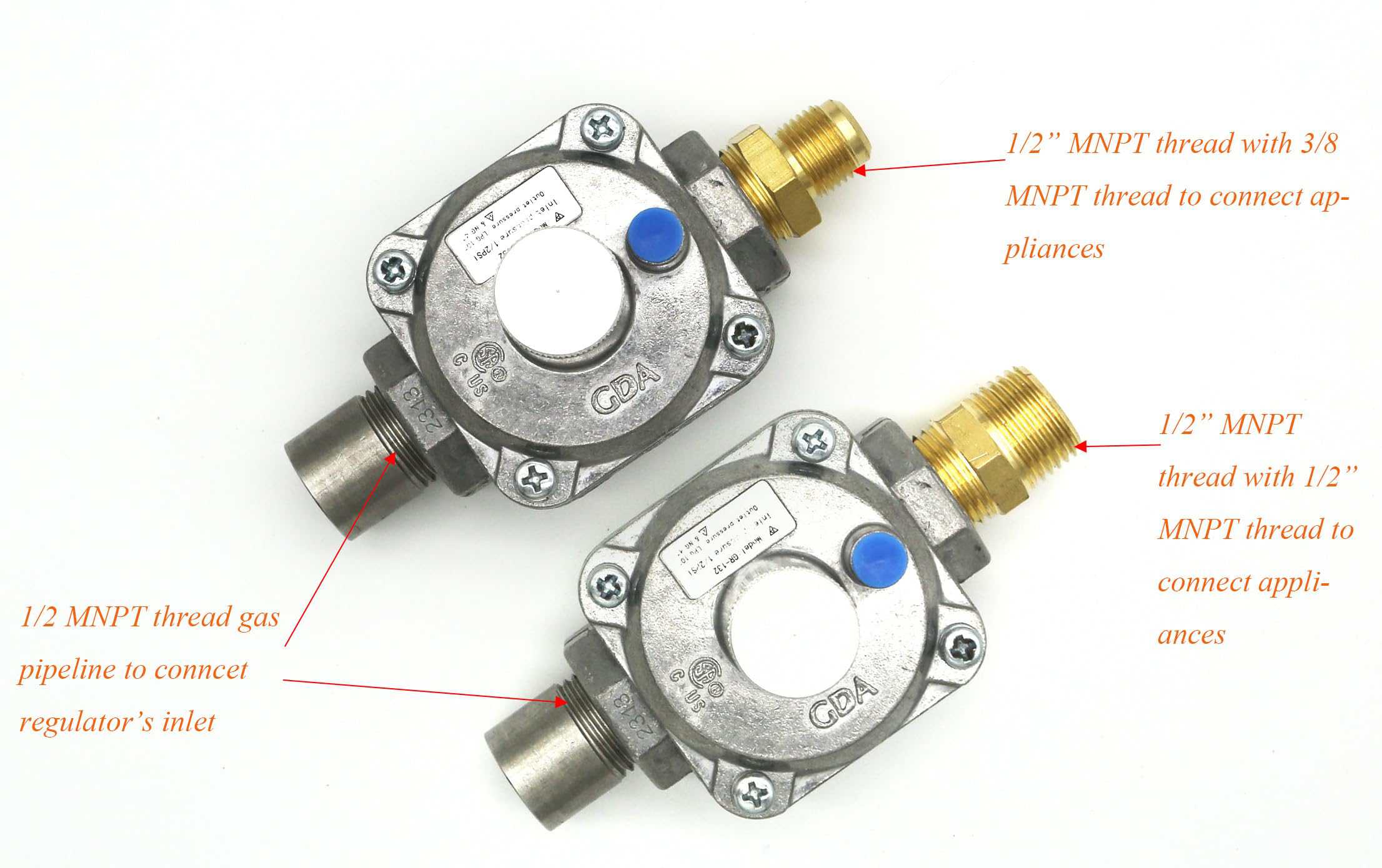 Este regulador de presión de propano universal es ideal para una variedad de aplicaciones, incluyendo parrillas de gas, calentadores, hornos y equipos de soldadura de gas. Tiene una capacidad máxima de flujo de 80,000 BTU/Hr y cuenta con una presión de entrada de 1/2″ PSIG (Máx) y una presión de salida de 10″ WC (Ajuste). Las tamaños de rosca de tubería son de 1/2″-14NPT tanto para la entrada como para la salida de la tubería de gas. Fabricado con fundición de aluminio, este regulador puede trabajar en temperaturas ambiente que van desde 32 F a 225 F (0 C – 107 C). ¡Asegúrate de mantener tus aparatos de gas regulados con este confiable regulador de presión!
