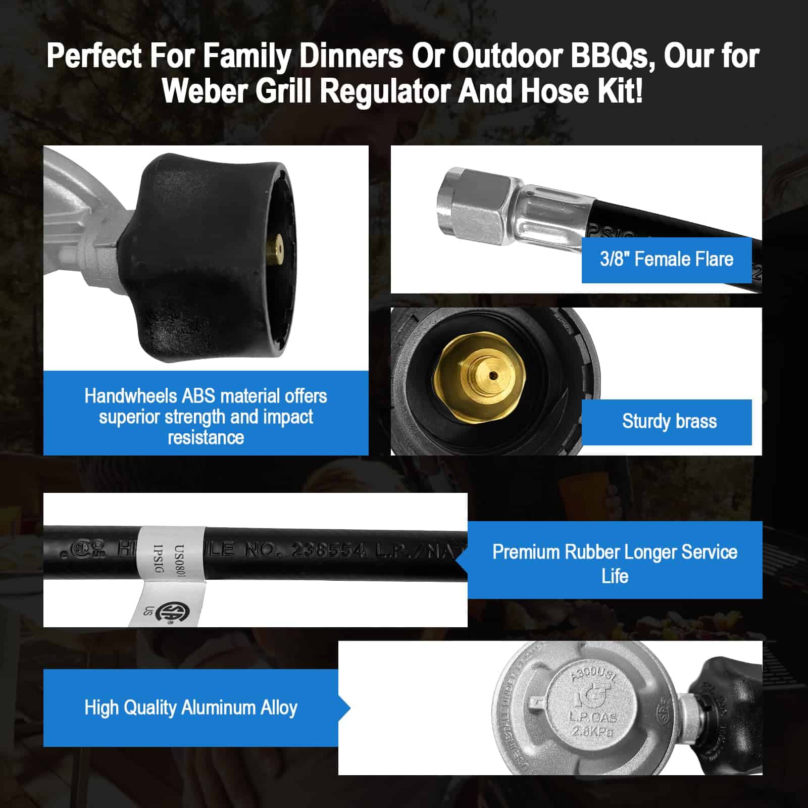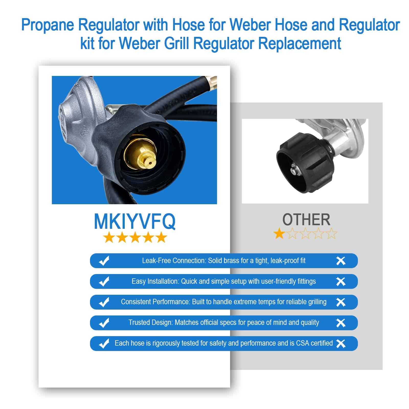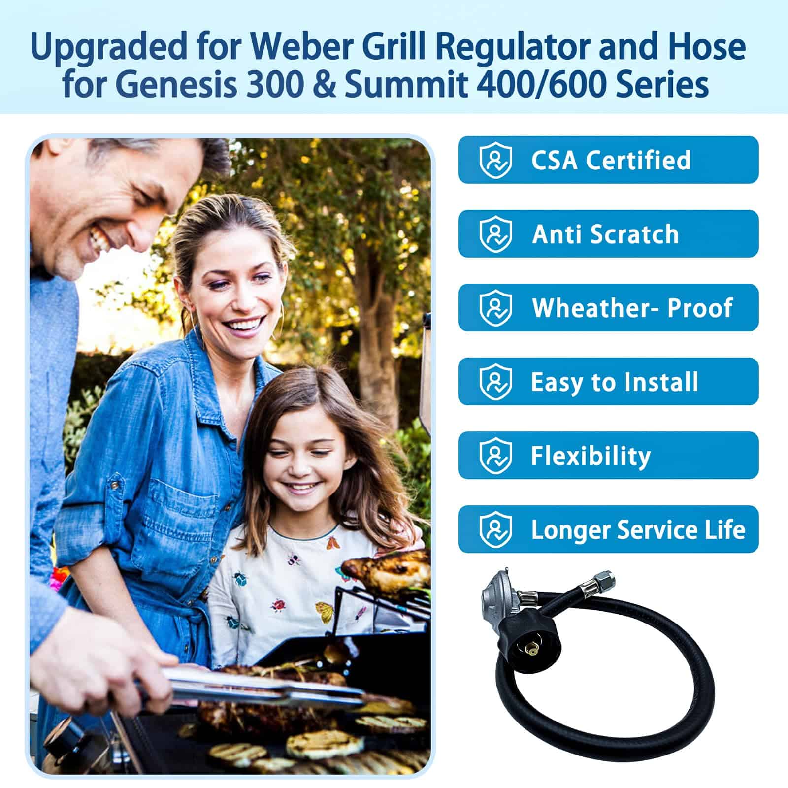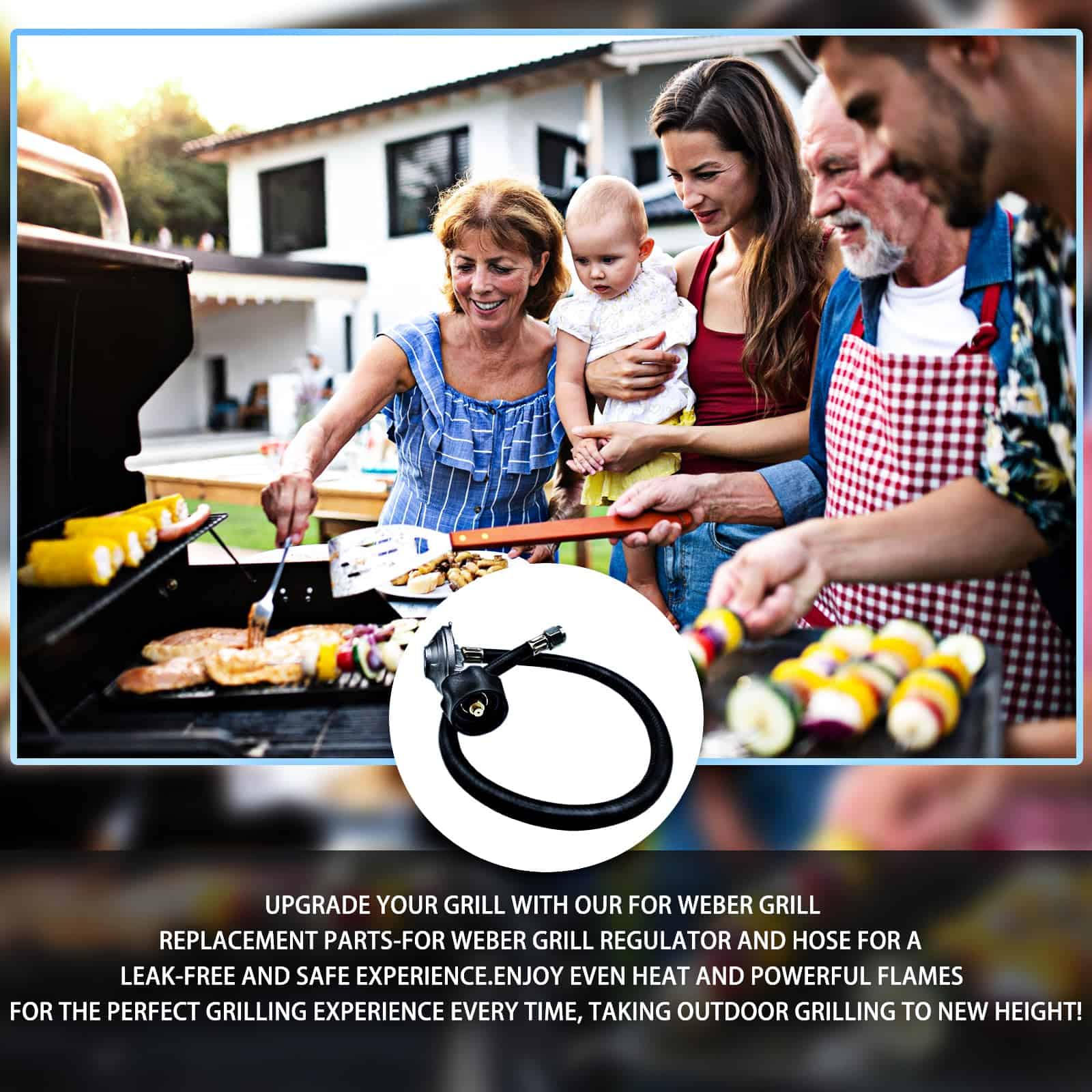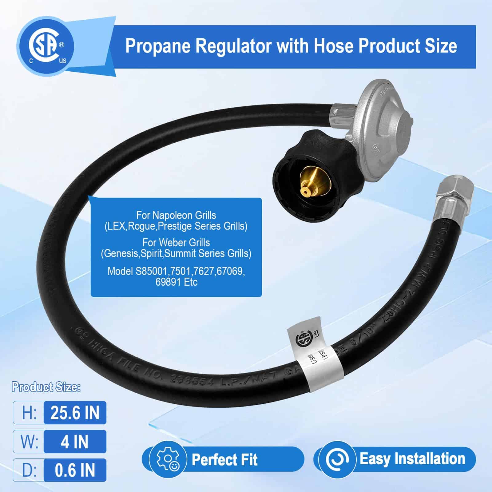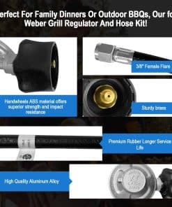 Regulador de Propano de 25″ con Manguera, Apto para Parrillas Napoleon (LEX, Rogue, Prestige Series) y para Parrillas Weber (Genesis, Spirit, Summit Series), Modelo S85001, 67069, 7501, etc. Cansado de lidiar con problemas de compatibilidad Nuestros reguladores de propano están diseñados de manera precisa para reemplazar sin problemas la antigua manguera de propano de tus parrillas Napoleon LEX, Rogue, Prestige y para parrillas Weber Genesis, Spirit, Summit, 210, 215, 310, 330, etc. Ya sea que estés asando hamburguesas en una parrilla Weber o filetes en una parrilla Napoleon, asegurando un enlace perfecto y restaurando el rendimiento óptimo de tu parrilla en poco tiempo. Construido para durar con tres capas resistentes de PVC, hilo de nylon, caucho, nuestra manguera de propano asegura una conexión segura, a prueba de fugas y resistente a la intemperie entre tu parrilla y los tanques de LP QCC-1/Type-1. Certificado por CSA por seguridad, la manguera de regulador de propano presenta protección de flujo en exceso y resistencia a la corrosión, ofreciendo un rendimiento confiable en todas las condiciones climáticas. Con control preciso del flujo de propano, experimentarás un calor constante para un asado uniforme. La detección de fugas de manguera de reemplazo de parrilla de gas Weber facilita la prevención de fugas de propano con una simple prueba de agua jabonosa. Aplica agua jabonosa a la conexión del control, abre el control y observa burbujas que indican una fuga. Las fugas también pueden ser causadas por una mala conexión o un tanque de propano. Para verificar el tanque, inspecciona el interior de la junta para detectar grietas o deformaciones (forma ovalada). Eleva tu juego de asado con nuestro regulador de propano y manguera para parrilla de gas, el kit de conversión para Weber garantiza estabilidad de la llama. Lograr la conversión perfecta de gas natural a propano es crucial y el regulador y la manguera adecuados son la clave. Ya sea que estés asando steak, vegetales, pan o cualquier otra deliciosa comida, obtendrás los resultados óptimos. Sekvira se enorgullece de ofrecer piezas de repuesto para parrillas de gas Weber que realmente encarnan la calidad. Si tienes alguna pregunta sobre el uso del reemplazo de regulador de propano para parrillas Weber, ¡no dudes en contactarnos por correo electrónico! Nuestro equipo de profesionales se compromete a proporcionar una respuesta rápida y satisfactoria en un plazo de 12 horas. Tu satisfacción y una experiencia de asado perfecta sigue siendo nuestra principal prioridad.