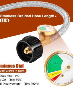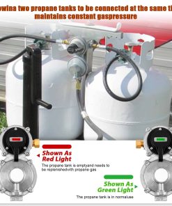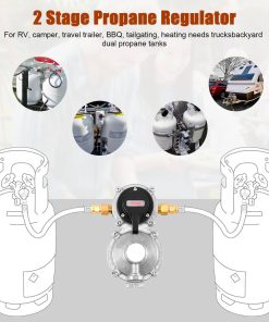 Regulador de propano para RV de 2 tanques-2-etapa Cambio automático de propano LP es un accesorio esencial para su RV, remolque, caravana, BBQ u otras necesidades de calefacción y cocina al aire libre. Este regulador le permite conectar 2 tanques de propano al mismo tiempo, lo que garantiza un suministro continuo y automático de gas propano. Con un diseño de doble etapa, cambia automáticamente del tanque principal al tanque de reserva cuando el nivel de propano es bajo en el tanque principal. El medidor incorporado le permite saber cuánto propano queda en el tanque sin tener que adivinar o sacudirlo. Las mangueras de pico de 18 pulgadas son duraderas y resistentes a la intemperie, lo que garantiza una conexión segura y hermética entre el regulador y los tanques de propano. La facilidad de instalación, la versatilidad de uso y la tranquilidad de saber que siempre tendrá gas propano disponible lo convierten en un accesorio imprescindible para sus actividades al aire libre.