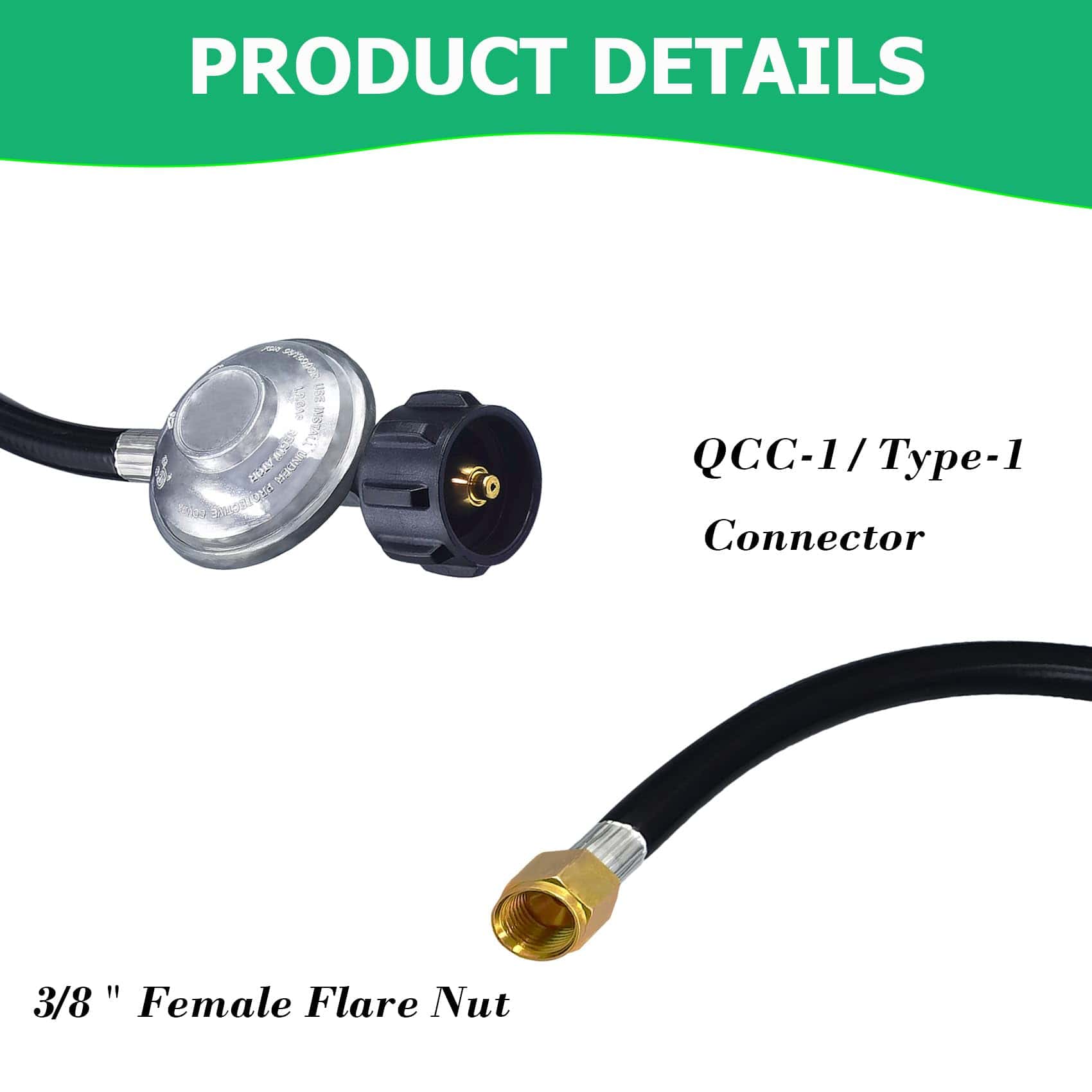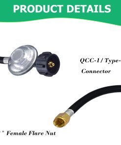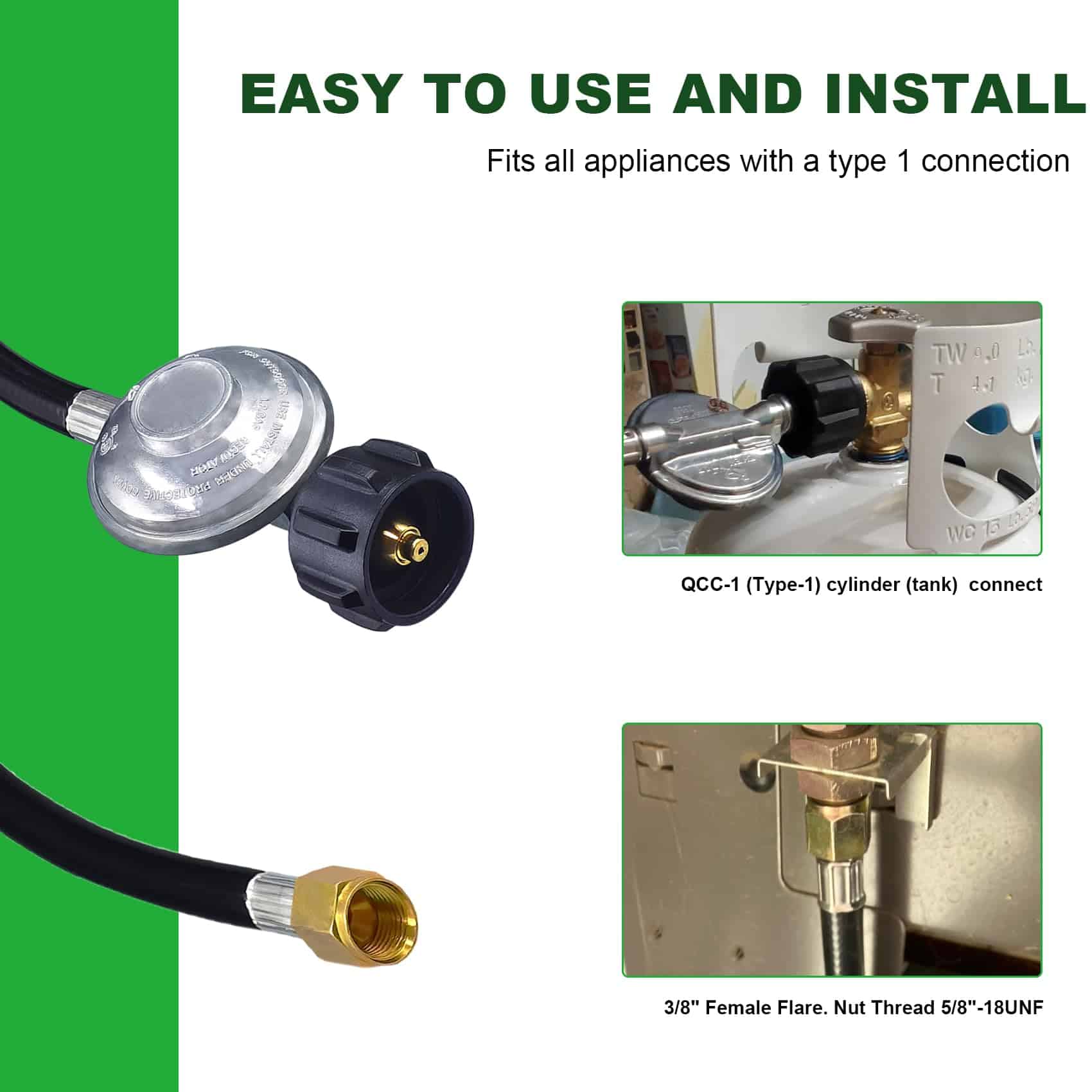 4. Conexión de tanque Tipo-1 (QCC-1) – Se adapta a todos los electrodomésticos con una conexión Tipo 1. Tuerca giratoria hembra de 3/8″ que tiene un diámetro exterior de 5/8″ para adaptarse al asiento del engarce. El regulador de propano asegura que su parrilla u otro equipo de exterior/camping funcione de manera óptima.