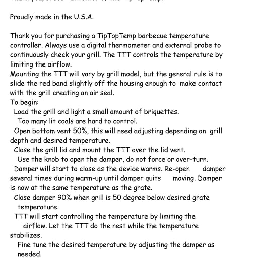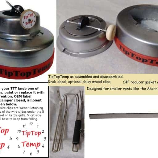 El TipTopTemp, un regulador de temperatura para parrilla adherible, convierte cualquier parrilla tipo hervidor en una ahumadora. El TipTopTemp tiene una base de cinco pulgadas de diámetro, una segunda etapa de tres pulgadas de diámetro y aproximadamente tres pulgadas de altura. El regulador de temperatura para parrilla utiliza una bobina bimetálica para controlar el flujo de aire hacia el hervidor. El dial en la parte superior del TipTopTemp permite a los asadores personalizar el flujo de aire. El modelo actualizado TTT-03 ahora viene en 2 partes para facilitar su almacenamiento y limpieza, y ha sido modificado para un movimiento más suave e instrucciones simplificadas.