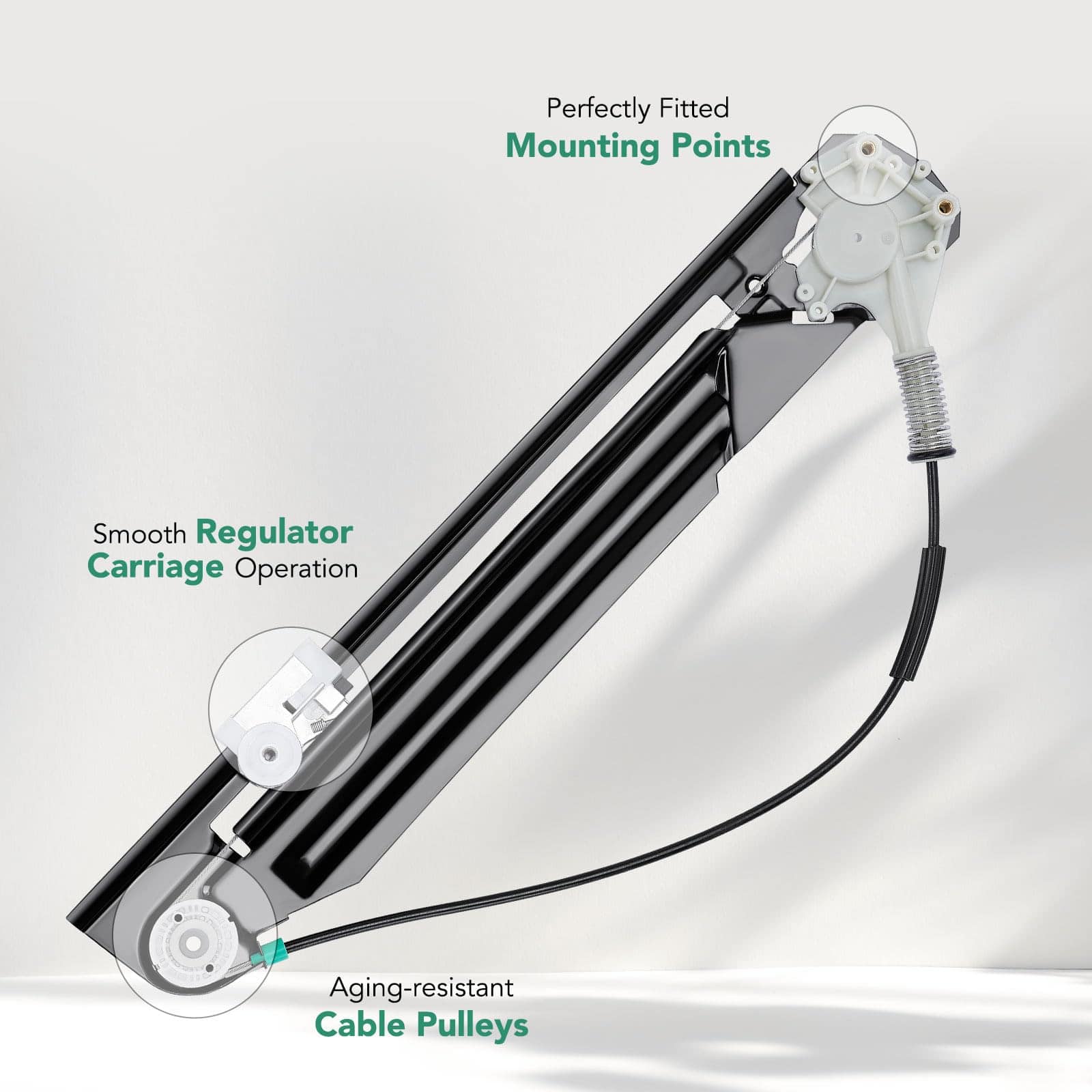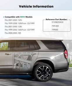 Regulador de ventanilla eléctrica trasera del lado del pasajero sin motor para BMW E39 525i 528i 530i 540i M5 2000-2003, Sedán/Station Wagon. Este regulador de ventanilla eléctrica está diseñado como un reemplazo avanzado para tu vehículo BMW. Viene sin motor de ventana para brindarte una solución completa. La posición de montaje es en la parte trasera derecha, del lado del pasajero, para una fácil instalación y funcionamiento. El material utilizado en este regulador es metal y plástico, lo que garantiza una fiabilidad duradera. El número de referencia de la pieza es 749-000, 749000, 51358252430. Este regulador de ventanilla está diseñado para ser Compatible con BMW 525i Base 2001-2003 Sedán/Station Wagon, 528i Base 1999-2000 Sedán/Station Wagon, 530i Base 2001-2003 Sedán, 540i Base 1999-2003 Sedán/Station Wagon, M5 Base 2000-2003 Sedán. Es importante tener en cuenta que para los modelos 1999 de BMW 528i y 540i, solo es compatible con los vehículos construidos después de 3/1999. La operación estable de este regulador de ventanilla se garantiza mediante pruebas exhaustivas que aseguran que el relé del regulador, cable, clips y polea sean duraderos según los estándares, habiéndolos probado hasta 30,000 veces en operación. Los kits de hardware del regulador están diseñados para resistir temperaturas extremas, desde -10 ° F hasta 150 ° F, lo que garantiza un funcionamiento sin problemas incluso en condiciones climáticas adversas. Disfruta de una experiencia de conducción silenciosa y cómoda gracias a la baja emisión de ruido por debajo de los 50 decibeles y prácticamente sin ruido del regulador de ventanilla. La instalación de estas piezas es sencilla y fácil gracias a los puntos de montaje precisos, lo que hace que el proceso sea enchufar y usar. Para tu tranquilidad, ofrecemos un servicio de un año que garantiza que cualquier defecto o problema que surja del uso normal será solucionado dentro del período. Disfruta de un producto de calidad con este regulador de ventanilla eléctrica para tu BMW, que te brindará un funcionamiento fiable y tranquilo en todo momento.