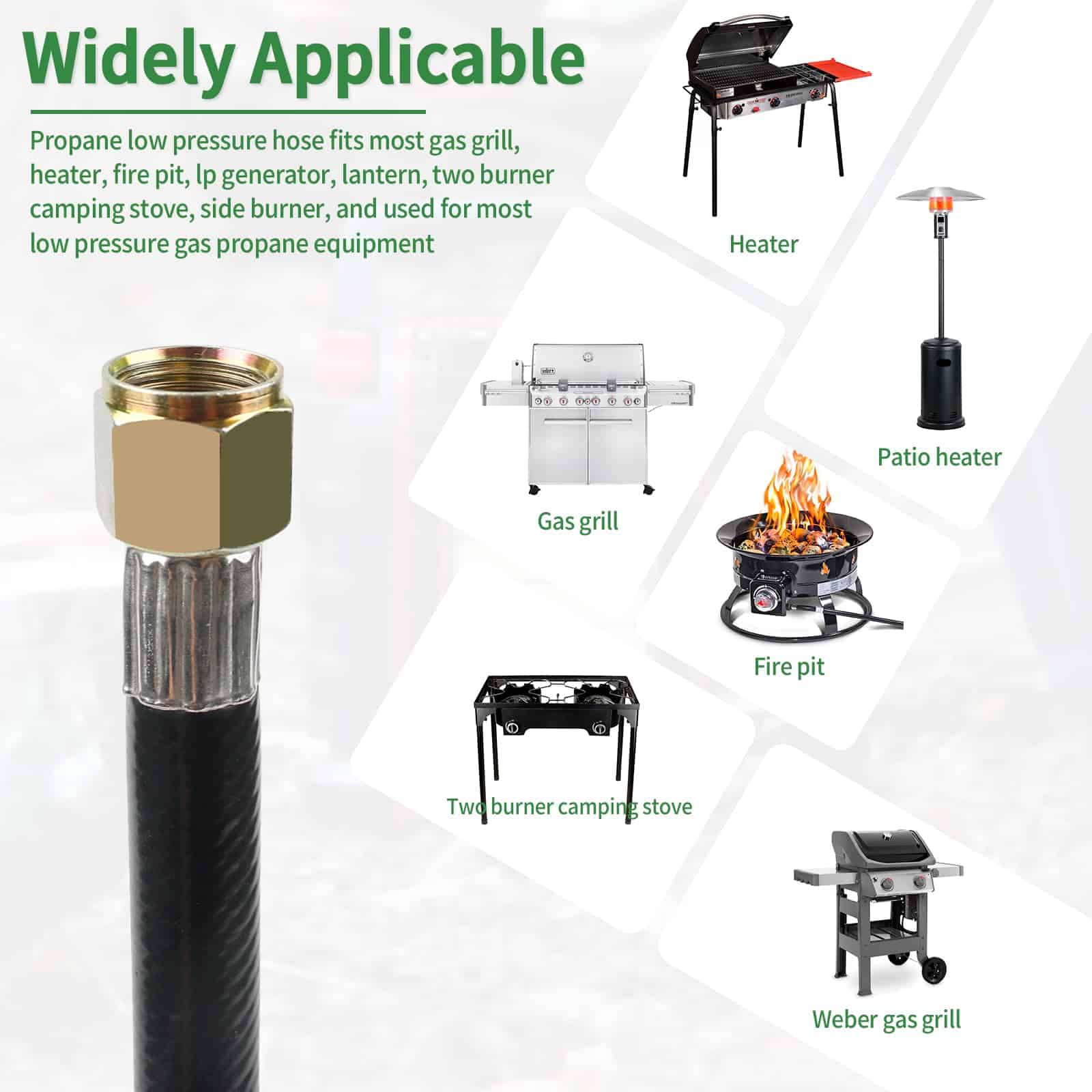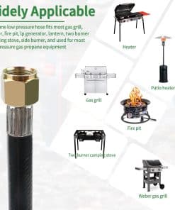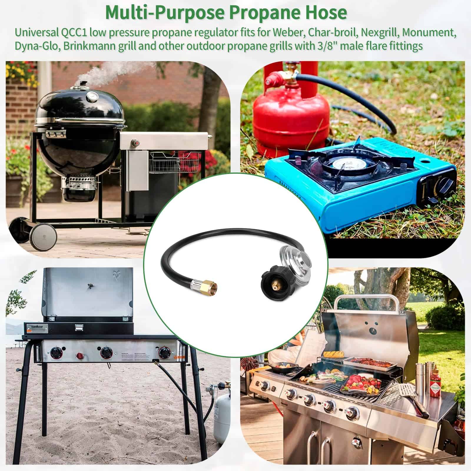 1. Aplicación de Manguera de Propano: Regulador y manguera de parrilla de gas compatible con la mayoría de calentadores, mesa de fogata, generador de lp, linterna, estufa de camping de dos quemadores, quemador lateral, se adapta a parrillas de propano al aire libre Weber, Char-broil, Nexgrill, Monument, Dyna-Glo, Brinkmann y otros con acoplamientos macho de 3/8″.