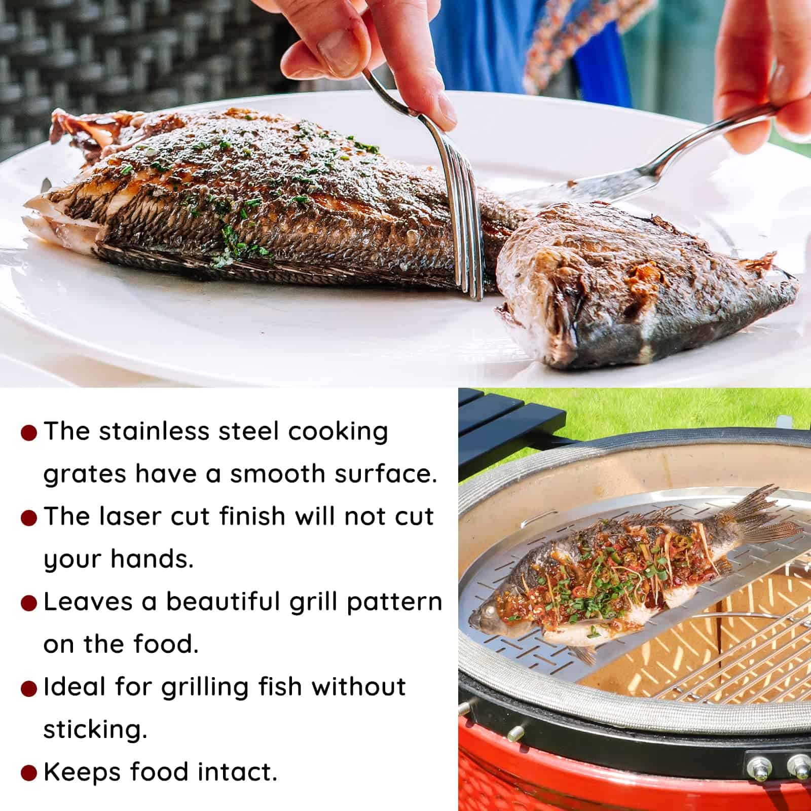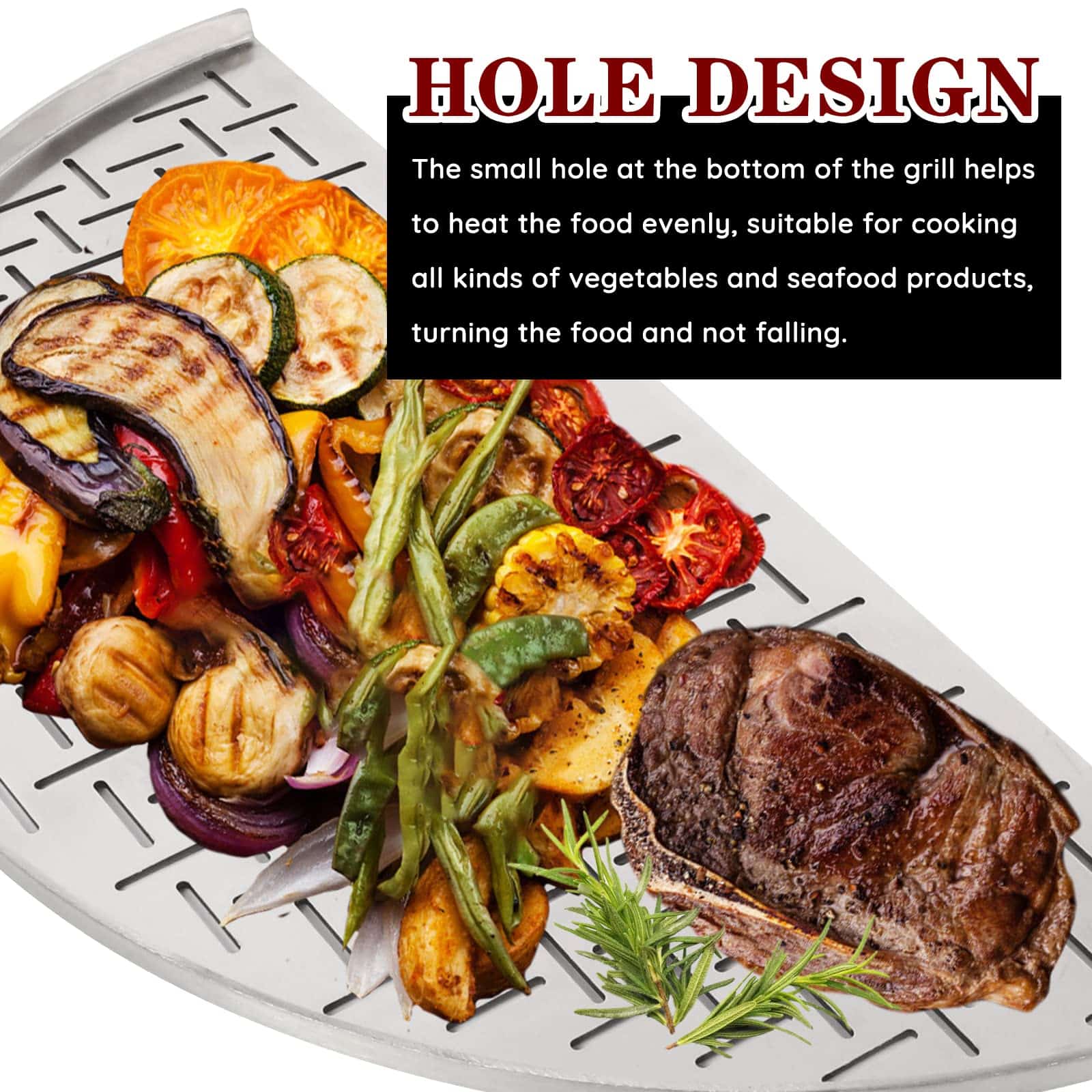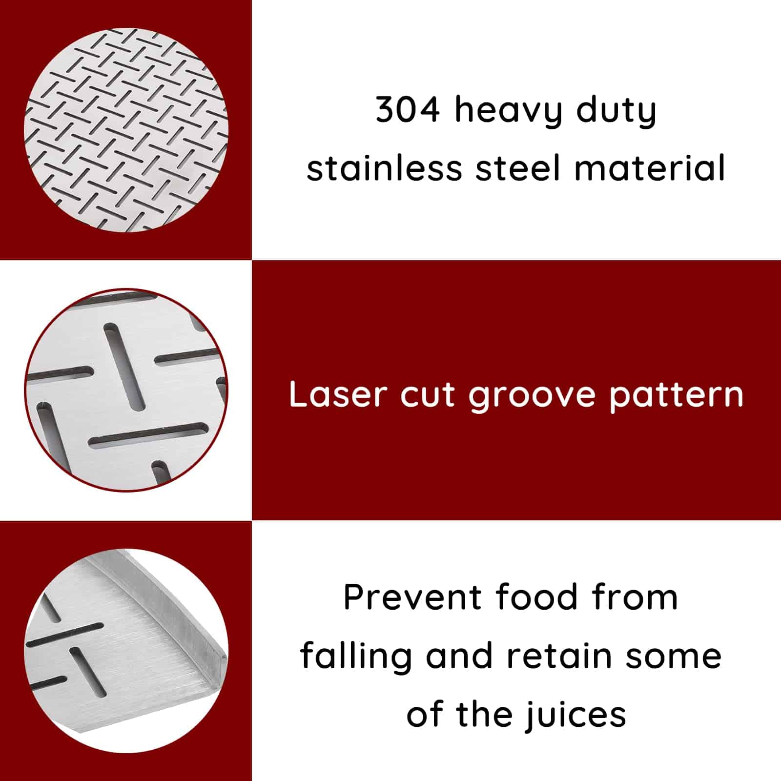 3. ADECUADO PARA FREÍR VEGETALES, PESCADO La superficie de la rejilla de acero inoxidable tiene surcos pequeños, utilización de una producción de corte láser única, adecuada para una variedad de alimentos como verduras, mariscos, almejas, camarones, caracoles, pescado, tocino, panquecas, la comida no se caerá y podrá retener parte de los jugos de los alimentos, el sabor fresco y suave no se alterará.