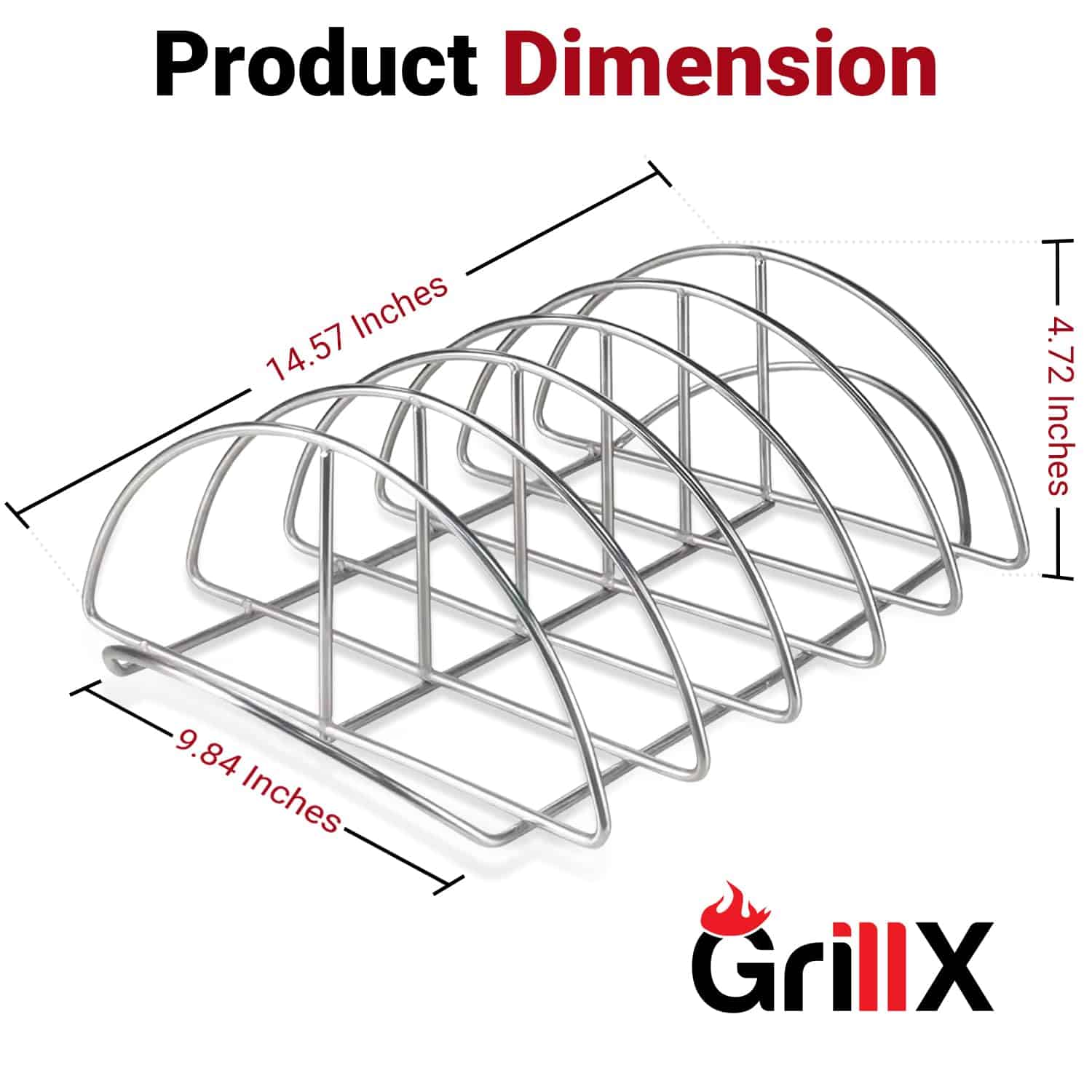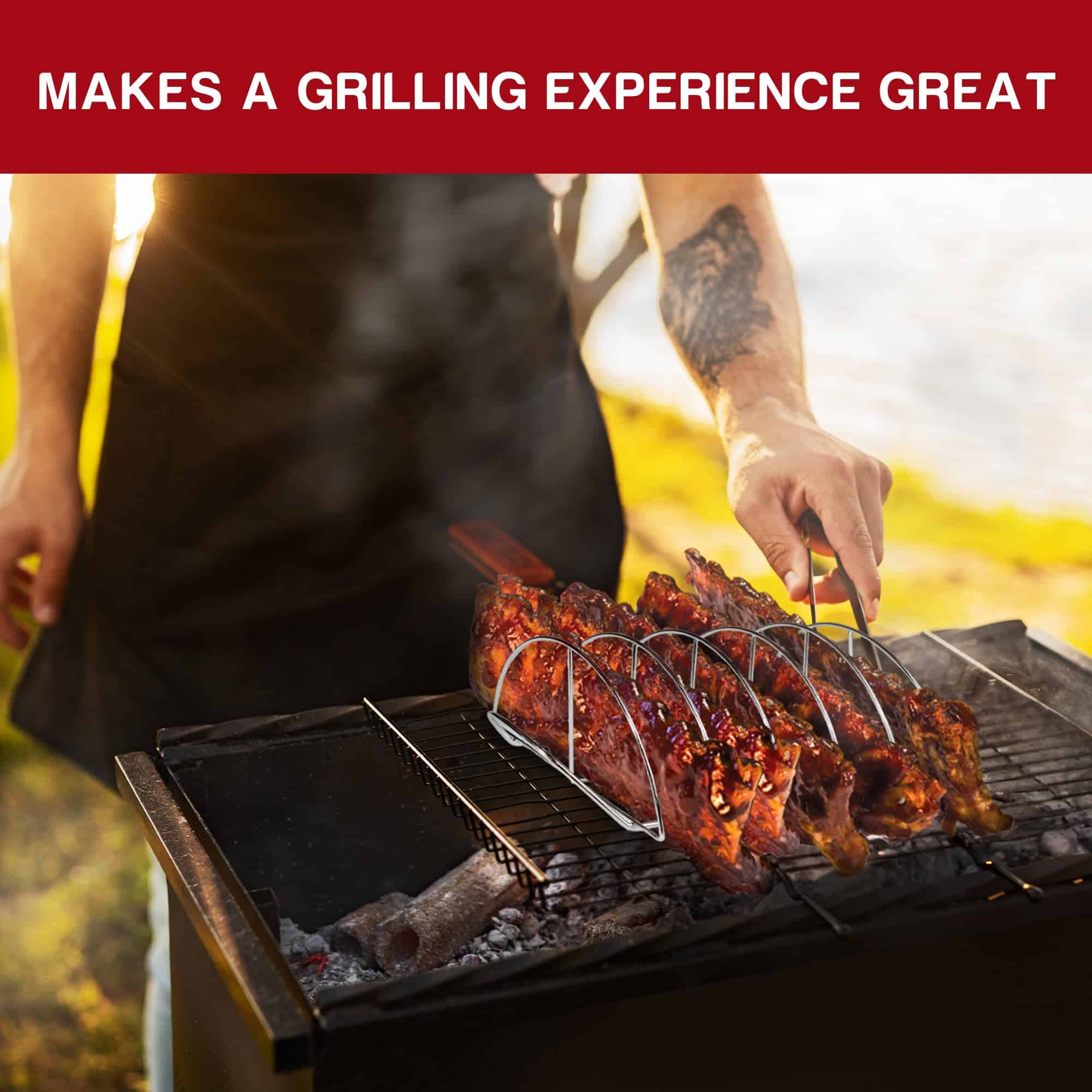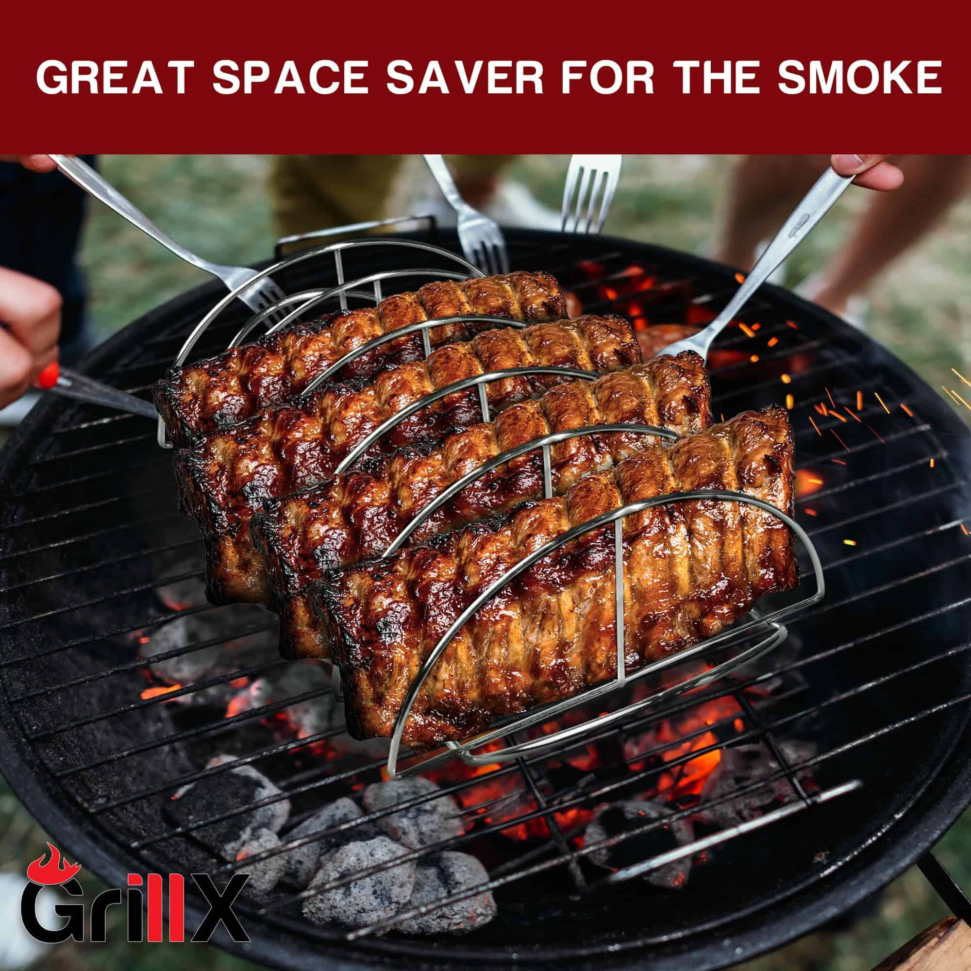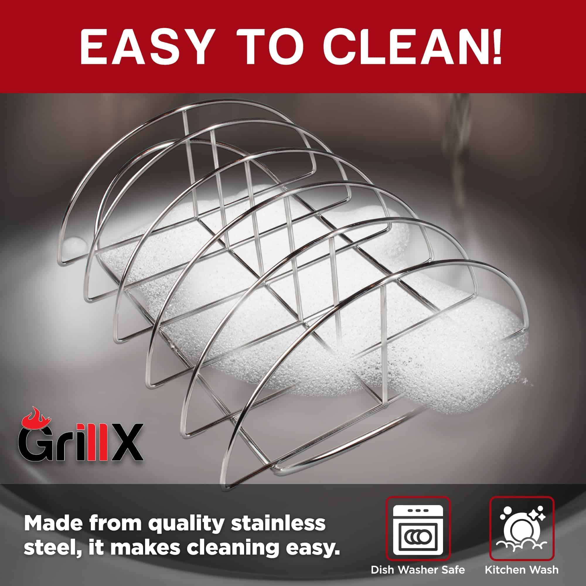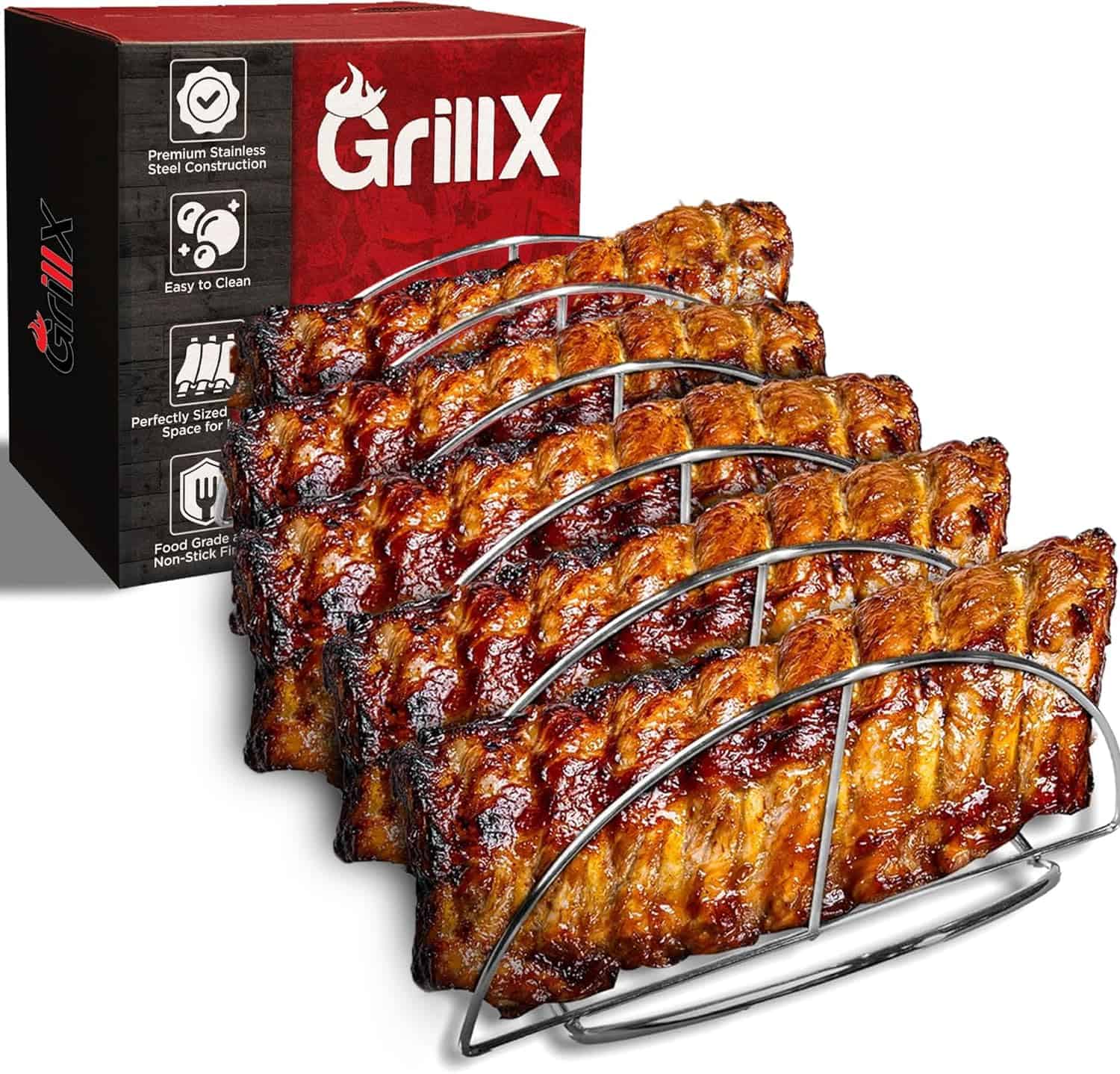 2. Parrilla Antiadherente y Segura para Alimentos: Aquí en GrillX, valoramos profundamente tu salud y seguridad, lo cual se refleja en nuestro compromiso de usar solo materiales de grado alimenticio para nuestra rejilla para costillas. Mientras disfrutas de la experiencia de asar, ten la seguridad de que no habrá productos químicos no deseados interfiriendo con tu comida.