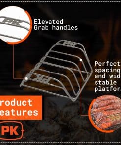 Actualiza tus accesorios de barbacoa con esta resistente rejilla para costillas de primera calidad, diseñada para asar y ahumar perfectamente. Fabricada en acero inoxidable, resiste la oxidación y soporta altas temperaturas para un uso duradero. Esta espaciosa rejilla para costillas de asar y ahumar puede sostener hasta cinco racks, lo que la hace ideal para cualquier parrillada. Las prácticas manijas de agarre garantizan un manejo fácil, mientras que el diseño de rejillas de parrilla para fumadores promueve un flujo de aire uniforme para obtener el máximo sabor. Ya sea usando parrillas de gas, carbón o pellets, esta rejilla para barbacoa de parrilla ofrece costillas tiernas y ahumadas cada vez.