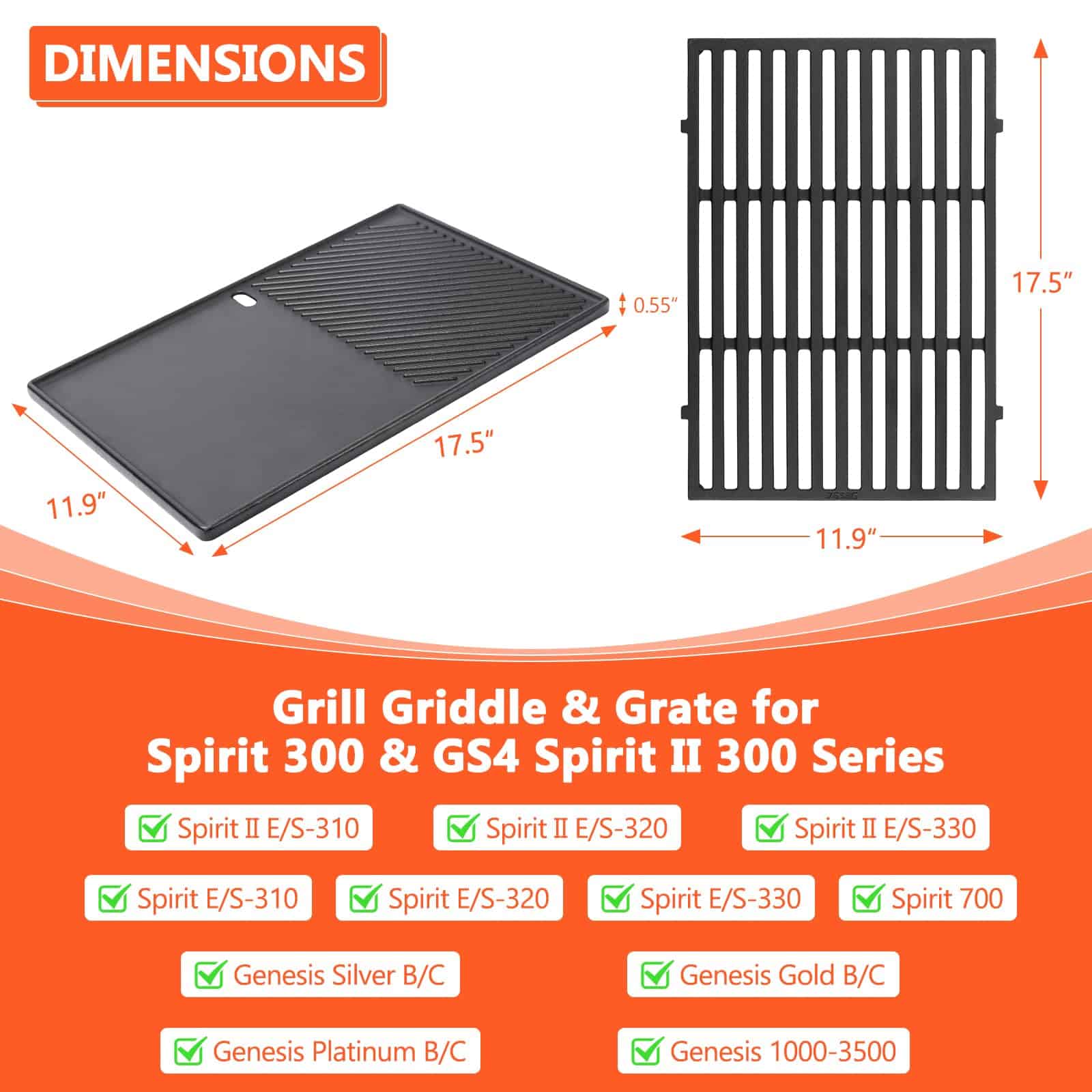 La rejilla de hierro fundido y la plancha son perfectas para Weber Spirit 300 Series Grills y Weber Spirit II 300 Series grills. La rejilla de hierro fundido calienta de manera más uniforme, es resistente a la corrosión, duradera y fácil de limpiar. La plancha de hierro fundido está hecha de hierro fundido duradero para garantizar un uso a largo plazo, seguro, saludable, no tóxico, calienta de manera uniforme y deja marcas de parrilla profesionales y hermosas en la comida. Gracias a la distribución uniforme del calor en la superficie de cocción, los tiempos de cocción se reducen significativamente, lo que le permite pasar menos tiempo esperando que la comida esté lista y más tiempo disfrutándola. La rejilla tiene un lado liso para cocinar desde huevos hasta sándwiches de queso a la parrilla, y un lado rayado para bistec jugoso, pescado, hamburguesas, costillas a la parrilla o brochetas de verduras. Las marcas de parrilla hacen que la comida sea más apetitosa. La rejilla mantiene el exceso de aceite alejado de la comida, lo que la convierte en una opción de cocción más saludable. Perfecto para asar pollo, bistec, verduras. La rejilla tiene agujeros convenientes para colgarla. Nuevo diseño con tapa plana y ranuras anchas. La rejilla viene sazonada y suelta bien la comida. Hay espacios más pequeños entre las barras para que la comida no caiga fácilmente. Después de usar, limpiar y almacenar en un lugar fresco y seco.