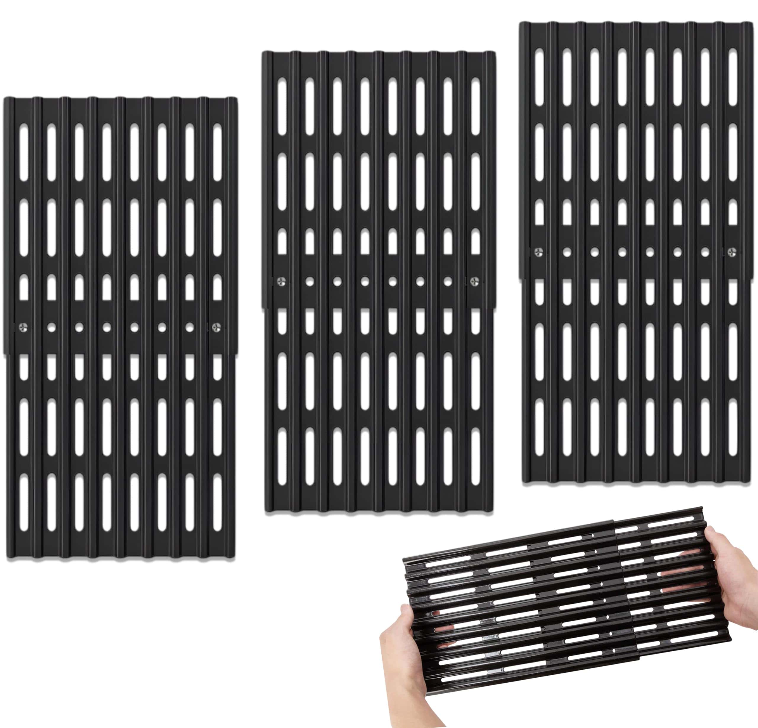 Este juego incluye 3 rejillas de cocina universales ajustables para parrilla, cada una de 8 pulgadas de ancho. La profundidad de cada rejilla se puede ajustar entre 12 pulgadas a 19 pulgadas, ofreciendo una cobertura total de ancho de 24 pulgadas con las 3 rejillas. Estas rejillas de parrilla de reemplazo están diseñadas para adaptarse a una amplia variedad de modelos de parrillas, incluidas parrillas de marcas conocidas como Brinkmann, Nexgrill, Expert Grill, Dyna Glo, Charbroil, Kenmore, Backyard Grill, BHG, Weber, BBQ Pro, y muchos otros. Antes de ordenar, se recomienda medir su rejilla de cocina original para garantizar un ajuste perfecto para su modelo de parrilla.