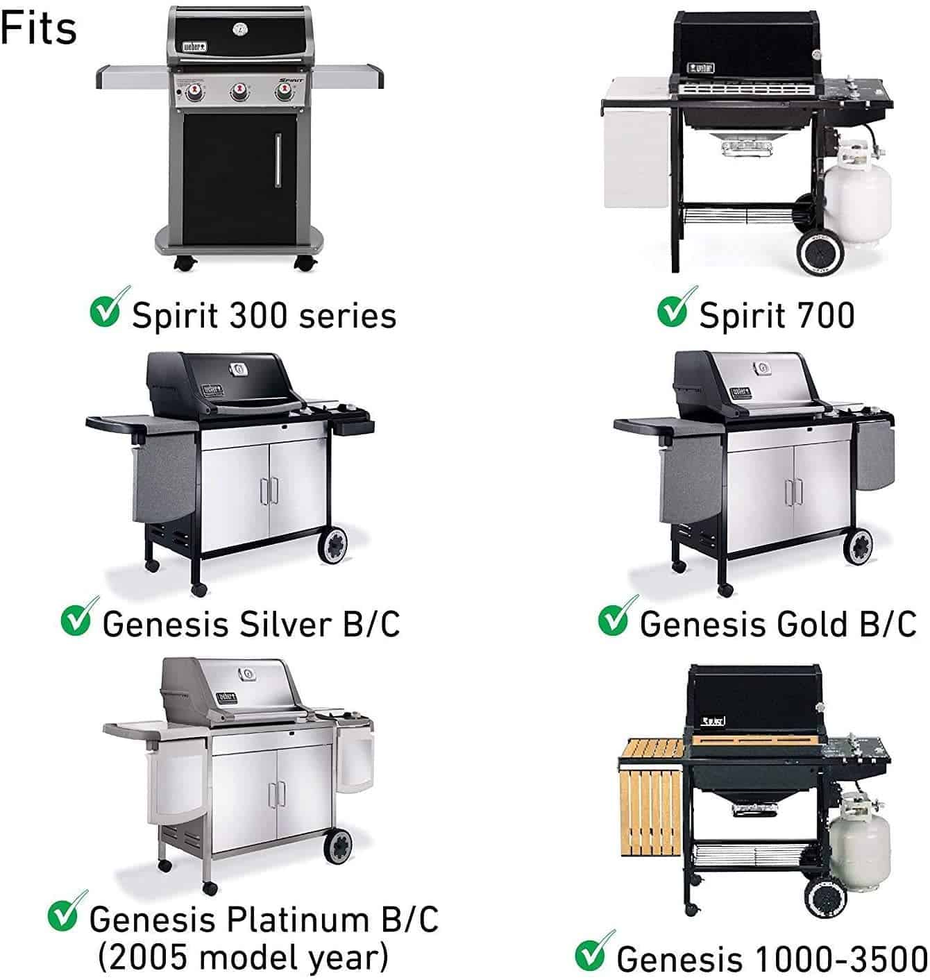 3. Compatible con la serie Weber Spirit II 310, Spirit II e310, Spirit II s310, Weber Spirit E310, E320, E330, S310, S320, S330, Spirit 700, Genesis Silver B/C, Genesis Gold B/C, Genesis Platinum B/C (año del modelo 2005) Genesis 1000-3500.