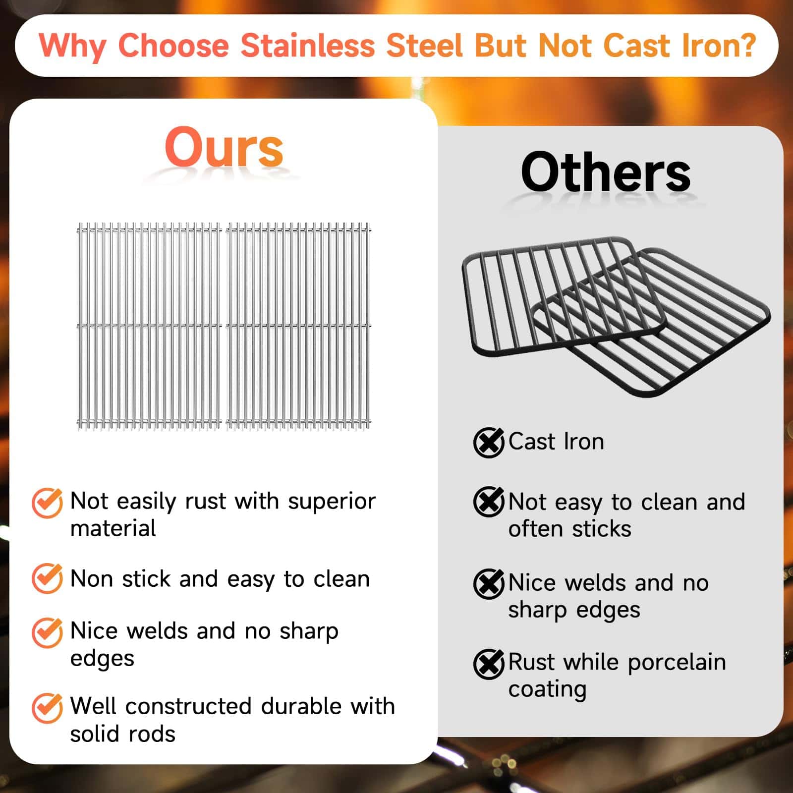 4. Material Premium: La sustitución de las rejillas de la parrilla están hechas de material de acero inoxidable 304 de alta calidad, que es sólido y resistente al óxido. La rejilla de la parrilla tiene una pequeña abertura para que la comida no se caiga fácilmente, y el acero inoxidable tiene una buena conductividad térmica que puede hacer que la comida se caliente uniformemente, para que pueda disfrutar de su fiesta familiar y disfrutar de la emoción que la comida le brinda.