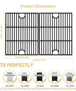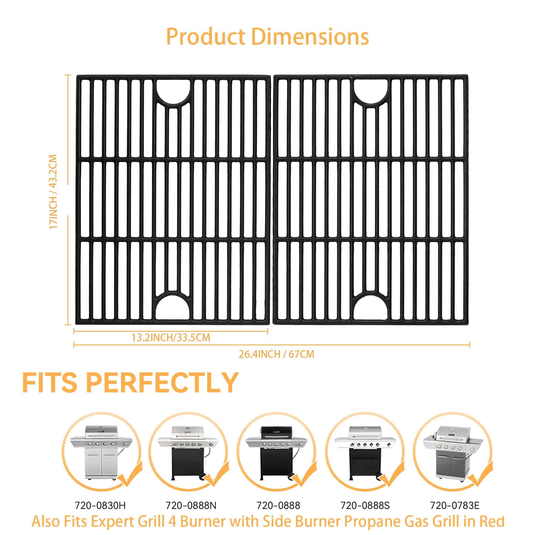 Las rejillas de la parrilla de hierro fundido de 17 pulgadas son ideales para reemplazar las parrillas de cocina de Nexgrill de 4 quemadores 720-0830H y 5 quemadores 720-0888. También se ajusta a los modelos de grill como Charbroil 4 quemadores 463241113, 463449914 y Expert Grill 720-0789H 720-0789C. Además, son compatibles con Kenmore 415.16106210, Members Mark 720-0830F, Uberhaus 780-0003, Uniflame GBC091W, GBC940WIR, GBC956W1NG-C, GBC981W, GBC981W-C, GBC983W-C, y K-Mart 640-26629611-0. Fabricadas con hierro fundido de alta calidad y excelente artesanía, estas rejillas de cocina son duraderas, resistentes a la oxidación y distribuyen el calor de manera uniforme para una cocción perfecta. Cada paquete incluye 2 rejillas de cocina en condiciones óptimas de embalaje para garantizar su protección durante el transporte.