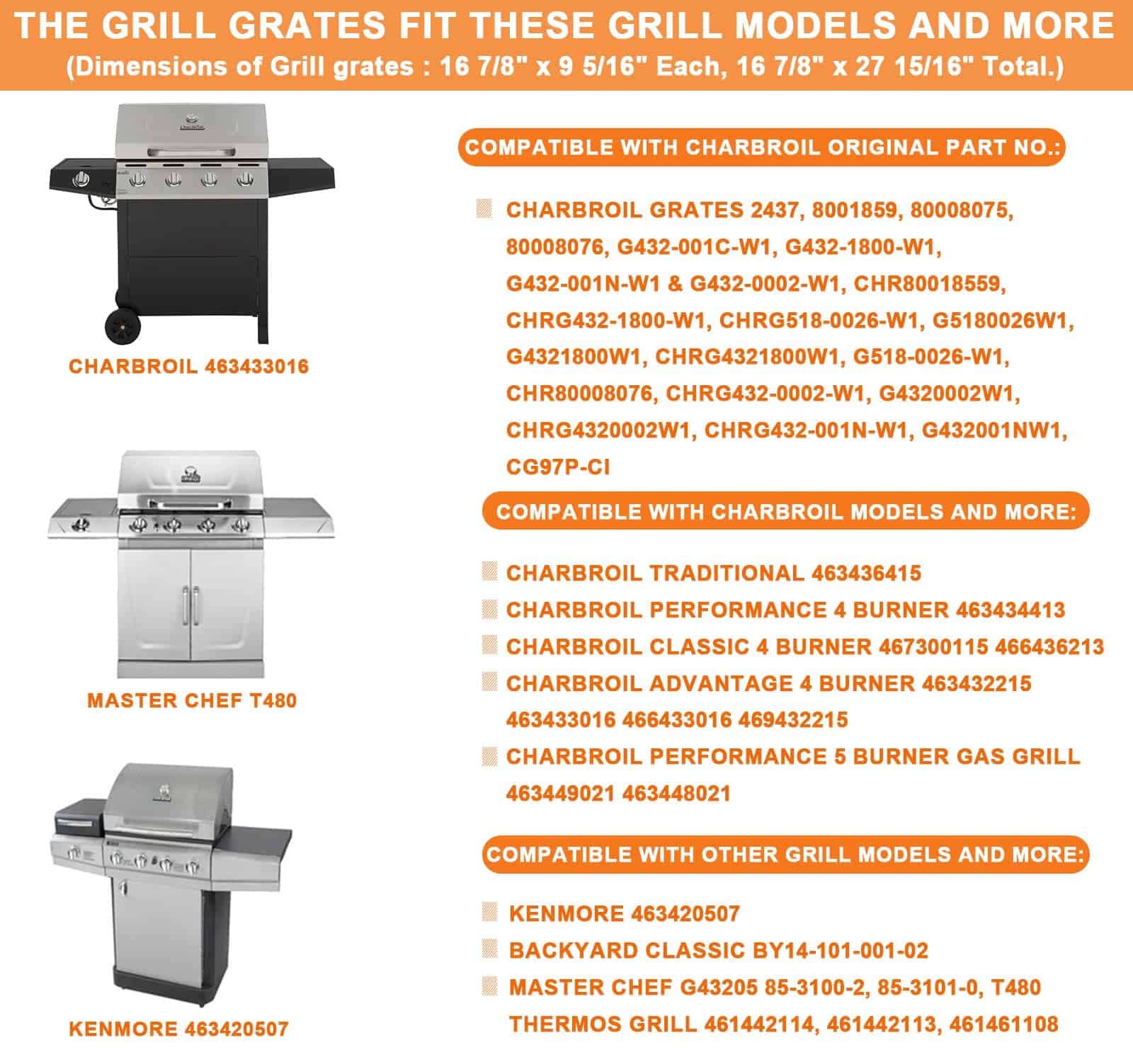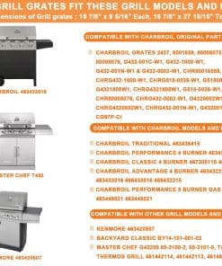 7. Piezas de repuesto para rejillas de parrilla RevoAce/Backyard/Kenmore 2437. Piezas para RevoAce GBC1748WPF, GBC1748WS; Modelos de Backyard Grill BY14-101-001-02, BY16-101-003-05, GBC1646WPF, GBC1646WPFD-C, GBC1646WRBD-C, GBC1646WSD-C, GBC1748WBSB-C, GBC1748-WBSB-C, GBC1748-WRSB-C; Modelos de Kenmore 463420507, 461442513; Piezas de repuesto para los números de parte de Kenmore: 80008076.