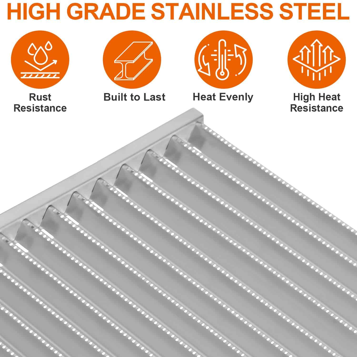 La superficie de la placa emisora tiene muchos agujeros para ayudar a distribuir bien el calor del tubo de quemador en toda la parrilla. La rejilla retiene el calor y calienta de manera uniforme, dejando marcas hermosas en tu carne.
