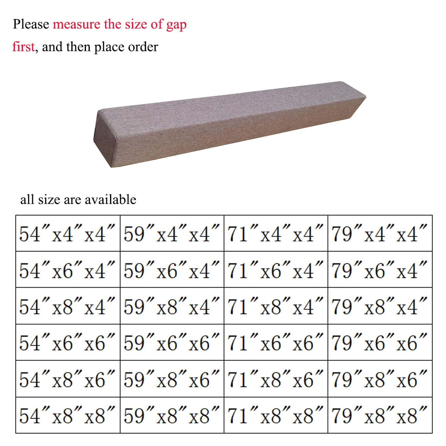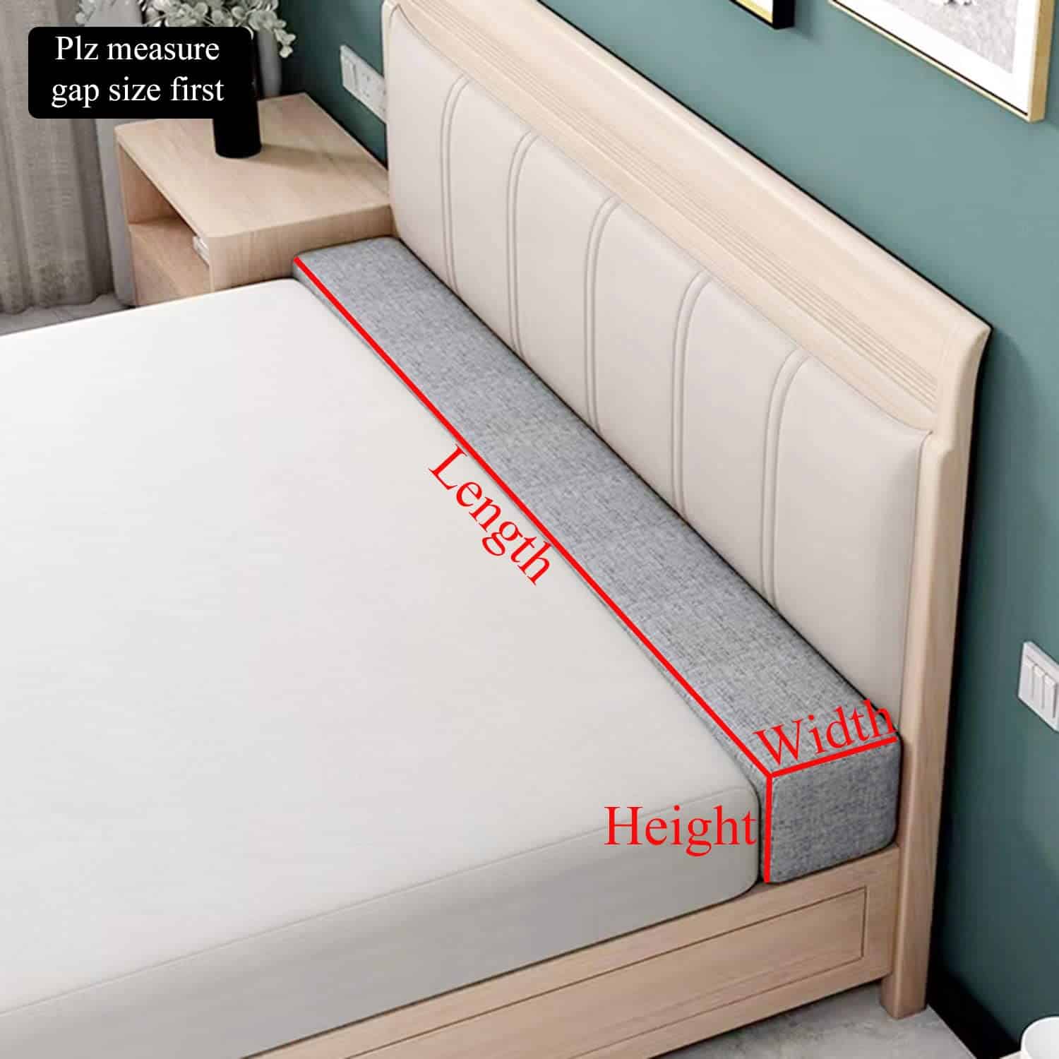 Tamaño de Relleno de Brecha de Cama Relleno de brecha de cama para cabecera que se ajusta perfectamente a su brecha de cama o brecha de sofá. NOTA: Como el cojín de grieta de cama está envasado al vacío, por favor retire la bolsa de vacío y agite vigorosamente en cada lugar por un tiempo, y el relleno de espacio de cabecera recuperará su forma original después de 48 horas.