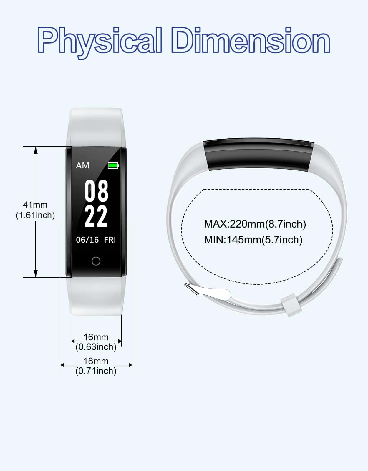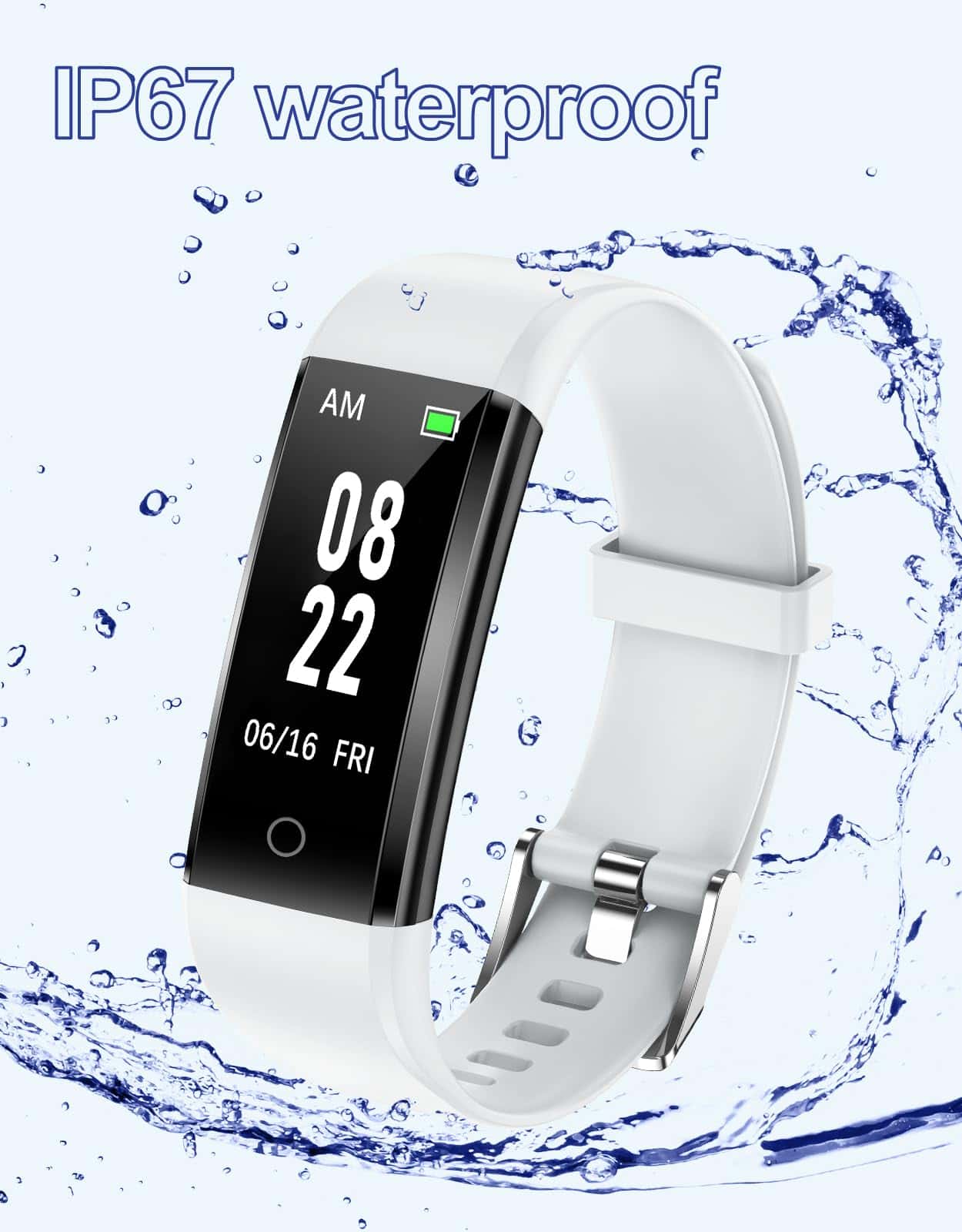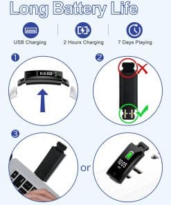 5. Larga duración de la batería – Este reloj de fitness se carga a través del USB incorporado. Solo necesitas sacar el cuerpo del reloj de la correa, y luego insertar el extremo con la pieza metálica en cualquier puerto USB para cargarlo. Solo tarda de 2 a 3 horas en cargarse completamente y puede servirte durante hasta 7 días. (Consejo: Por favor, carga el reloj a tiempo antes de que se agote la batería, de lo contrario tendrás que configurar el reloj nuevamente).