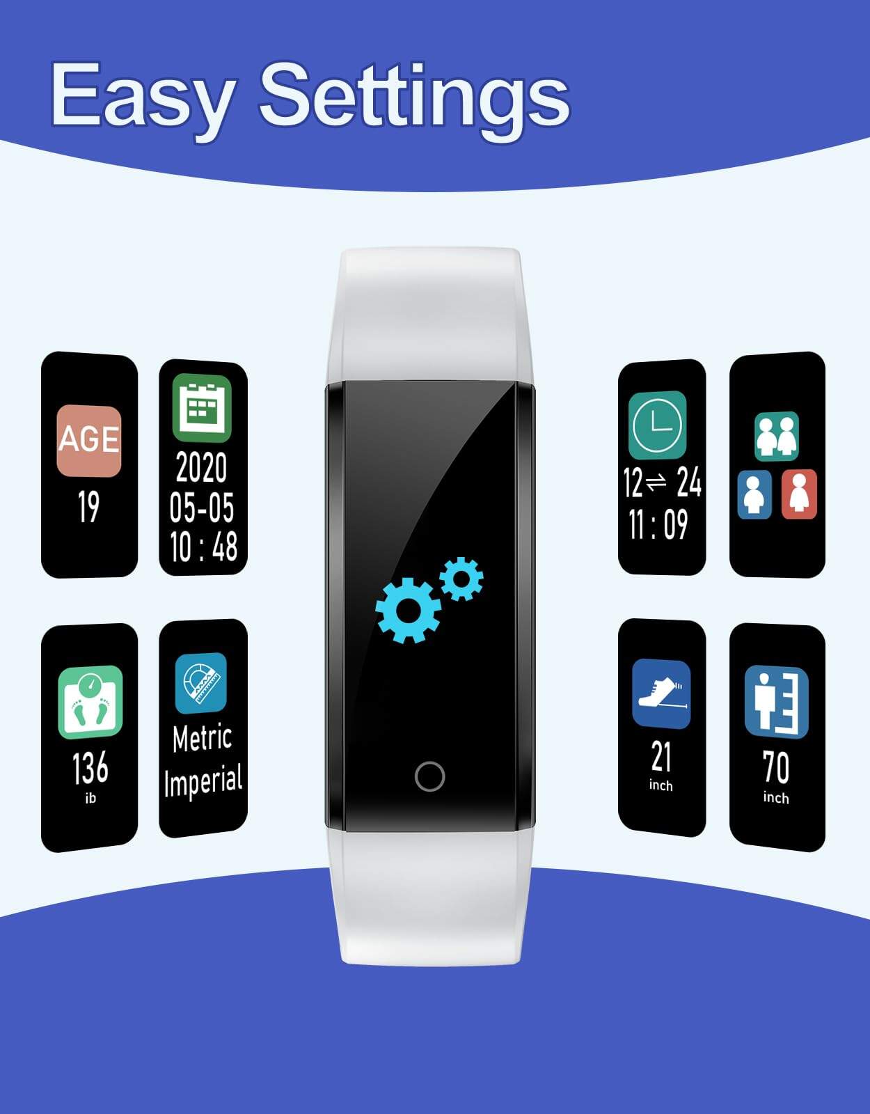 3. Fácil de configurar – Configurar este reloj es muy sencillo. Solo necesitas introducir la hora correcta, la fecha, tu altura, peso y edad en el menú de configuración del reloj para ponerlo en marcha. El reloj se puede manejar fácilmente con el botón táctil en la parte inferior de la pantalla.