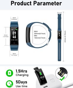 4. Batería de Larga Duración- Este reloj rastreador de fitness se carga a través del USB incorporado. Solo necesitas sacar el cuerpo del reloj de la correa, luego insertar el extremo con la pieza de metal en cualquier puerto USB para cargarlo. Solo toma 2-3 horas cargar completamente y puede durarte hasta 5 días. (Consejo: Por favor, carga el reloj a tiempo antes de que se agote la batería, de lo contrario deberás configurar el reloj nuevamente.).