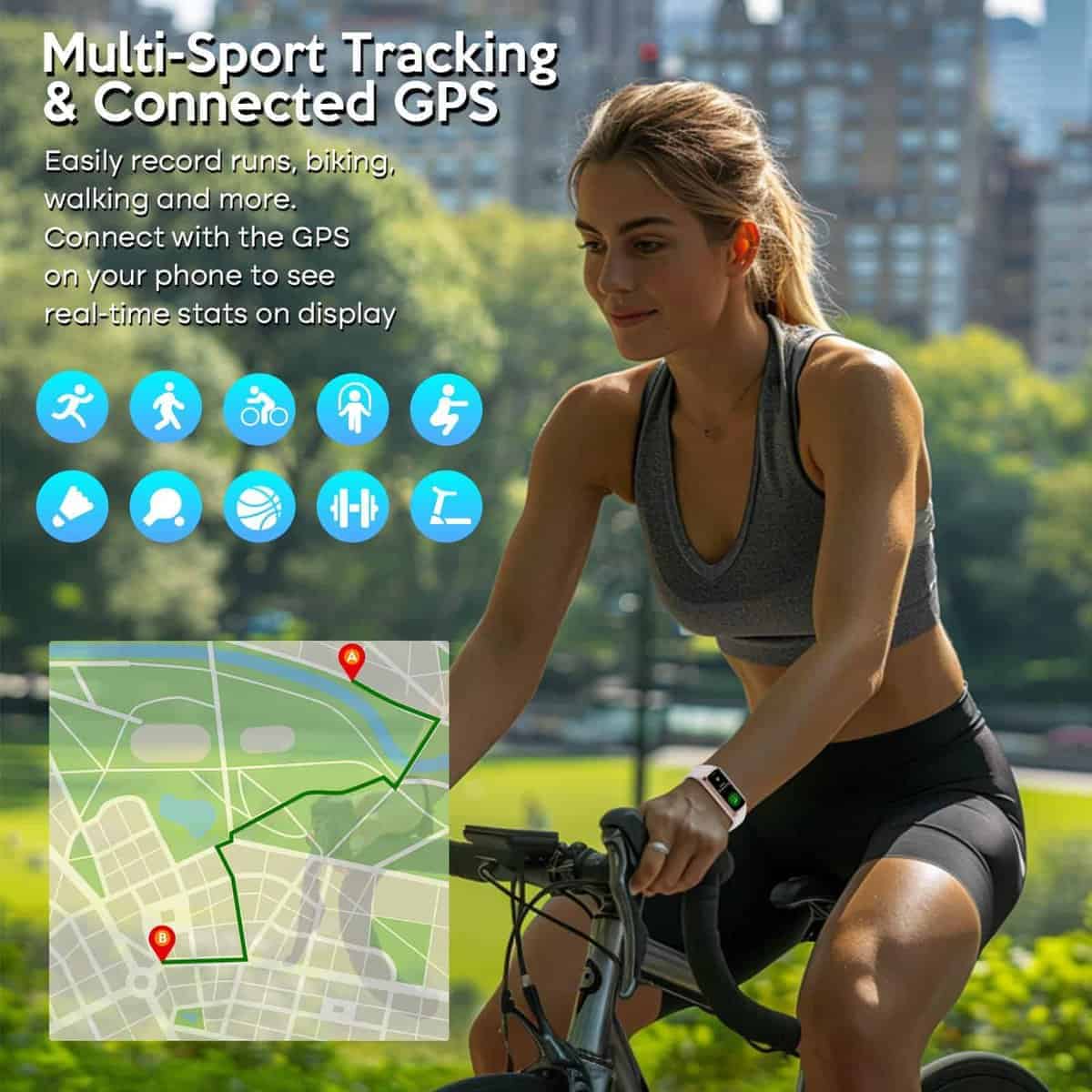 2. Seguimiento de actividad todo el día y múltiples modos deportivosEste reloj rastreador de pasos de actividad y fitness rastrea la actividad durante todo el día, incluidos los pasos, la distancia y las calorías quemadas para ayudarte a alcanzar tus objetivos de fitness de manera más eficiente. Puede rastrear 25 modos deportivos como correr, andar en bicicleta y saltar, entre otros, para obtener el ritmo cardíaco, pasos, distancia, calorías quemadas y tiempo de duración en tiempo real. Puedes obtener un mapa de la ruta y el ritmo de tu entrenamiento en la aplicación durante la actividad al aire libre conectándote al GPS de tu teléfono.