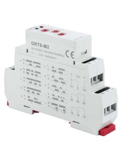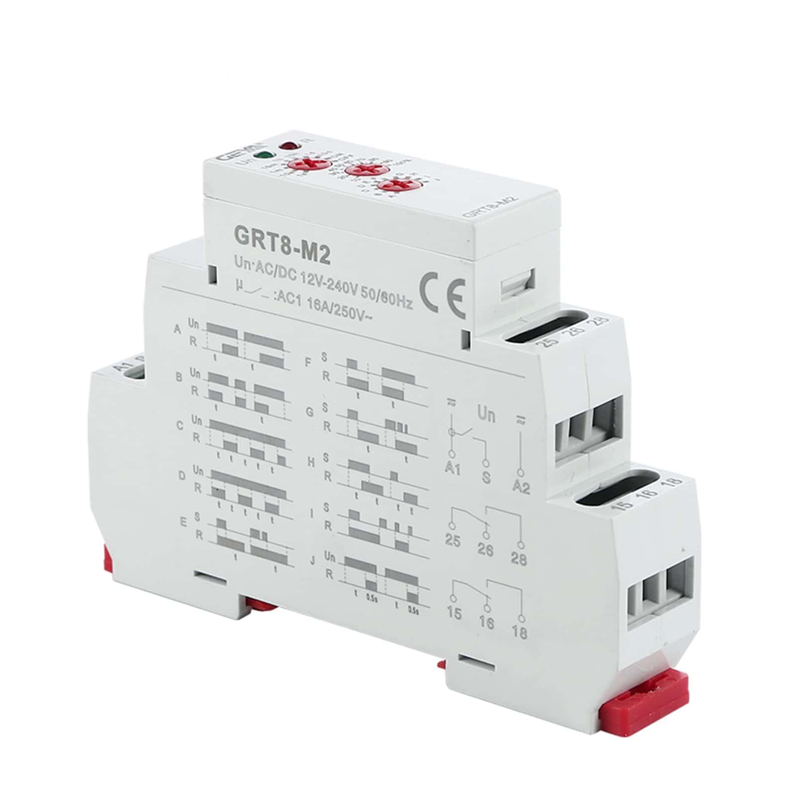 Reloj temporizador multifunción GAEYAELE 16A con 10 opciones de funciones, adecuado para uso en voltajes AC/DC12V-240V. Cuenta con 5 funciones de tiempo controladas por voltaje de suministro, 4 funciones de tiempo controladas por la entrada de control y 1 función de relé de retención. La configuración de función y rango de tiempo es cómoda y clara mediante interruptores rotativos. La escala de tiempo varía de 0.1 segundos a 10 días, dividida en 10 rangos, con configuración mediante potenciómetro. La señalización del estado del relé se realiza mediante un LED. La salida es de 16A con 1SPDT (GRT8-M1) o 2SPDT (GRT8-M2). Su diseño ultra compacto de solo 18 mm de ancho permite un montaje sencillo en rieles de 35 mm.
