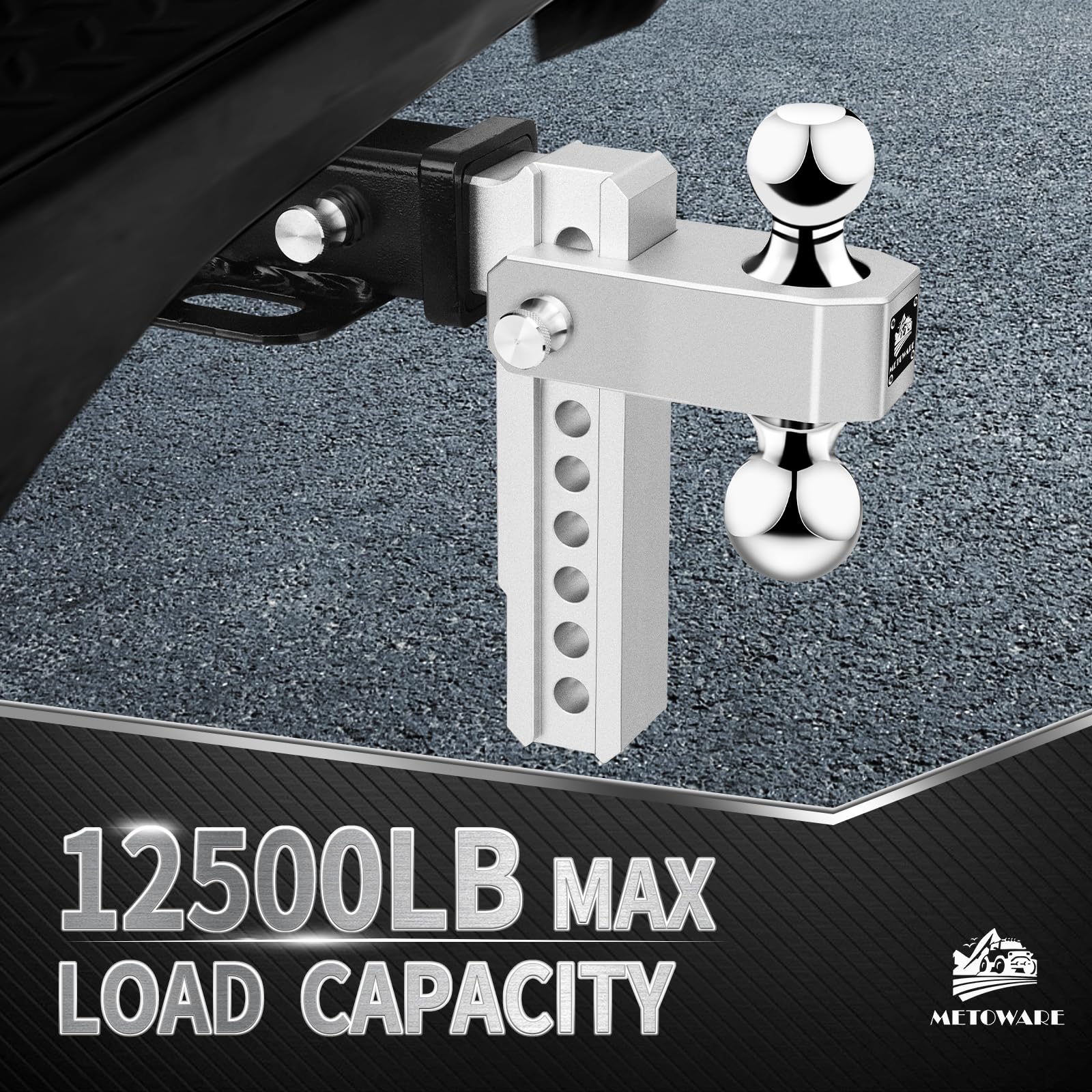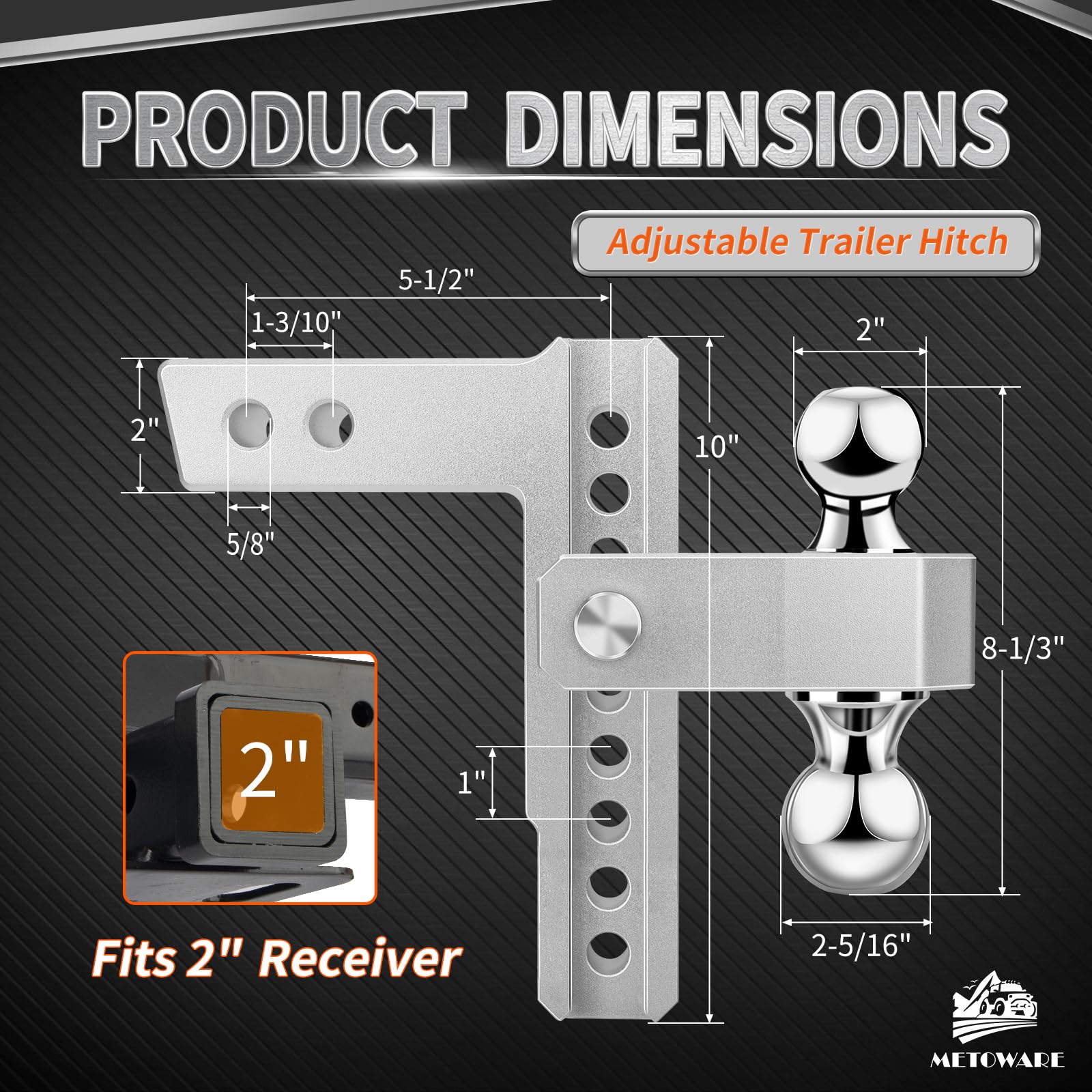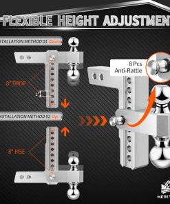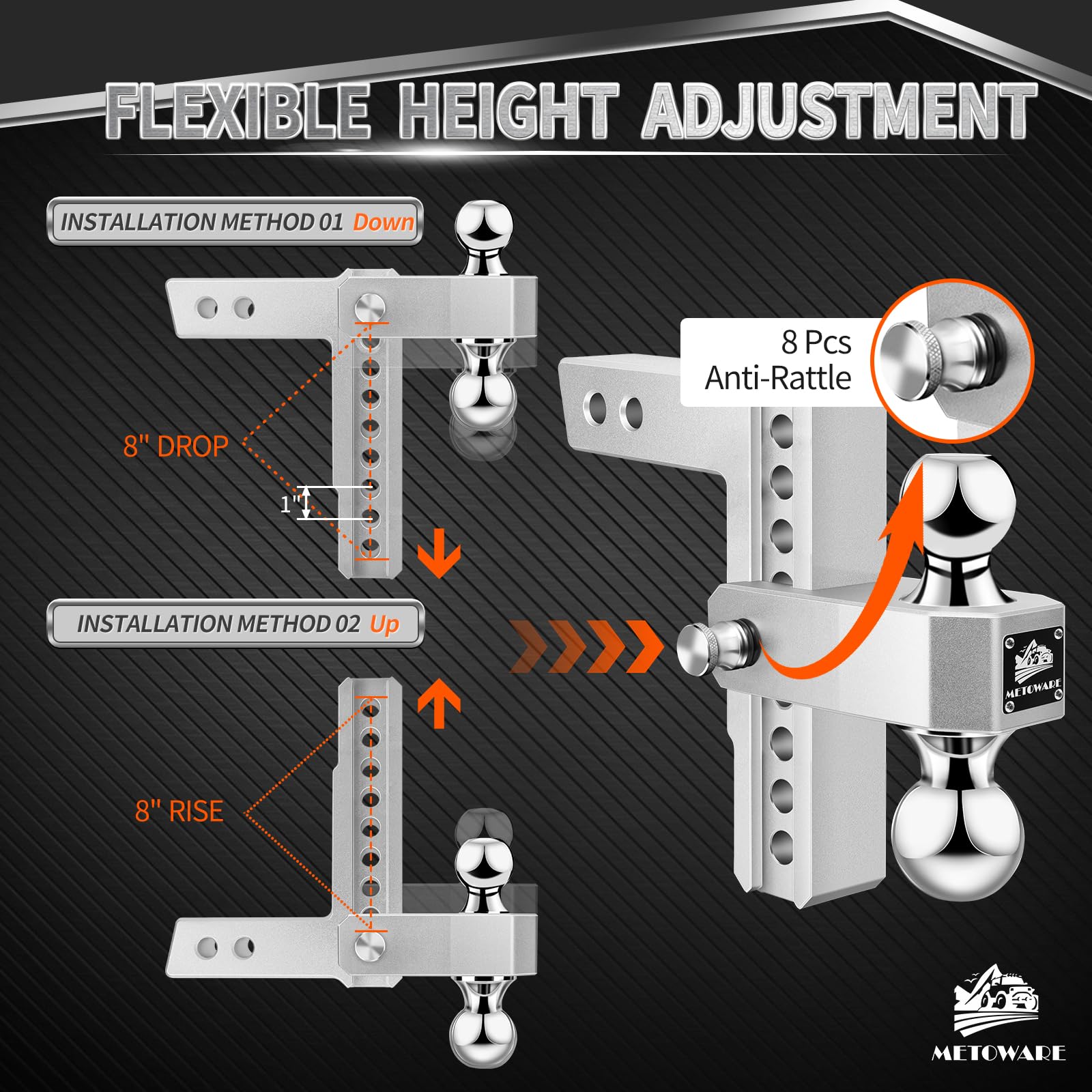 3. ALTURA DE AJUSTE DE 8″ – Nuestro enganche de remolque también ofrece una profundidad de caída de 8″ y una altura de elevación de 8″ para un ajuste fácil a 1 pulgada de velocidad para adaptarse a cualquier altura de remolque, por lo que el enganche de remolque puede ajustarse fácilmente para un remolque óptimo sin la necesidad de cambiar nunca de enganches para diferentes vehículos.