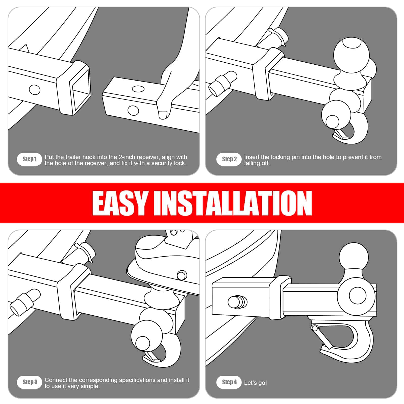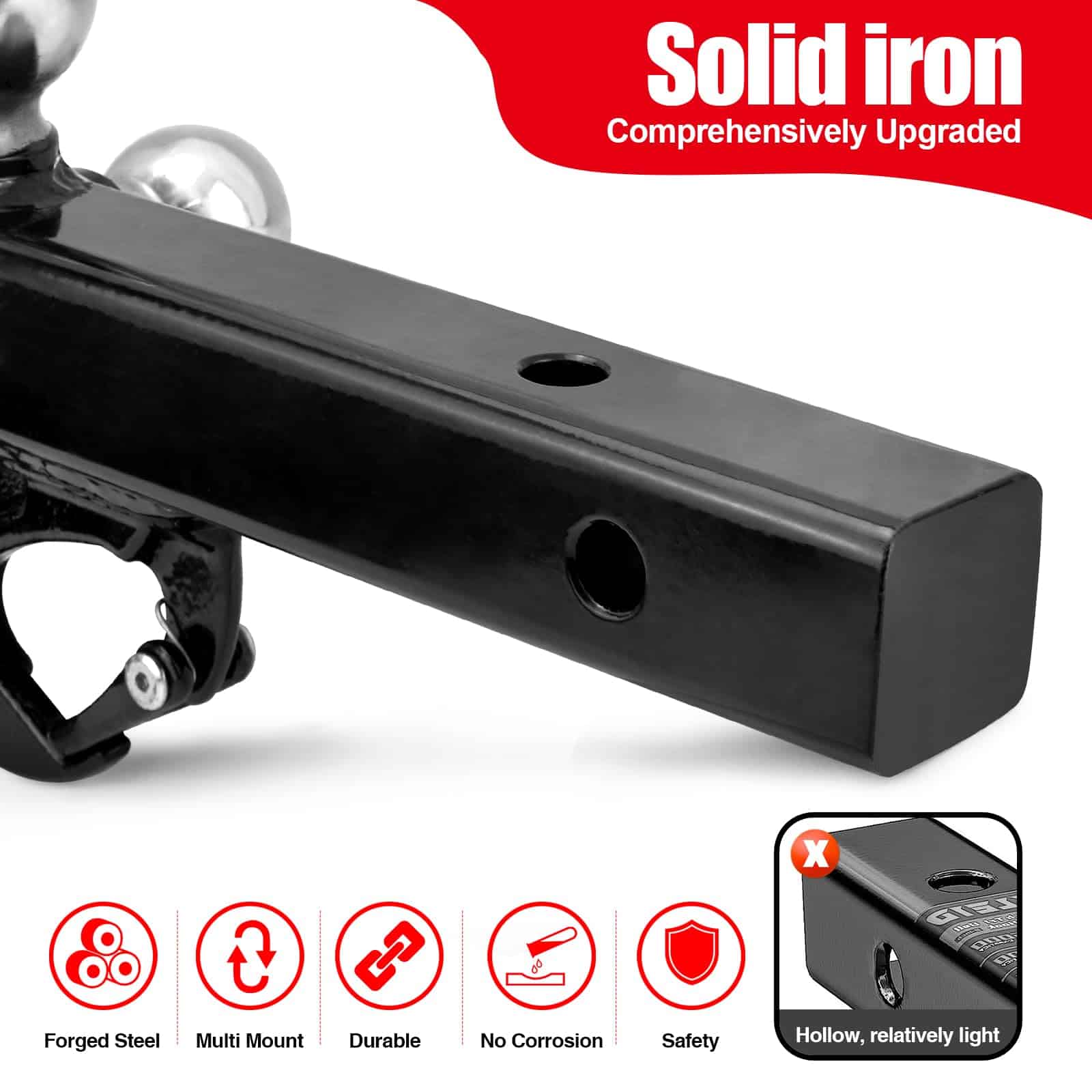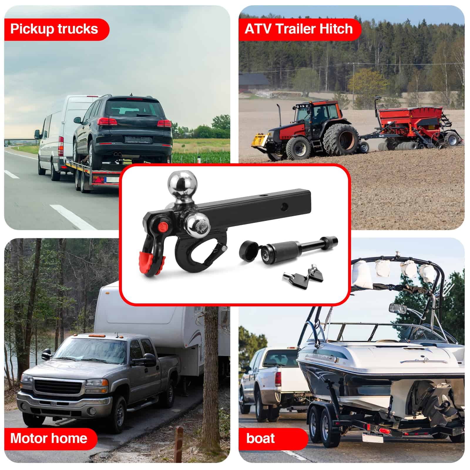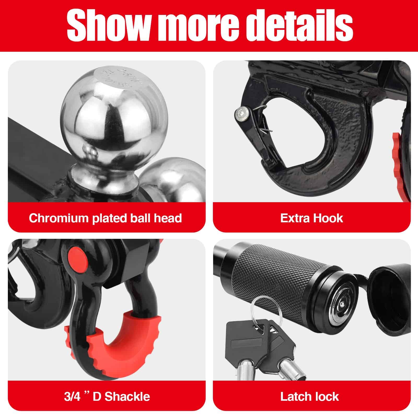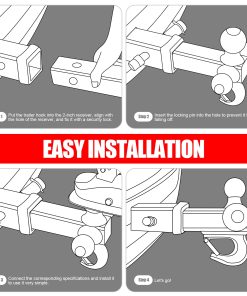 El Enganche de Remolque de 3 Bolas proporciona tres opciones diferentes disponibles: 1-7/8 pulgadas – GTW 3,500LBS; 2 pulgadas – GTW 5,000LBS; 2-5/16 pulgadas – GTW 7,500LBS; y con un gancho – GTW 10,000LBS de versatilidad y conveniencia añadidas para satisfacer diferentes necesidades.