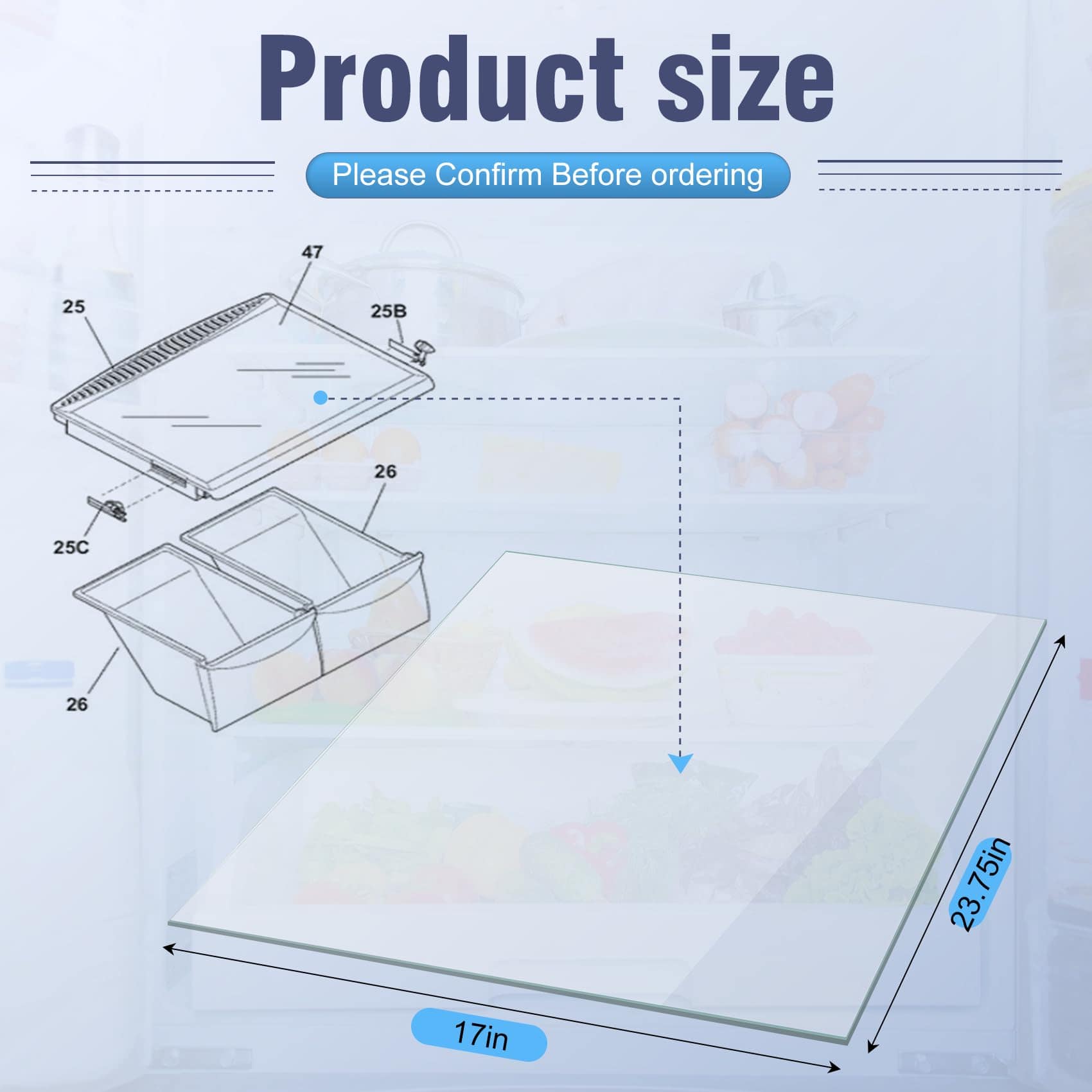 2. Tamaño del producto: 240350609 Repisa de vidrio para refrigerador mide 23.75″ x 17″, Asegúrese de un ajuste perfecto confirmando que su repisa de vidrio para verduras 240350609 coincide con estas dimensiones. El paquete incluye 1 X reemplazo de vidrio de cajón para verduras 240350609, 4x Individuales de tela tejida de vinilo/plástico.