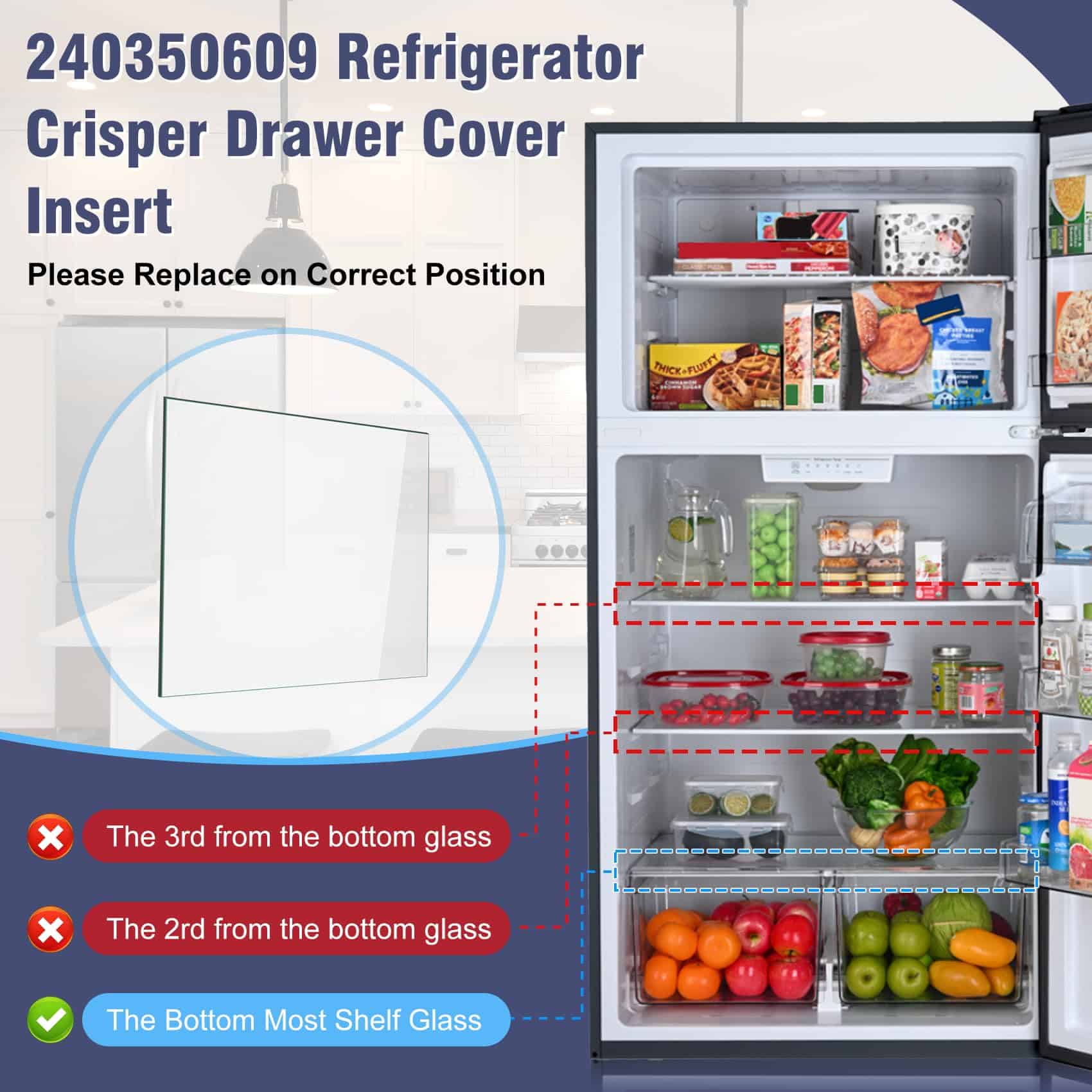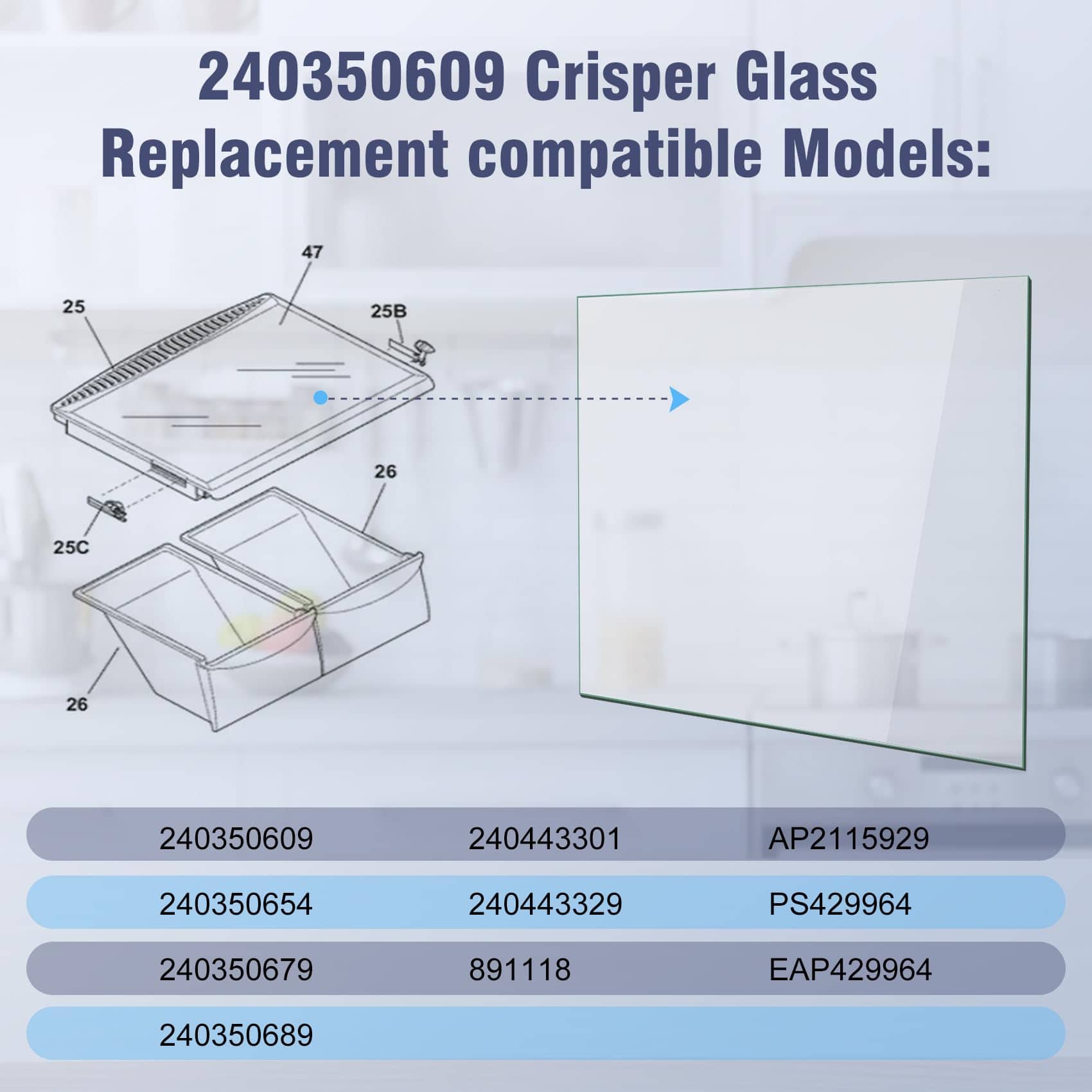 3. Números de pieza de repuesto: 240350609 Repisa de vidrio para refrigerador reemplaza 240350609, 240350654, 240350679, 240350689, 240443301, 240443329, 891118, AP2115929, PS429964, EAP429964. Ajuste perfecto y fácil de instalar.
