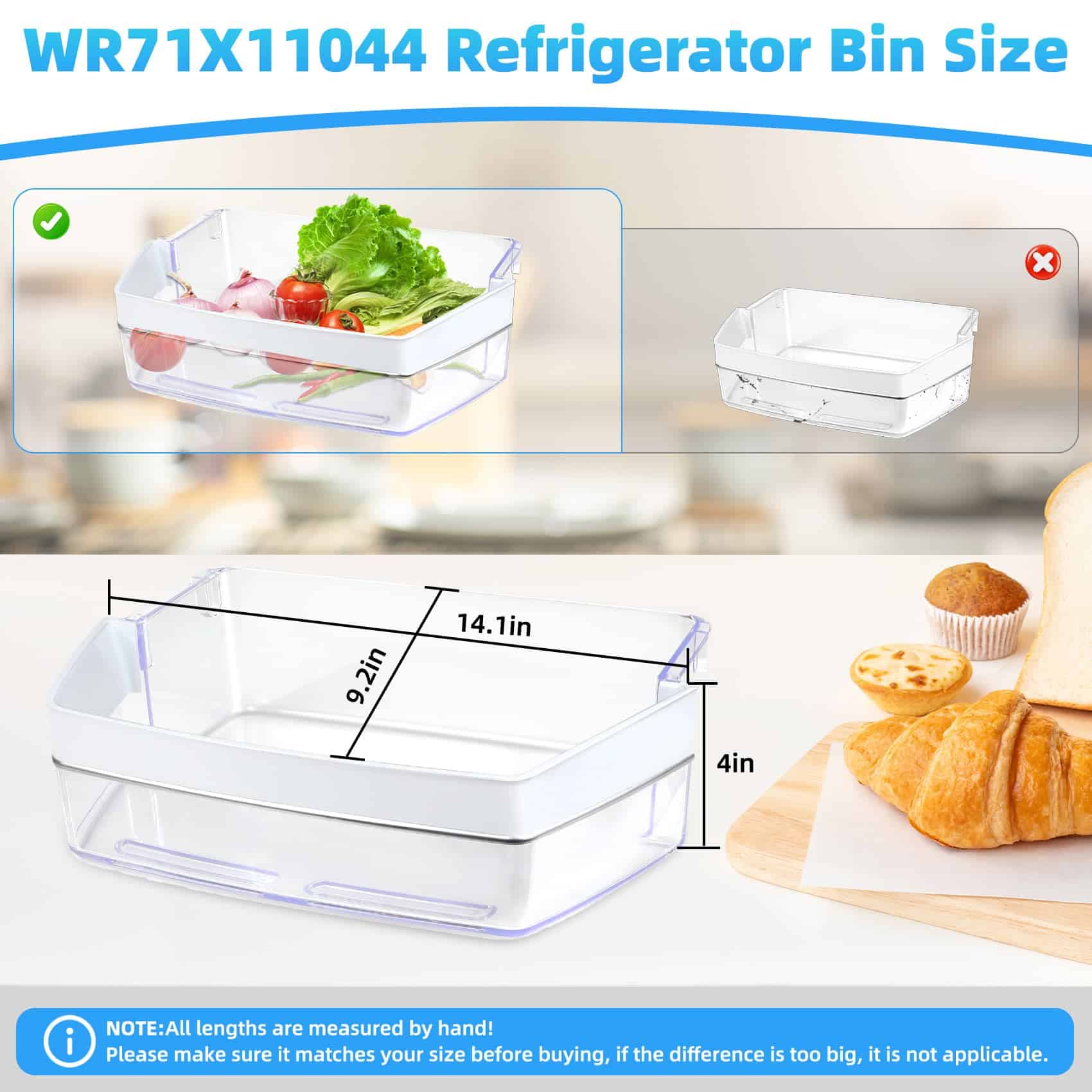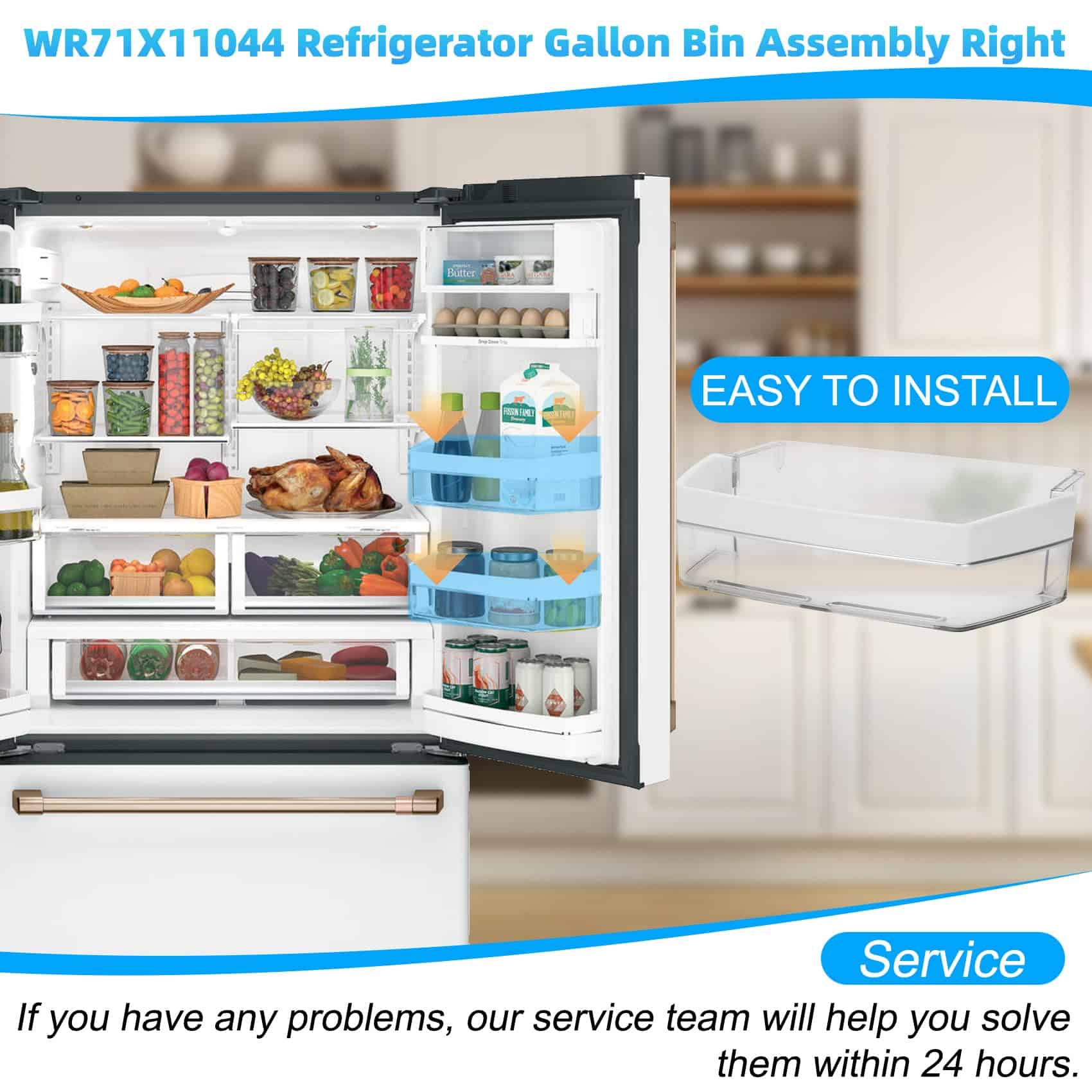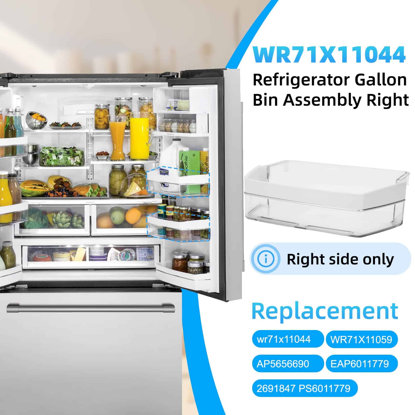 2. Número de Parte WR71X11044 bandeja de galón (derecha), Sustituye a: WR71X11059, 2691847, PS6011779, AP5656690, EAP6011779. La puerta izquierda del refrigerador no es aplicable.