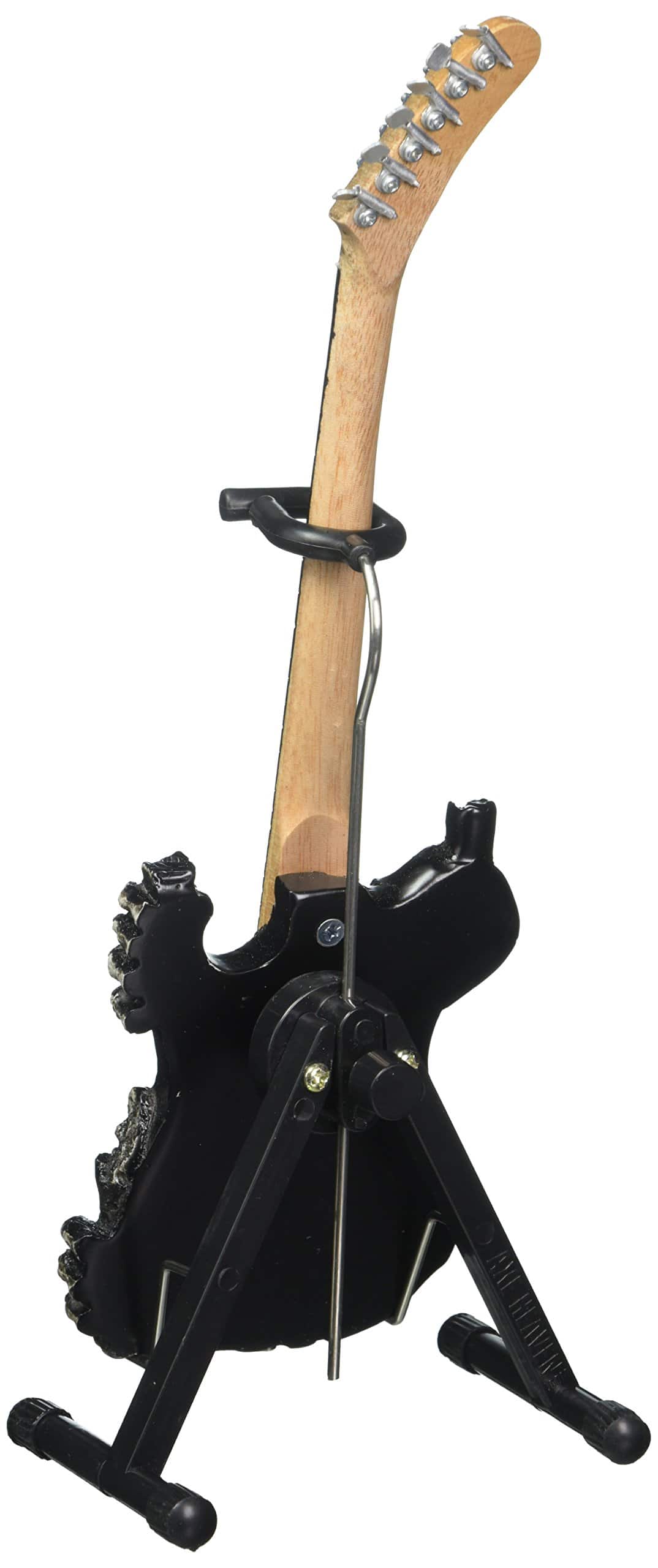 Cada réplica ornamental de guitarra en escala 1:4 está hecha a mano con madera maciza y clavijas de afinación de metal. Cada modelo de guitarra mide aproximadamente 10 pulgadas de longitud y viene completa con un soporte A-frame ajustable en miniatura de alta calidad y caja de regalo para guitarra. Las réplicas en miniatura de Axe Heaven se ven geniales pero no son tocables.