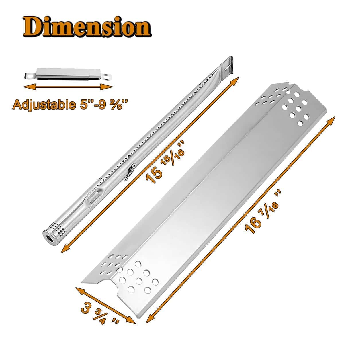 3. Product Materials & Size Includes 4 stainless steel heat plates, 4 stainless steel burners, 3 stainless steel adjustable crossover tube. Dimensions- Burner 15 15/16 X 1″, charbroil model G527-2200-W1 G356-2200-W1; Heat plate Dimensions:16 7/16″ x 3 3/4″, G527-0013-W1 Crossover Tube (Adjustable length 5 to 9.4 inch).