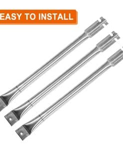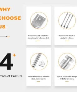 Repuesto de parrilla GRISUN para parrillas Oklahoma Joe Longhorn Combo que incluye un quemador de parrilla de acero inoxidable, placa de calor esmaltada y tubos cruzados ajustables. Está diseñado para adaptarse perfectamente a las parrillas Oklahoma Joe’s Longhorn Combo y otras parrillas compatibles. El paquete incluye 3 tubos de quemador de parrilla, 3 escudos de placa de calor y 2 tubos cruzados ajustables para una fácil instalación. El quemador de acero inoxidable no magnético ofrece una resistencia superior a la corrosión y al calor, garantizando una experiencia de parrilla segura y duradera. La placa de calor esmaltada de 18GA proporciona una distribución uniforme del calor, permitiendo mantener la temperatura de la parrilla adecuadamente. El tubo cruzado ajustable asegura que todos los 3 quemadores pueden encenderse con cada ignición para un rendimiento estable y excelente. Con este repuesto de parrilla GRISUN, podrás dominar el calor, cocinar alimentos fácilmente y convertirte en un experto en barbacoa.