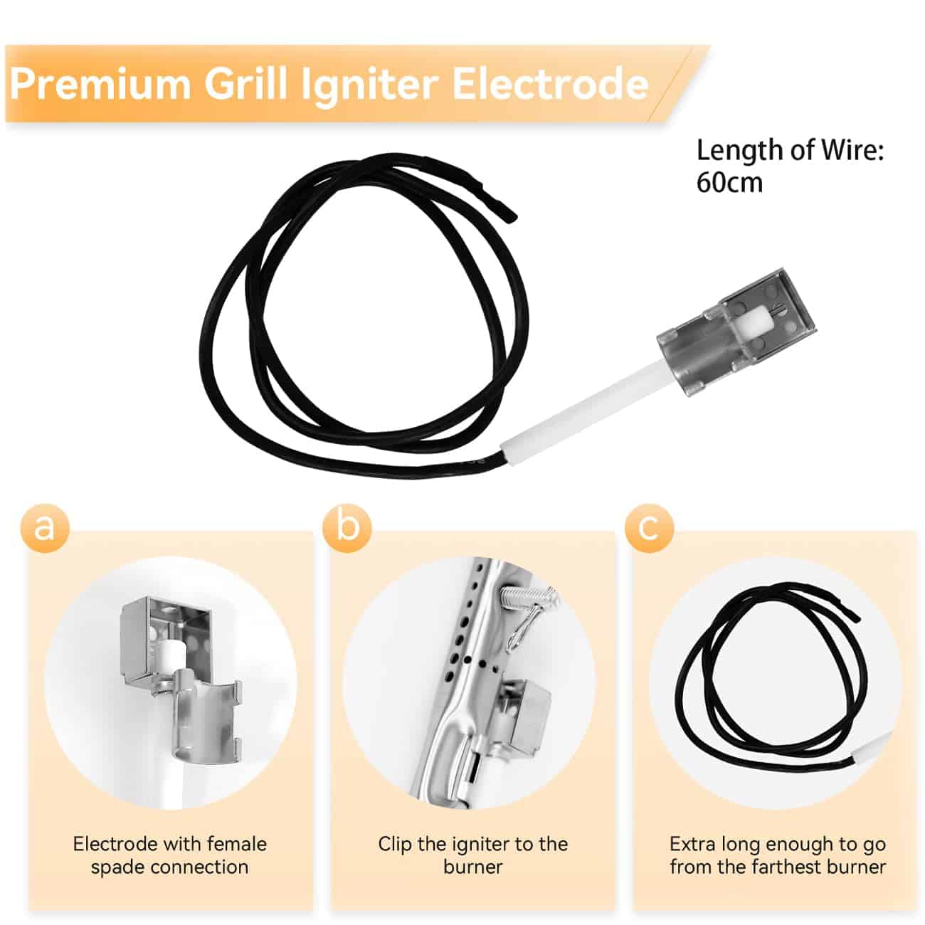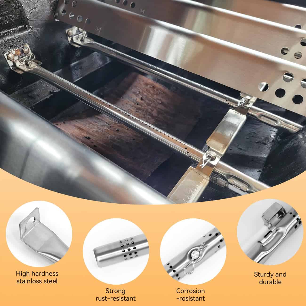 5. DIMENSIONES – Quemador de acero inoxidable 17-3/4″ x 3/5″; Número de piezas originales: G470-5200-W1, G321-4C00-W1; Placas de calor de acero inoxidable dimensiones 16 15/16″ X 2 1/12″; Número de piezas originales: G470-0004-W1, G470-0004-W1A; El tubo de cruce ajustable se puede ajustar de 5 a 9 pulgadas, lo suficientemente largo para adaptarse a su parrilla. Número de piezas originales: G432-001D-W1