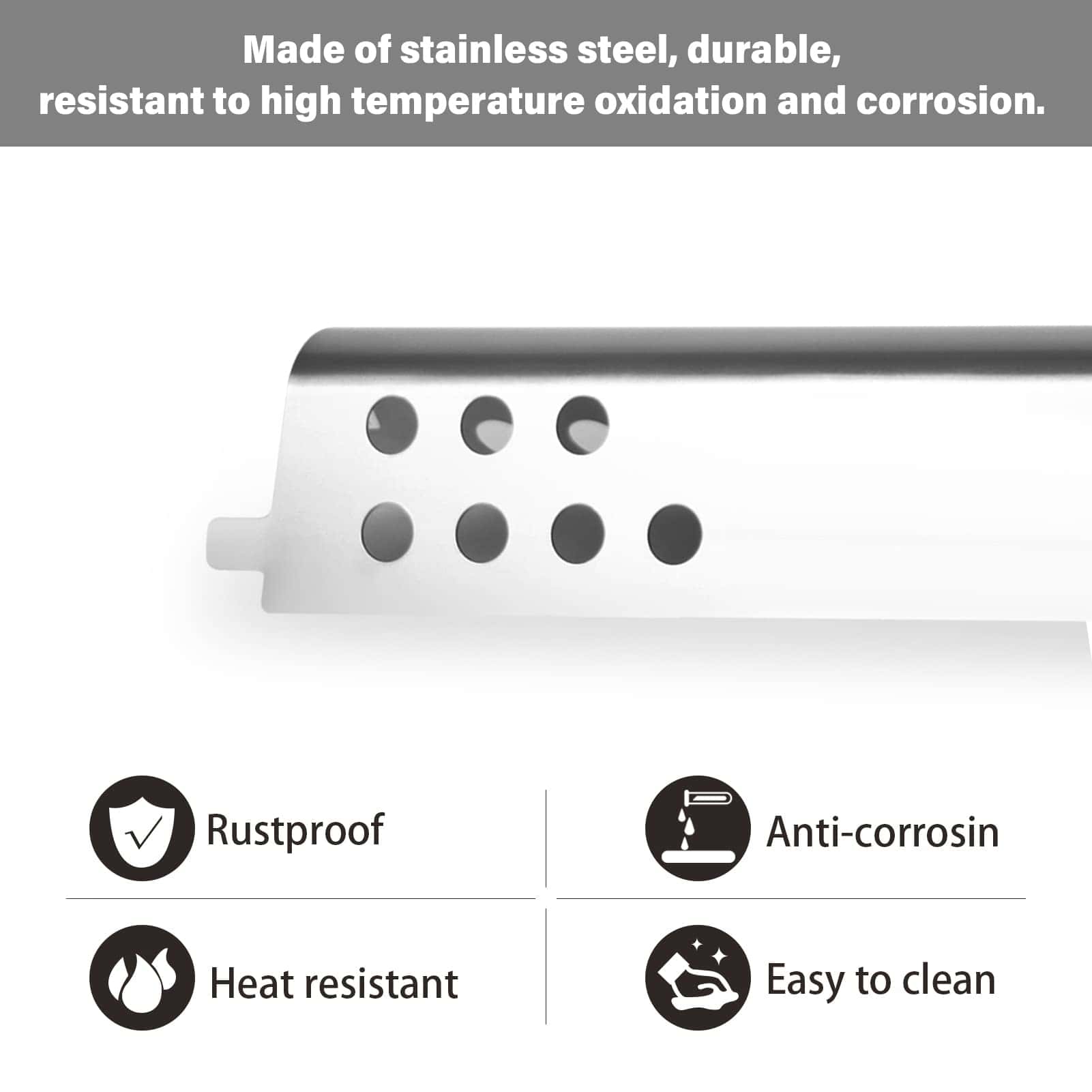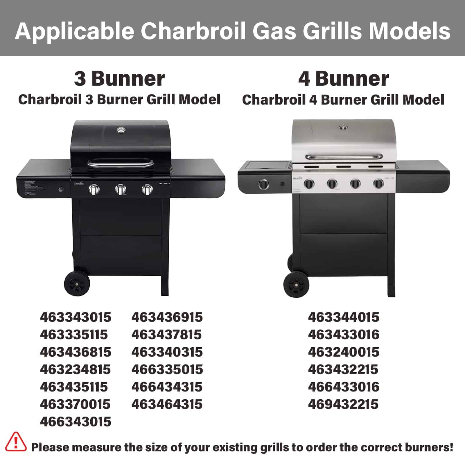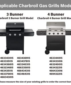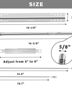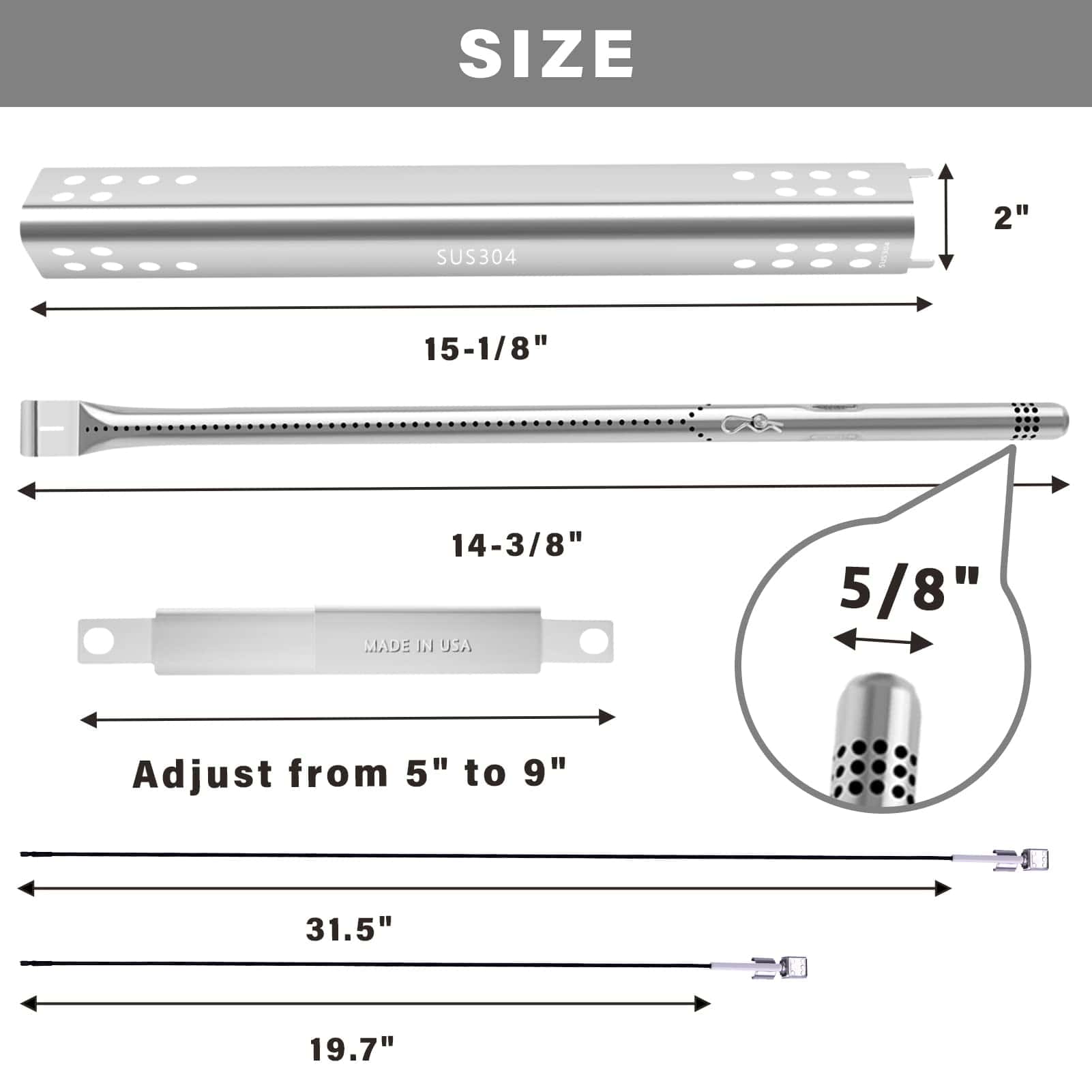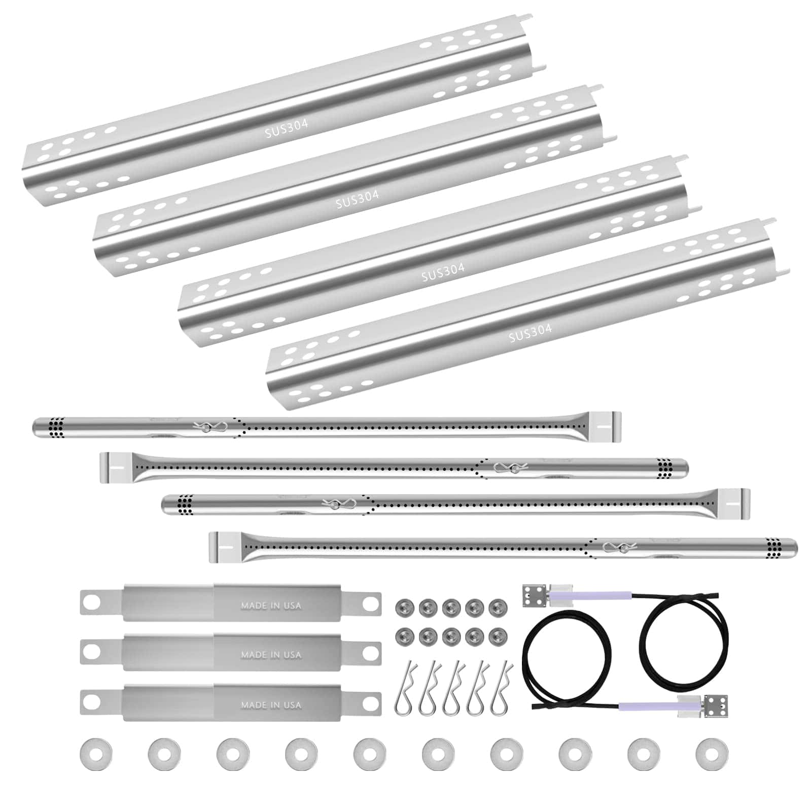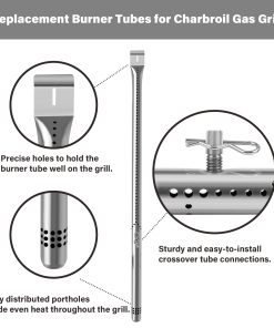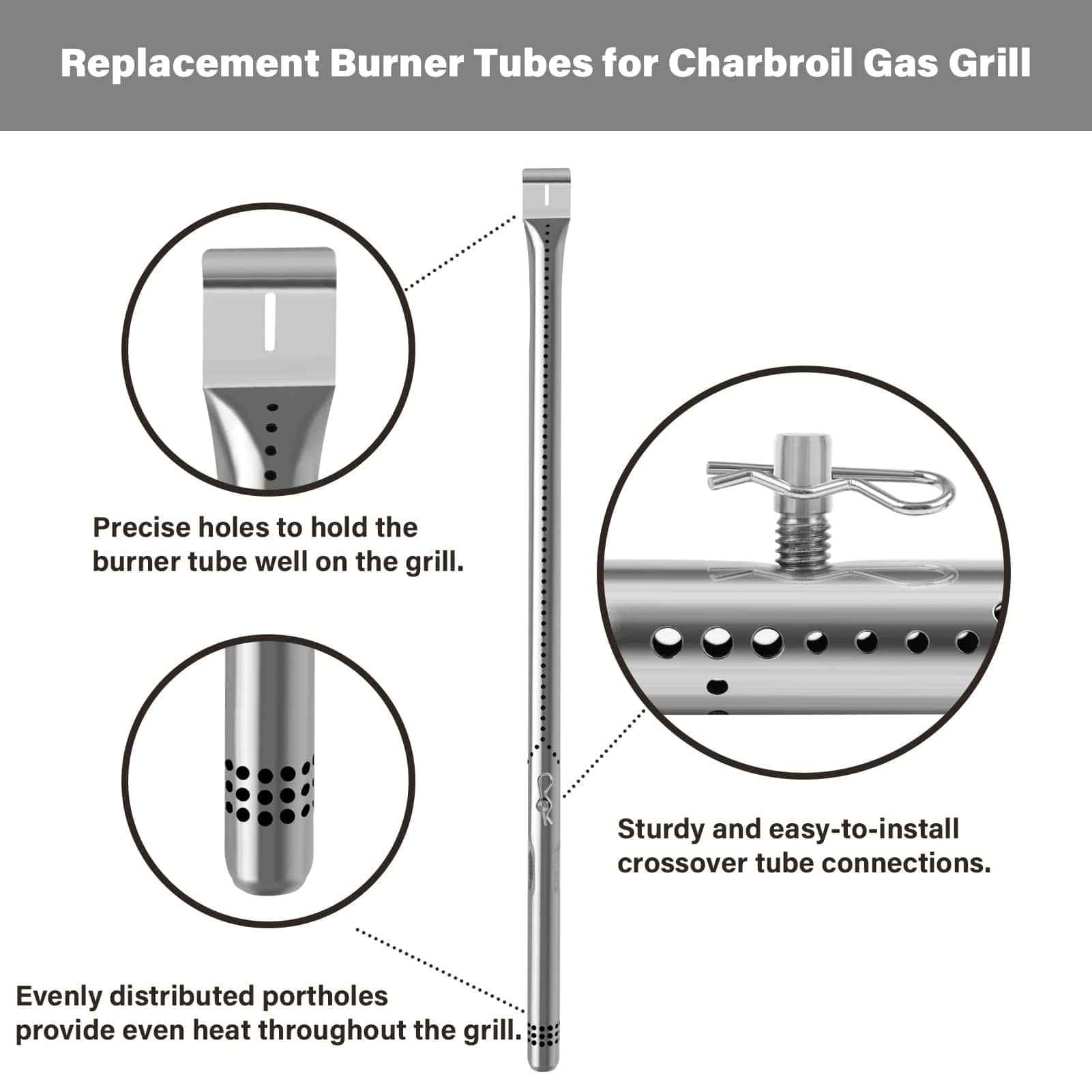 Reemplazo perfecto para parrilla de gas de 4 quemadores de la serie Charbroil Advantage 463344015 | 463433016 | 463240015 | 463432215 | 466433016 | 469432215. Los números de parte originales de las tuberías de quemador de parrilla Charbroil: G432-8M00-W1; Números de parte originales de los tent del calor: G458-0018-W1; Números de parte originales de los tubos de transporte: G432-001D-W1. Mide el tamaño de tus parrillas existentes para pedir el tamaño correcto. Clip el electrodo al quemador; Adjunta los quemadores a los soportes en el firebox; Ajusta la longitud del tubo de transporte e instálalo en los quemadores; Coloca los tent del calor en los quemadores, ¡el ensamblaje está completo! El kit de quemador de parrilla está hecho de acero inoxidable duradero. El material tiene las características de resistencia a altas temperaturas y resistencia a la corrosión, puede usarse durante mucho tiempo y no es fácil de oxidar y deformarse.