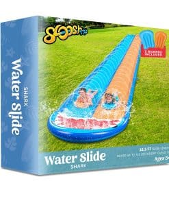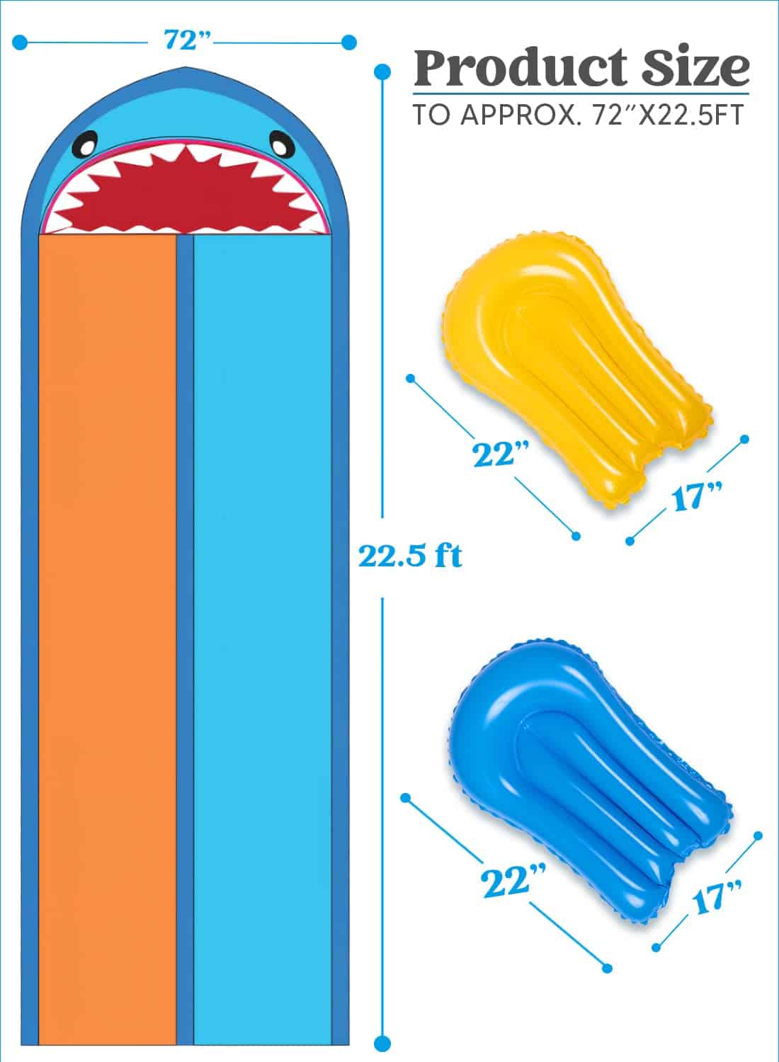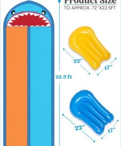 INCLUYE. Nuestra Resbaladilla de Agua Doble de Tiburón incluye una resbaladilla de agua diseñada de tiburón de 22.5ft x 6ft, 2 tablas inflables para surfear, 21.7″ x 16.5″, con rociador incorporado en el medio, 6 estacas para el suelo, columnas laterales y terminales llenables de agua/aire para protección adicional