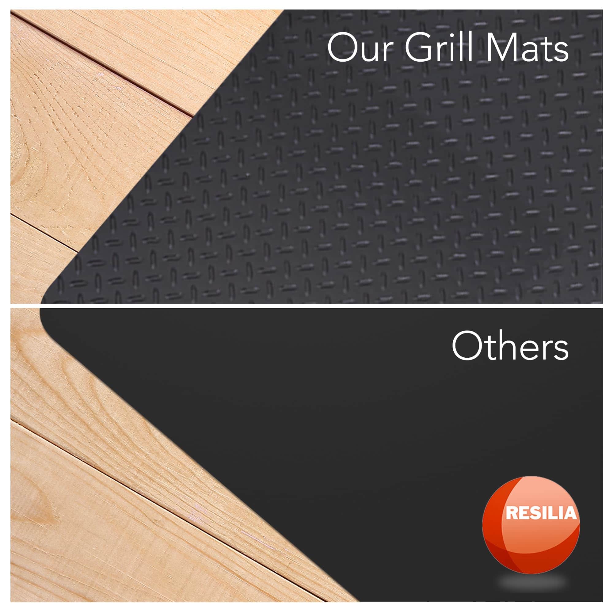 1. ¡Mejora tu juego de parrilla!: Protege tu zona de parrilla con el tapete para parrilla resistente al fuego y antideslizante de Resilia, protegiendo tu espacio de grasa, aceite, óxido, carbón y desgaste sin el riesgo de daños costosos; No apto para cubiertas compuestas; puede causar decoloración.