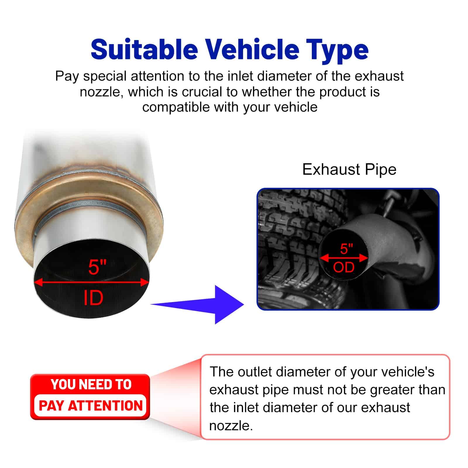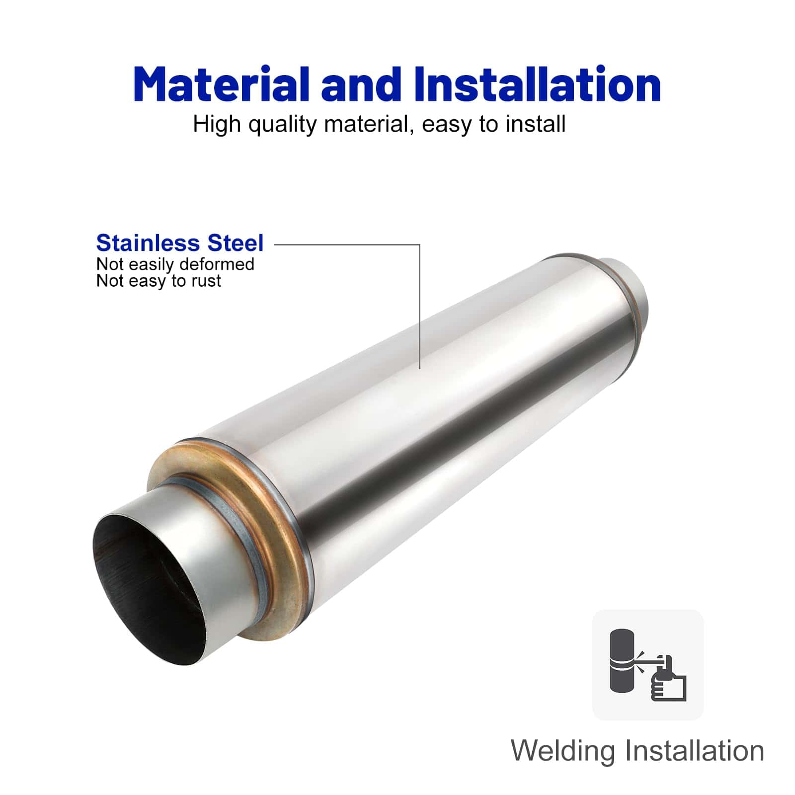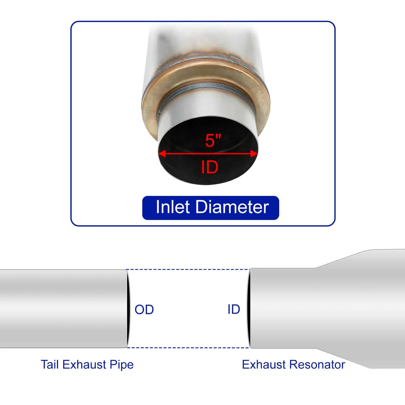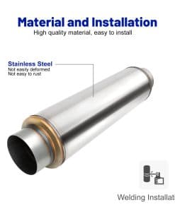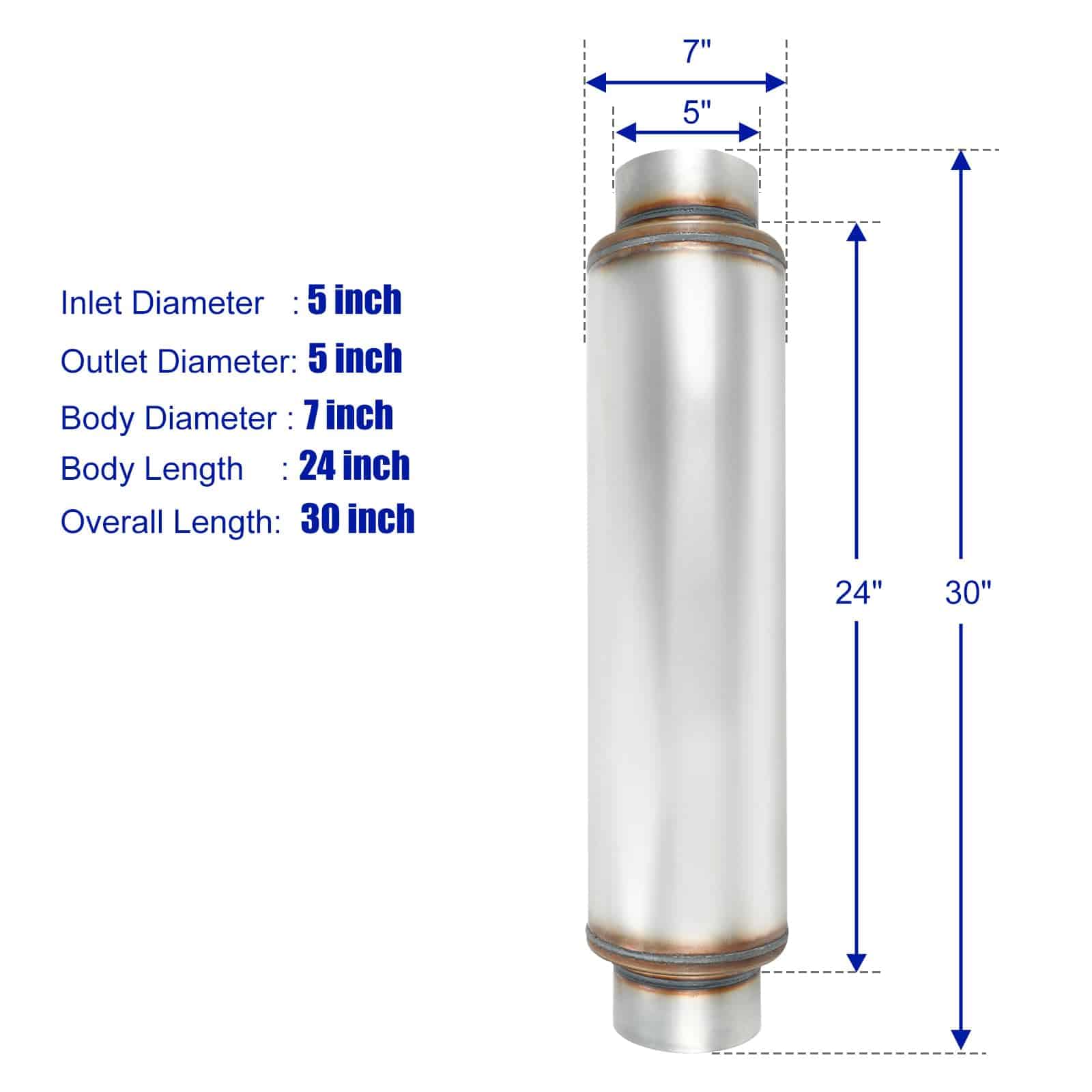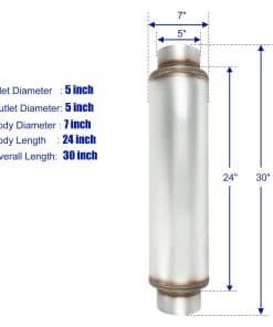 Resonador de escape de alto rendimiento con cuerpo de 24 pulgadas de longitud y 7 pulgadas de diámetro. Con entrada y salida de 5 pulgadas, ideal para mejorar el rendimiento de su vehículo. Fabricado en acero inoxidable 409 para una mayor durabilidad y resistencia a la corrosión. Diseñado para una conexión sencilla a través de tuberías, este silenciador recto proporciona un sonido de escape mejorado y un aspecto elegante a su automóvil.
