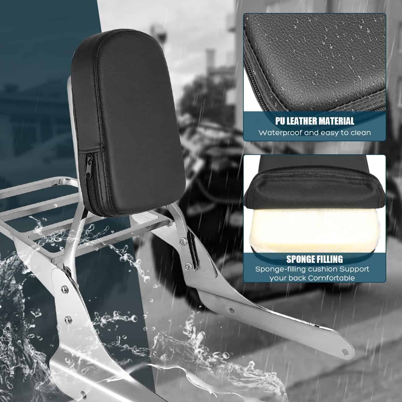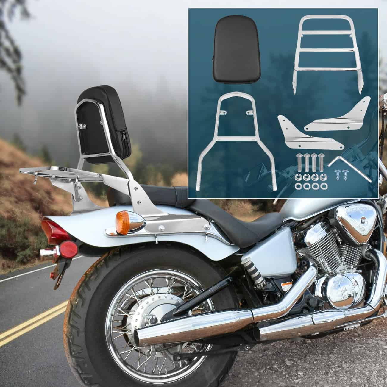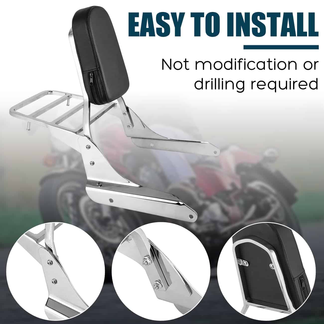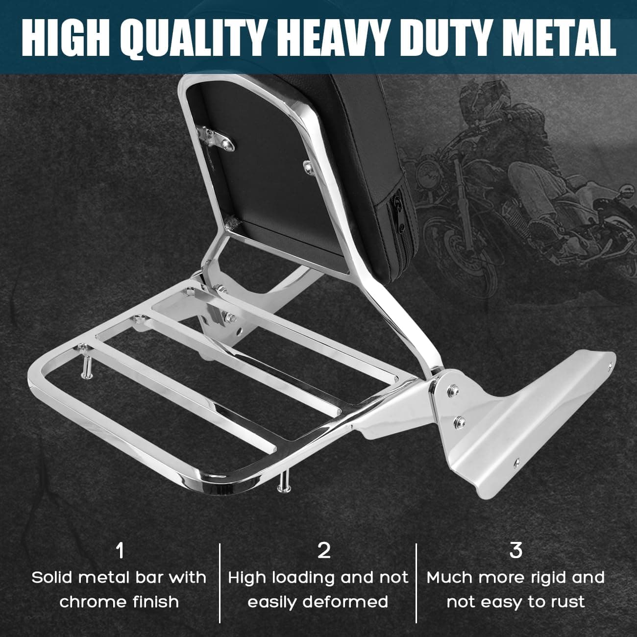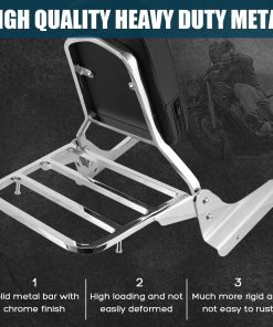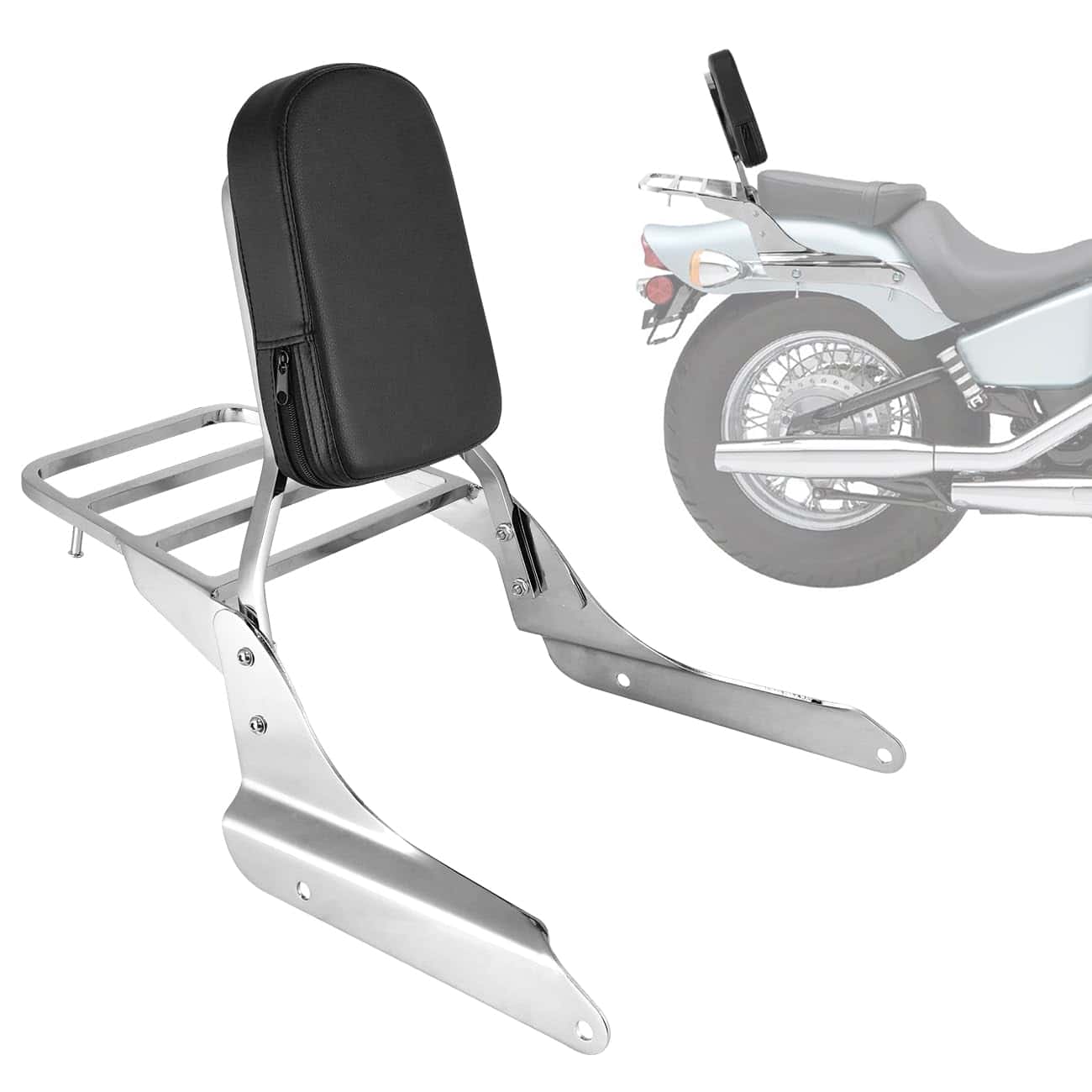 Especificaciones: Material de los soportes: Hierro de alta calidad. Material de la almohadilla: Cuero suave. Color: Cromado. Características: 1. Tecnología de procesamiento: Prueba de resistencia al polvo y UV durante 36 horas, prueba de choque, método de prueba de rejilla para probar la adherencia. El cromado puede ser probado por pulverización de sal durante 96 horas neutra, capa de cobre 35um. Grado de cromado 8 o más. Los fabricamos con técnicas profesionales y gran calidad. 2. Este respaldo no solo puede decorar tu motocicleta, sino que también puede brindarte gran ayuda en tus viajes. 3. Fácil de instalar. Las placas laterales estándar fijan el respaldo en los agujeros de montaje originales. Paquete incluido: 1 respaldo, 1 parrilla y accesorios de tornillo necesarios. Nota: 1. Por favor, verifica el modelo de tu motocicleta y confirma que este artículo es adecuado antes de ordenar. 2. Se recomienda siempre la instalación profesional.