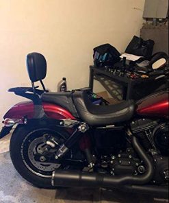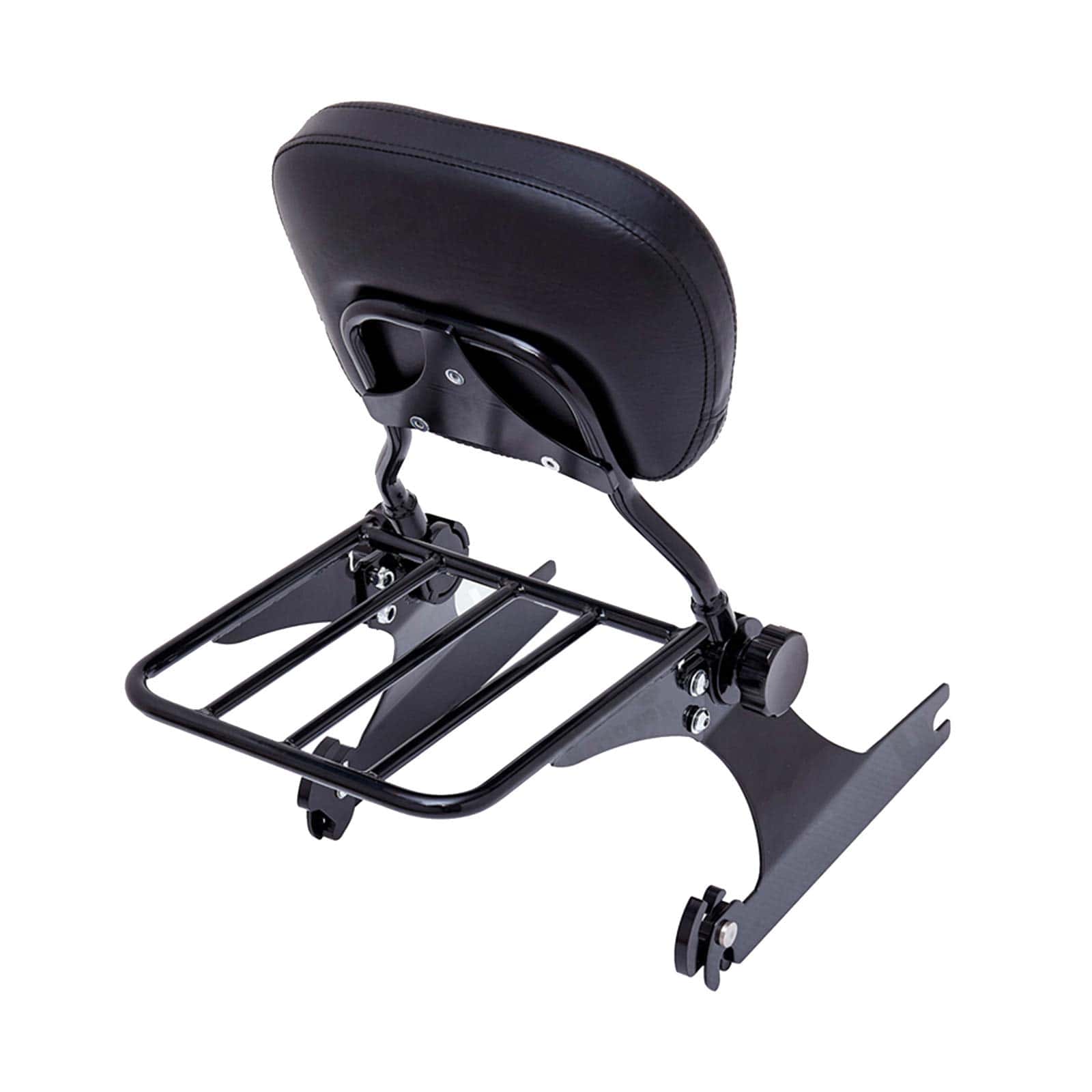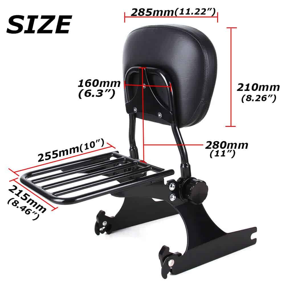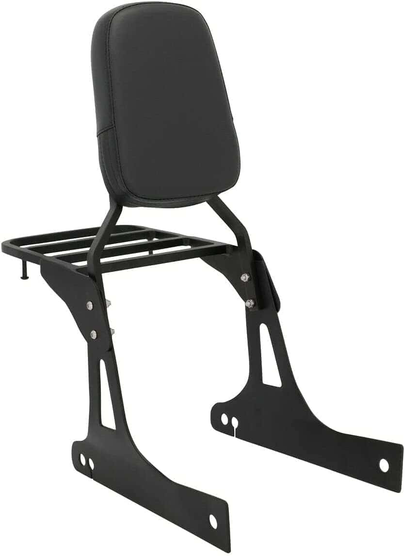 Material: Acero Metal & Cuero Sintético (Construcción Resistente). Respaldo de pasajero trasero desmontable del sissy bar Juego de cojín de respaldo delgado, barra estilizada con un ángulo de patada superior para un aspecto bobber clásico. Relleno de esponja en el cojín, suficientemente suave para proporcionar un apoyo completo en la parte baja de la espalda. Mejore la comodidad del pasajero trasero en viajes largos. Paquete incluido: 1 Pieza de Respaldo Sissy Bar con Cojín con parrilla para equipaje.