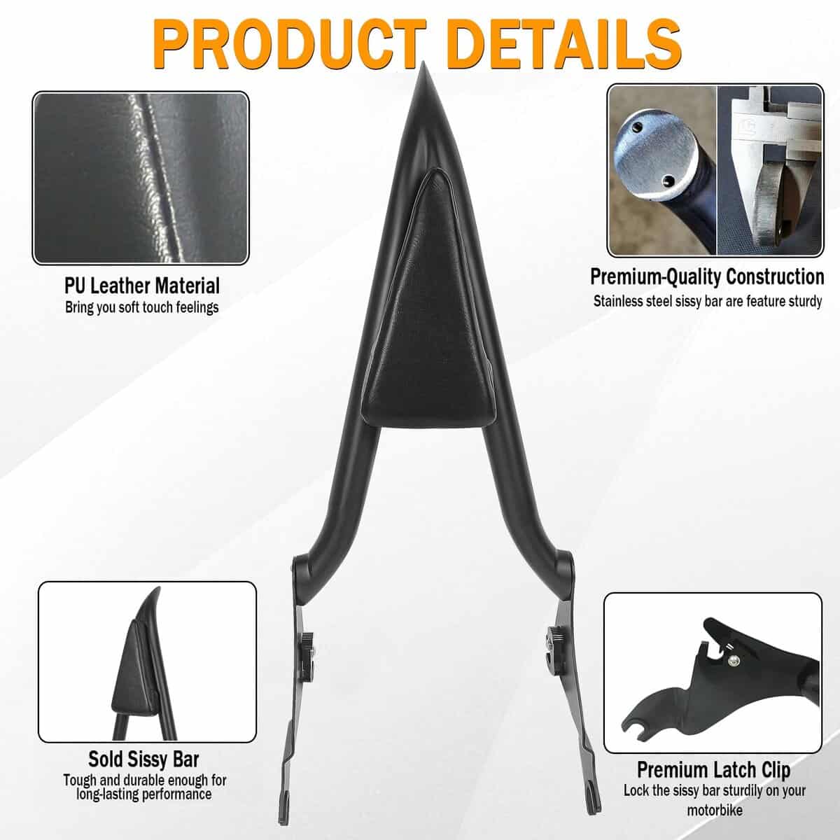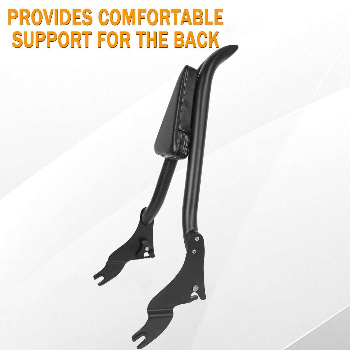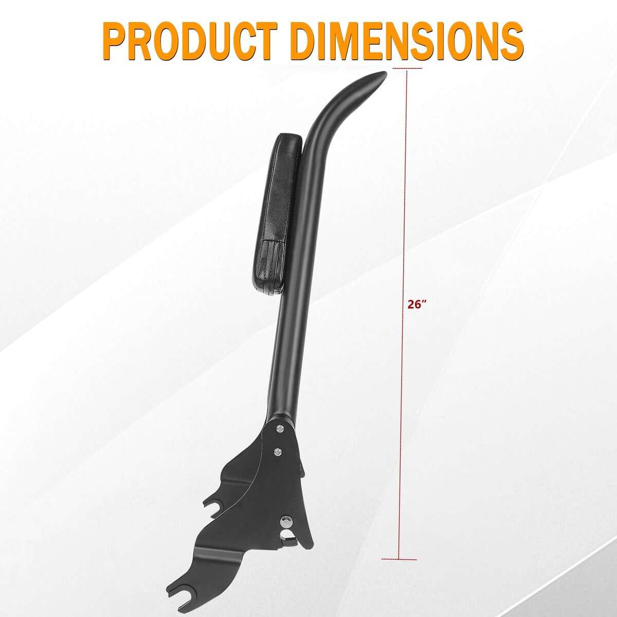 Especificaciones: Tipo: Sissy Bar Condición: Nuevo Color: Negro Mate Material: Fabricado en aluminio macizo de alta resistencia y acero de calidad premium Características: Respaldo sissy bar personalizado, proporciona un lugar más cómodo para el pasajero. Fácil instalación, te permite quitarlos fácilmente cuando no los necesites. Ajuste: Se adapta a Harley Touring Road King Road Glide Street Glide Electra Glide con una sissy bar de 26 pulgadas Se ajusta universalmente a los modelos de turismo de Harley 09 en adelante (Nota: debe estar equipado con los Kits de Hardware de Atraque requeridos – NO INCLUÍDOS) Paquete: 1 pieza sissy bar y kits de montaje (como se muestra en la imagen) Nuestros servicios: Nuestro objetivo es la satisfacción del cliente al 100%. Por favor, contáctenos a través de la tienda si tiene alguna pregunta.