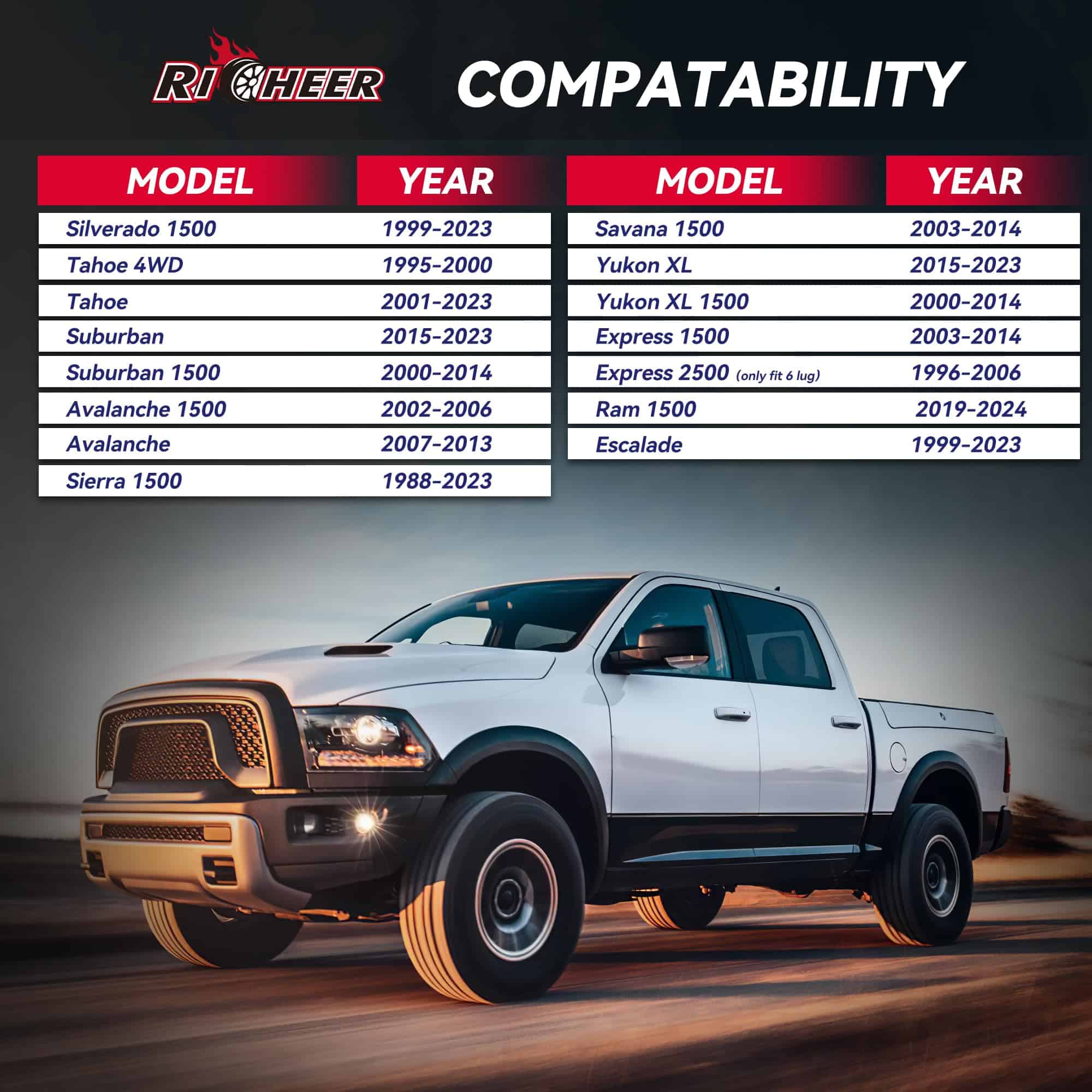 Compatibilidad con una amplia gama de vehículos, incluidos Silverado 1500, Tahoe, Suburban, Sierra 1500, Savana 1500, Yukon XL, Express 1500, Escalade y más. Hechos de aleación de aluminio forjado 6061-T6 con alta precisión y estabilidad gracias al proceso de mecanizado CNC. Incluye 4 separadores de rueda centrados en el cubo, pernos de alta resistencia preinstalados y garantía de dos años de Richeer para cubrir cualquier defecto de material y mano de obra.
