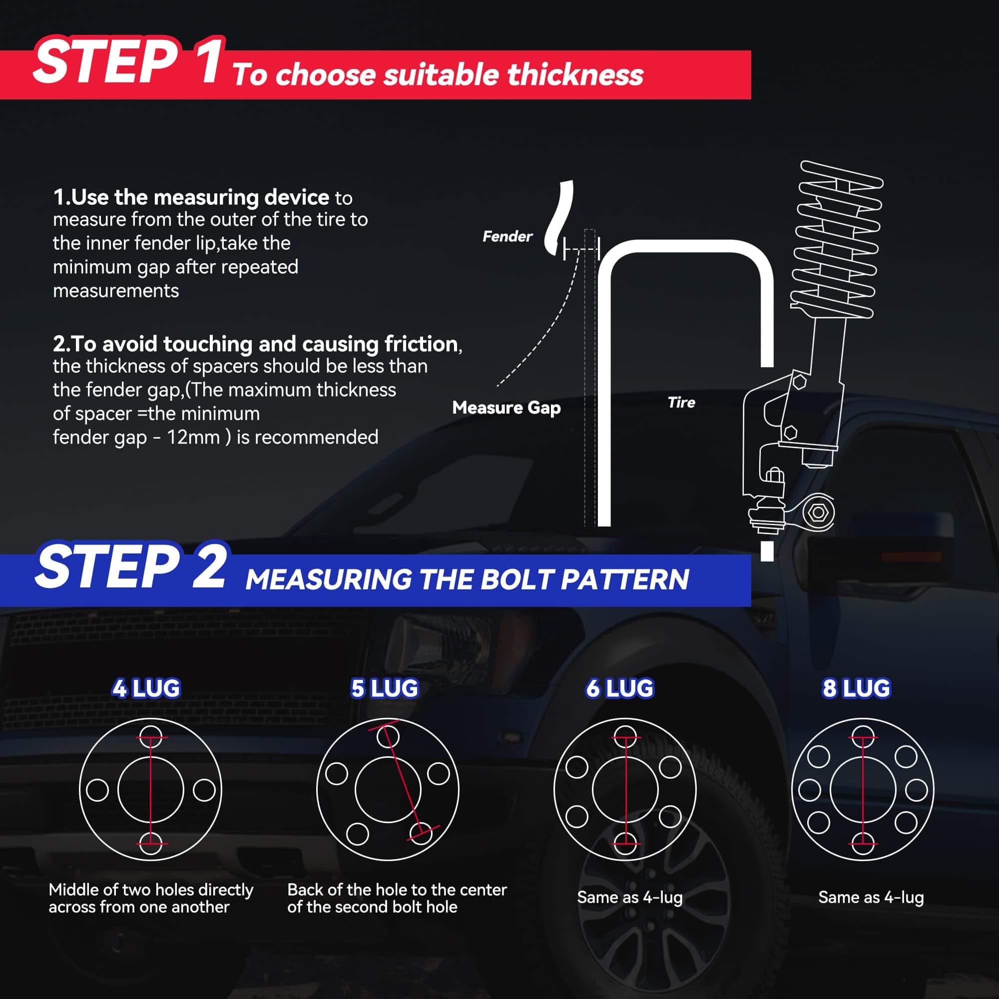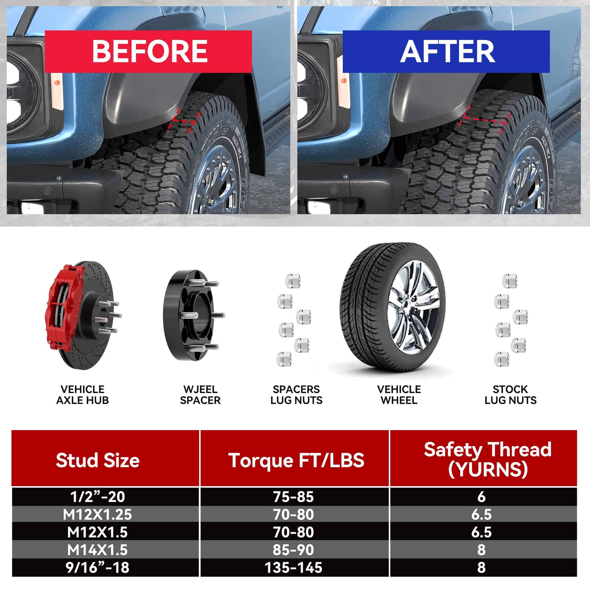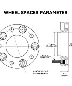 Especificaciones de los Separadores de Rueda Cantidad: Cuatro (4) Espesor: 1.5″ (38mm) Patrón de Pernos: 5×139.7mm o 5×5.5 Centro de Buje: 77.8mm Paso de Rosca del Perno/Tuerca: 9/16-18 Material: Aluminio de Grado Aeroespacial T6 con pernos de grado 12.9 PAQUETE INCLUYE 4 x separadores de rueda hubcentric (1.5″ por unidad) 2 x bloqueo de rosca de alta resistencia (rojo) 2 x manual de usuario. Notas: Una caja de color incluye 2 separadores de rueda, 1 bloqueo de rosca y 1 manual de usuario. Función: Aumentar el espacio libre para ruedas más grandes o más anchas y mejorar las características de manejo/estabilidad y espacio de freno. Dándole a su vehículo una apariencia más agresiva. Compatibilidad 2006-2009 Aspen 2005-2011 Dodge Dakota 2004-2009 Dodge Durango 2002-2010 Dodge Ram 1500 2011 Ram 1500 INFORMACIÓN DE SEGURIDAD IMPORTANTE Nunca modifique el separador de rueda/adaptador. Nunca quite los pernos de fábrica instalados en el separador de rueda/adaptador.