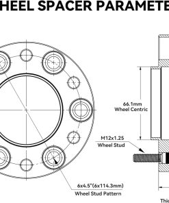 4PCS, 2» de espesor | 6×4.5″ (6×114.3mm) Patrón de Perno del Vehículo | 6×4.5″ (6×114.3mm) Patrón de Perno de la Rueda | 66.1mm Diámetro del Buje Central | Pernos con Rosca 12×1.25. Ajuste perfecto para Frontier 2005-2023, Pathfinder 2005-2014 (Solo vehículos de 6 pernos) y Xterra 2005-2015. Par de torsión recomendado: 70-80 FT/LBS.