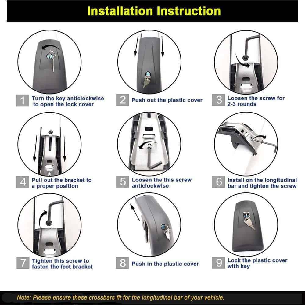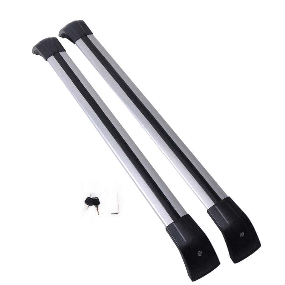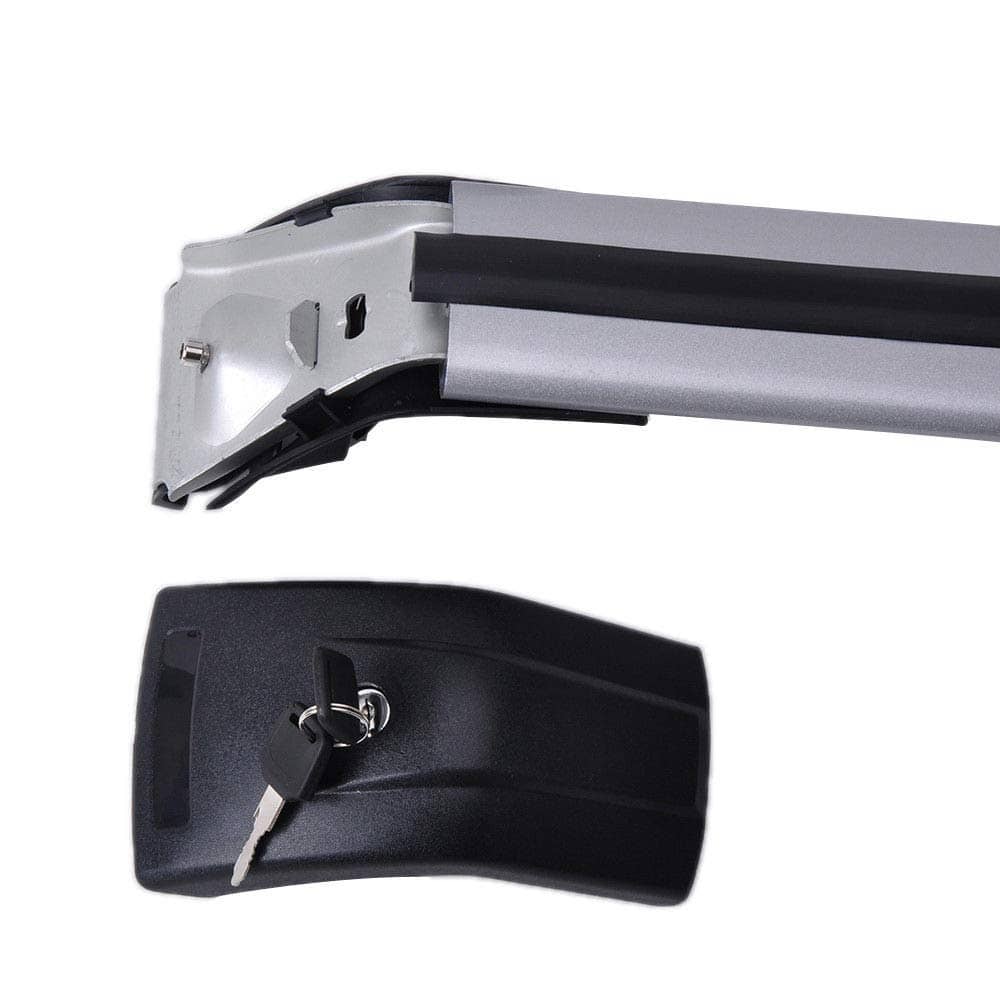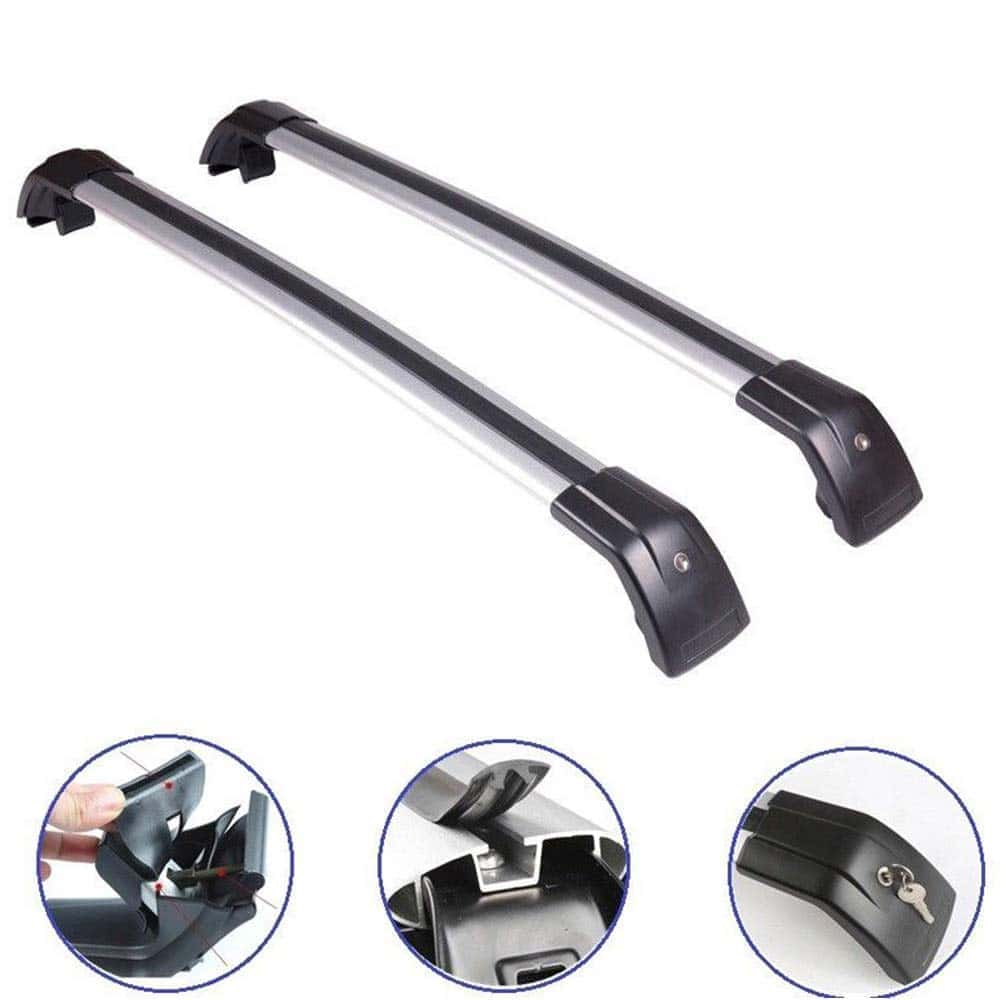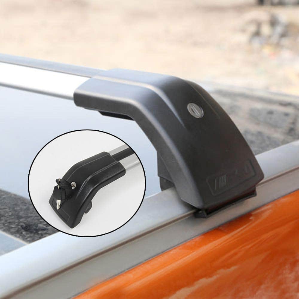Descripción: Abrazaderas ajustables para una fácil instalación. Tira de goma incluida para mayor agarre. Se incluyen cerraduras y llaves para protección antirrobo. Construcción sólida para una capacidad de carga de hasta 100 kg. La aleación de aluminio de grado arquitectónico es antienvejecimiento, antirrestante y anticorrosión. Ideal para cajas de techo, bolsas y portabicicletas montados en el techo.