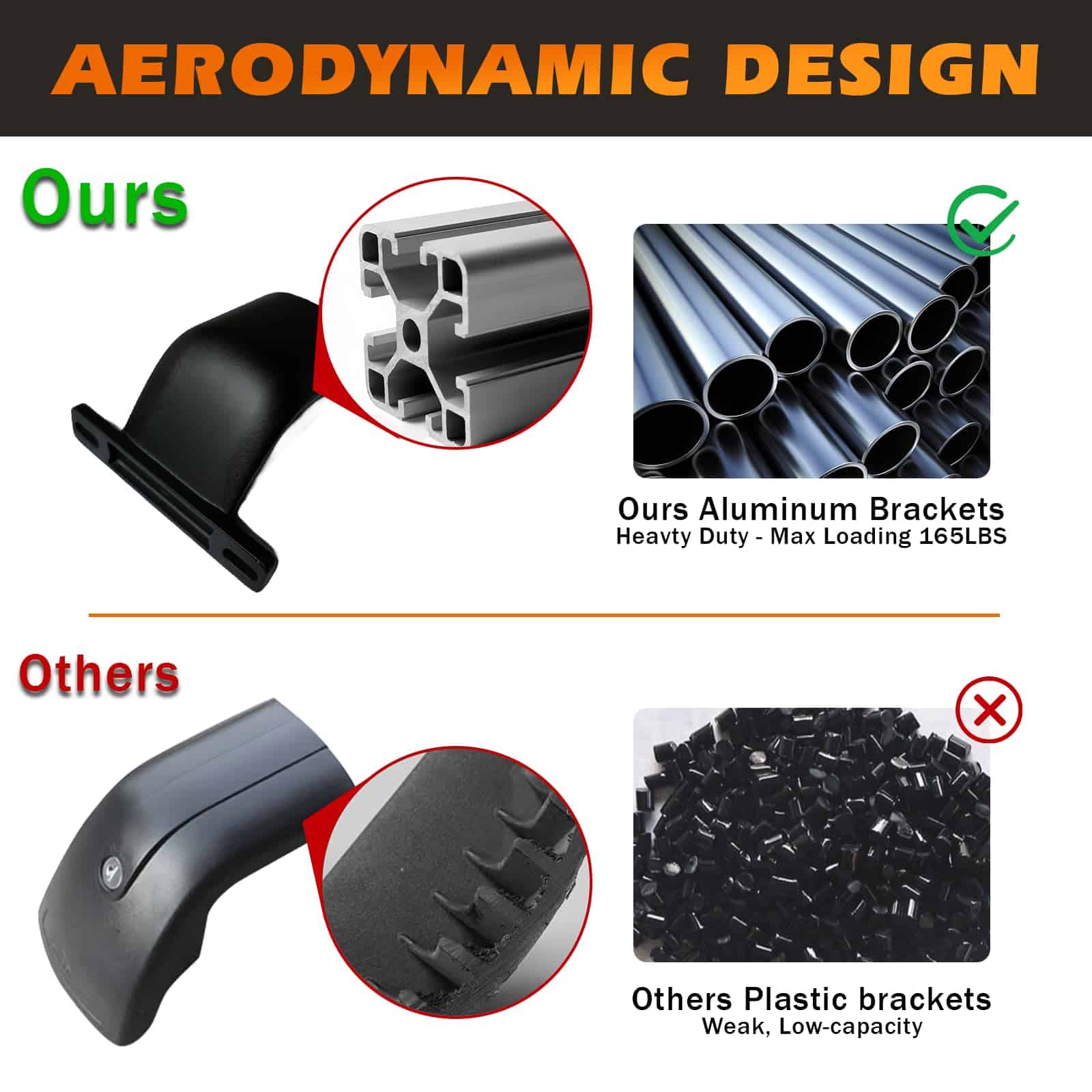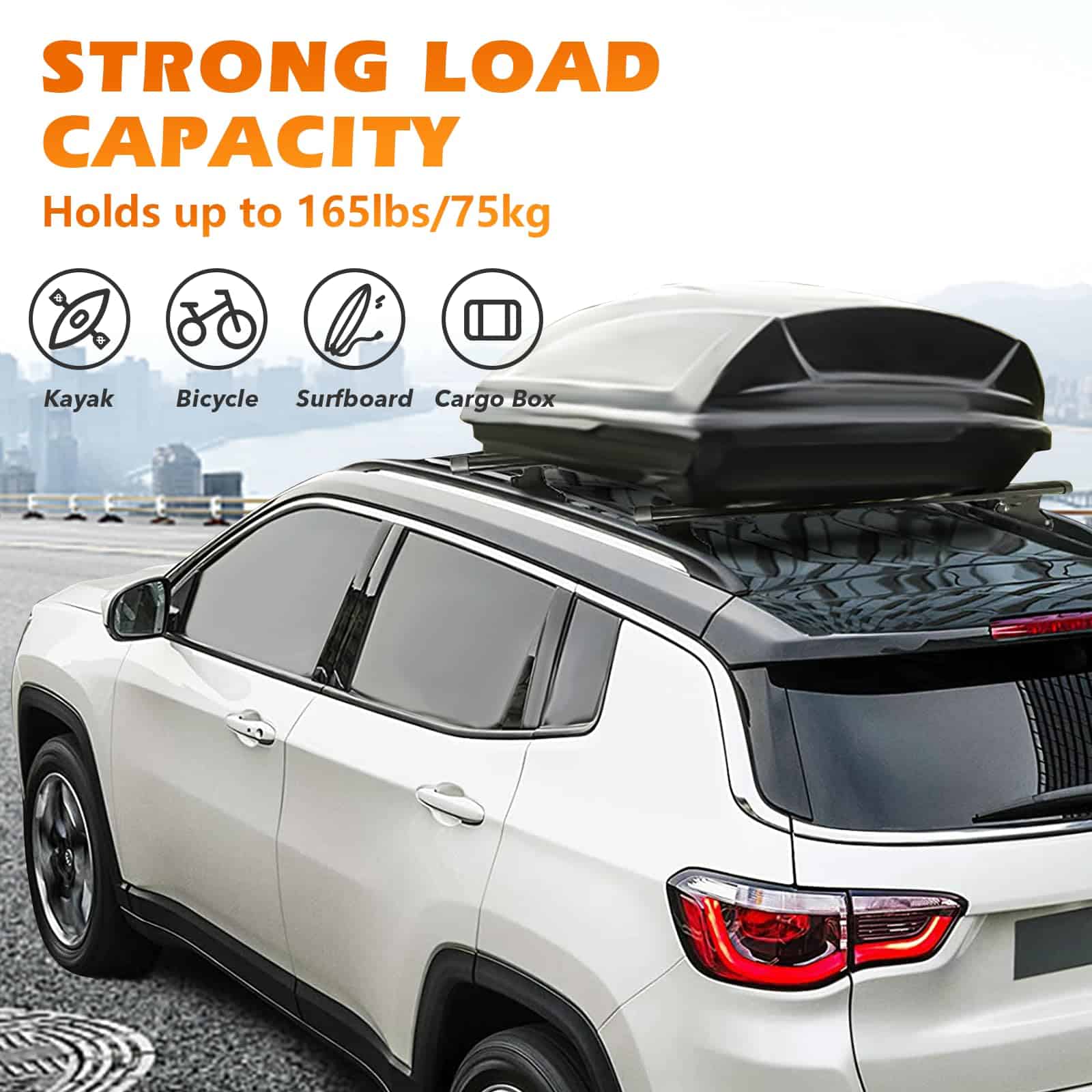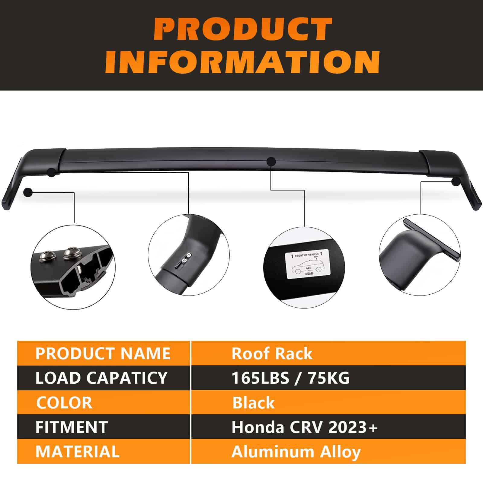 Descripción: Color: Negro Material: Aleación de aluminio Capacidad de carga: 75 kg / 165 lbs Superficie recubierta de pintura negra, resistente al agua y a la corrosión. Fácil de montar y quitar en minutos, no se requiere perforar ni cortar. El hardware de instalación viene con el rack.