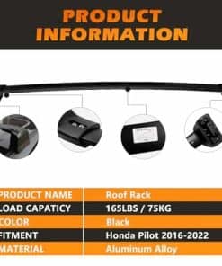 Descripción: Color: Negro Material: Aleación de aluminio Capacidad de carga: 75 kg / 165 lbs Superficie recubierta de pintura negra, impermeable y anticorrosión. Fácil de montar y desmontar en minutos, no se requiere perforación/corte. Hardware de instalación viene con el rack. Ajuste: Ajuste para Honda Pilot 2016 2017 2018 2019 2020 2021 2022 Paquete incluido: 2 x Barras Transversales de Rieles para Techo Hardware necesario incluido (Mostrado en las imágenes)